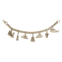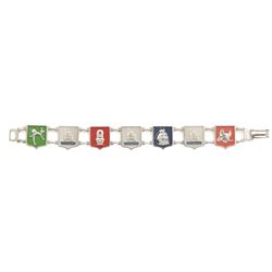 (Disneyland, 1960s) A stylish Disneyland charm bracelet with 7 charms featuring Tinkerbell over a green backing, 3 Silver Castles with blue Disneyland