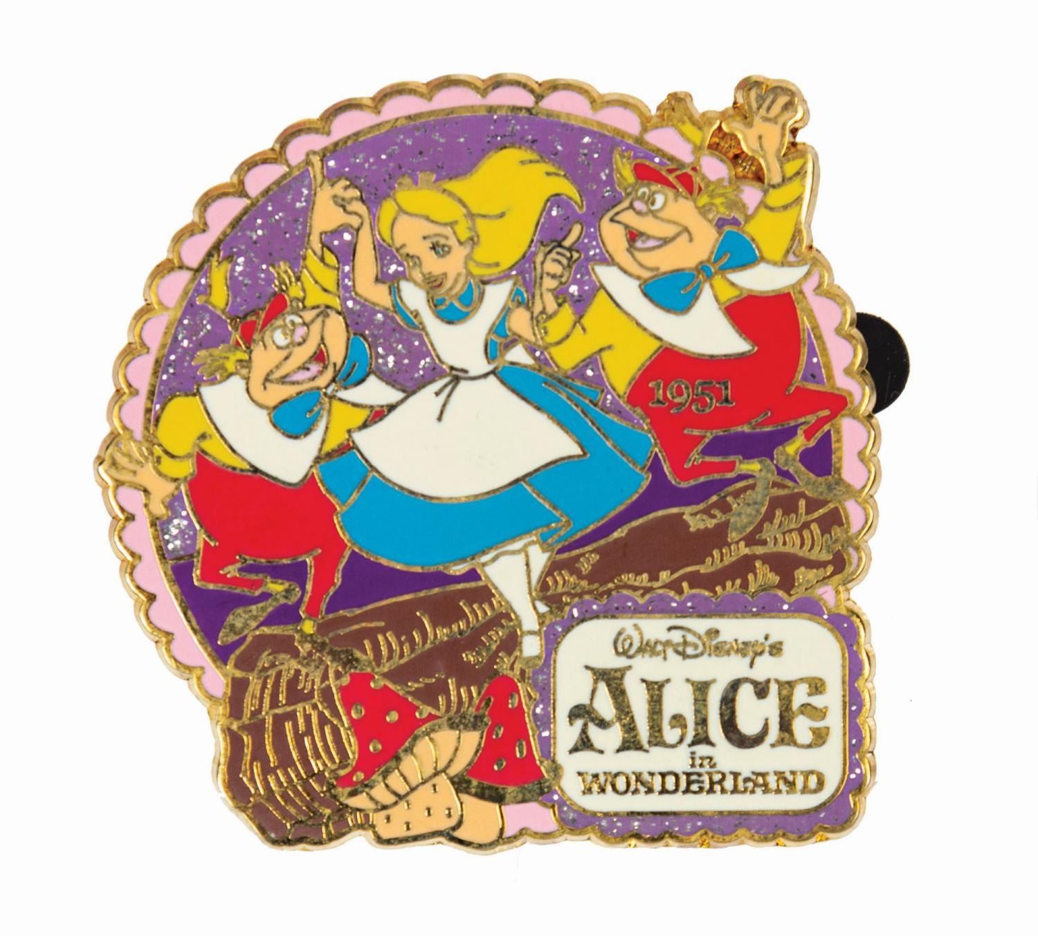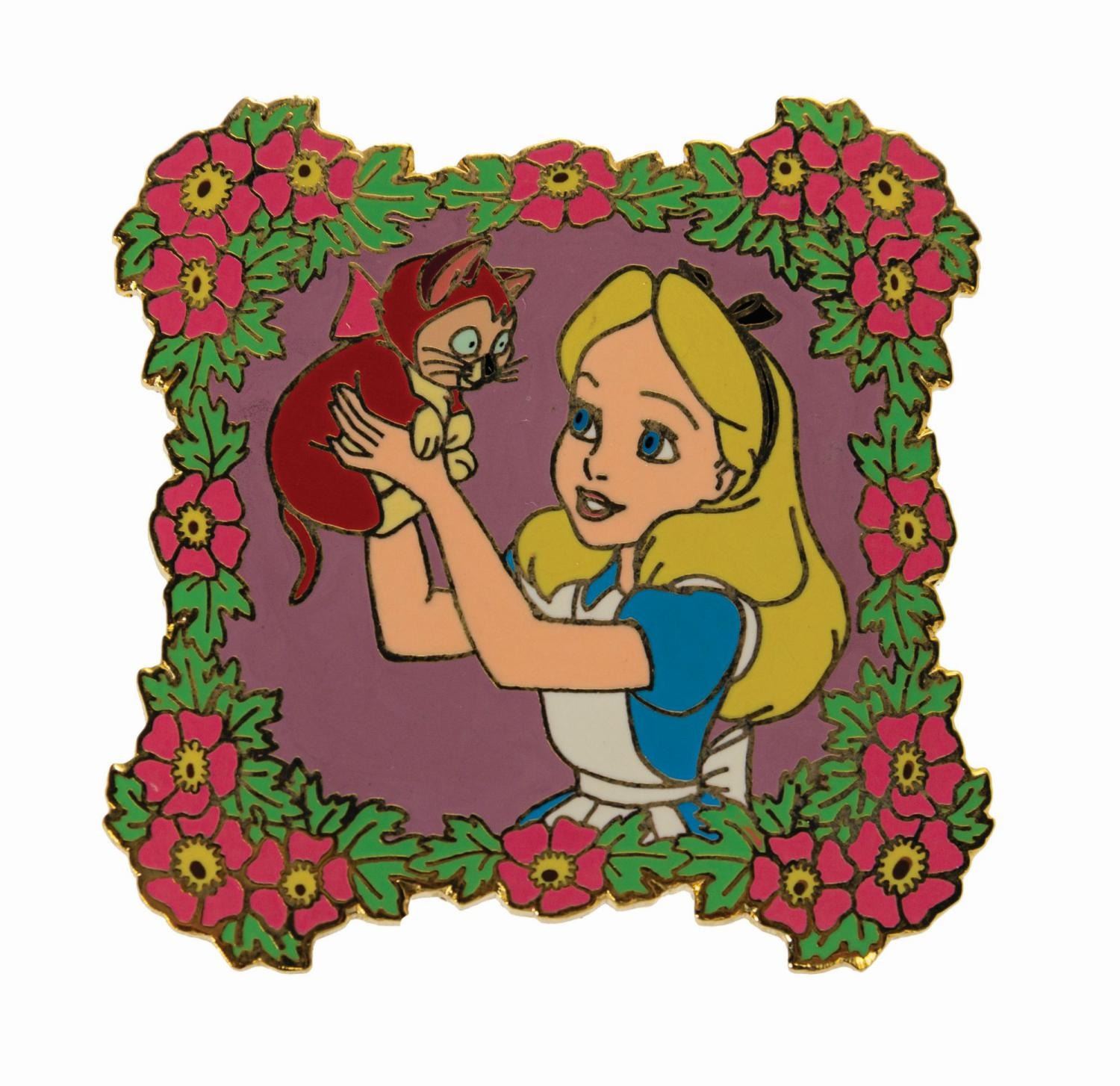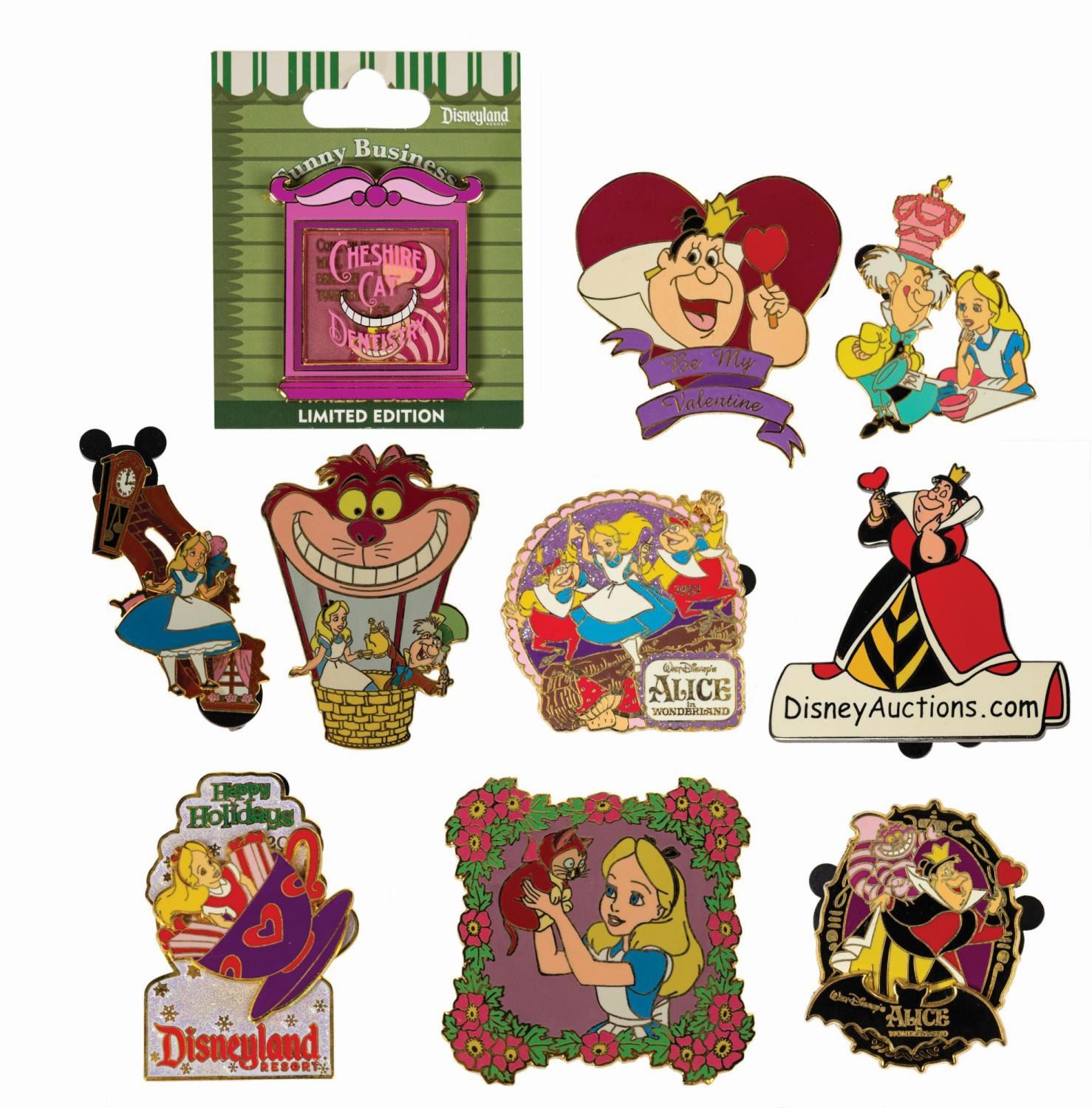 (Disneyland, 2002-14) A collection of (10) Alice in Wonderland limited edition pins. The grouping includes (5) Disney Auctions pins, (2) Mickey & Pals corner shop pins, a Disney Cruise Lines pin, a Disneyland pin, and a Walt Disney World pin. All the pins are from limited edition sets of 1000, and feature characters such as Alice, the Cheshire Cat, the Mad Hatter, the Queen of Hearts, and Tweedle Dee & Tweedle Dum, with scenes related to both the film and the parks. Ranging from 1.75"x1.25" to 2.25"x2.25", the pins are in very good condition with minor surface wear, including some spots of tarnish on the outlines. One of the pins is still on its original backing.