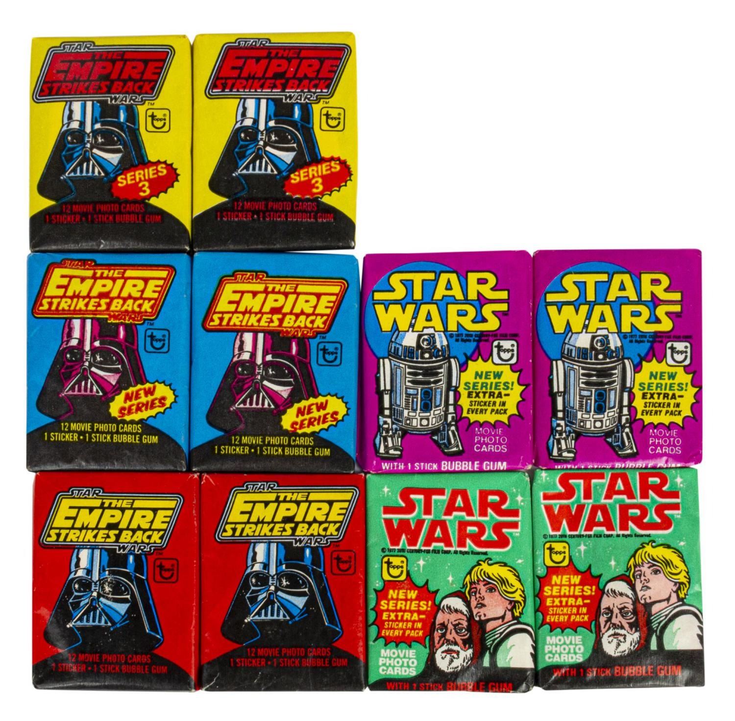 (Topps, 1977/80) A large collection of (10) unopened Star Wars themed movie photo card packs created by Topps. This collection includes (2) Star Wars series 1 packs, (2) Star Wars series 2 packs, (2) The Empire Strikes Back series 1 packs, (2) The Empire Strikes Back series 2 packs, and (2) The Empire Strikes Back series 3 packs. Measuring 3.5"x2.75" each, the packs are in good condition with some wear to the packages from long-term storage.