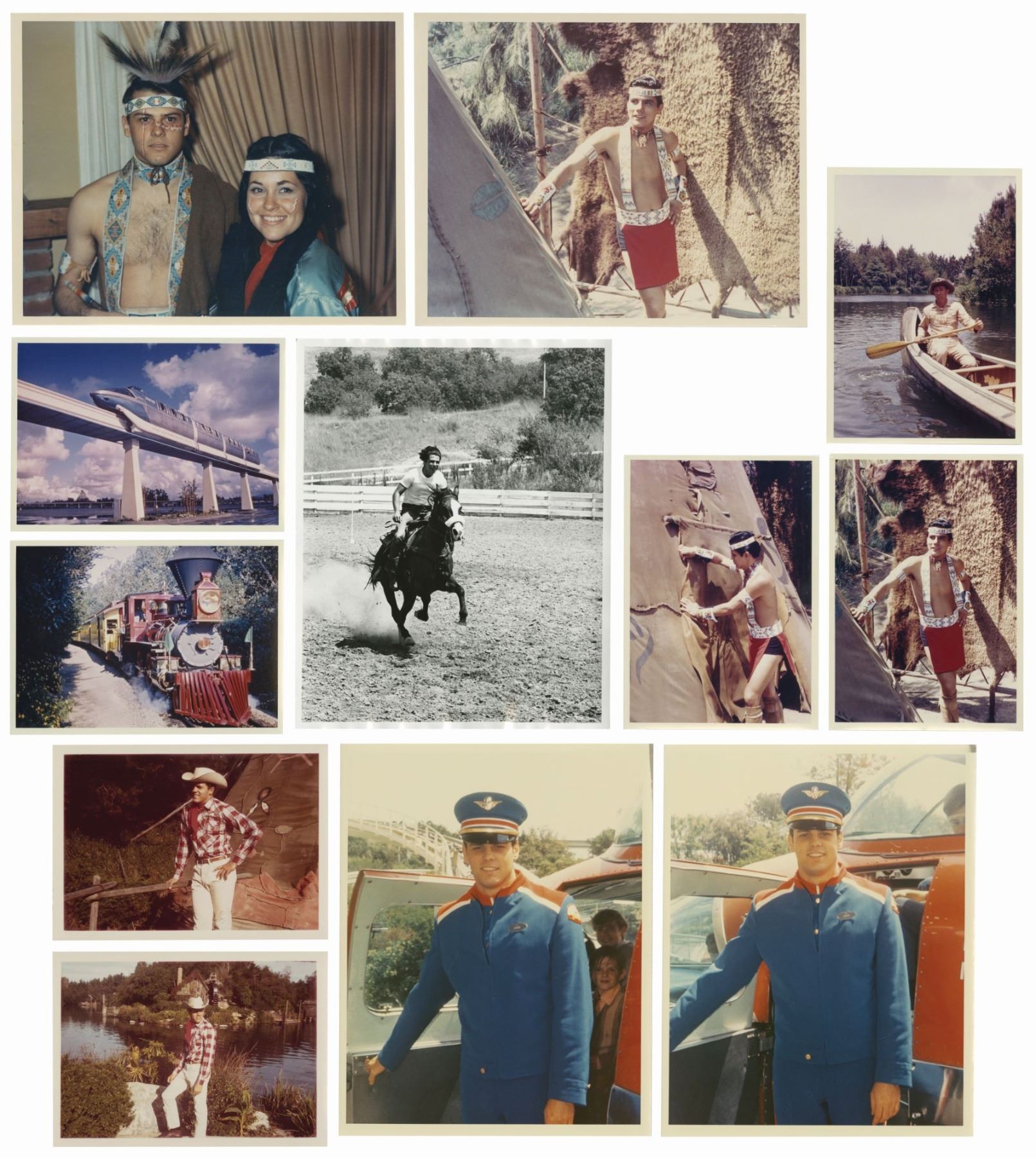 (Disneyland, c.1950s/1960s) A wonderful collection of (12) photos featuring cast members from various Disneyland attractions. The photos come from the estate of Gary Fravel, who helped create the Disney University training program with Van France. It is likely these photos were taken to be used in a cast member training publication. The group includes (4) color photos an Indian Village Dancer on opening day, (2) photos of a Frontierland Cowboy identified as Chris Ridgeway, a photo of a Canoe Pilot identified as Walt Brecker, (2) photos of a 1959 Monorail Pilot, a photo of the Monorail, and a photo of the C.K. Holiday. The photos range in size from 5.5"x7" to 10"x8" and are in very good condition with minor edge-wear.