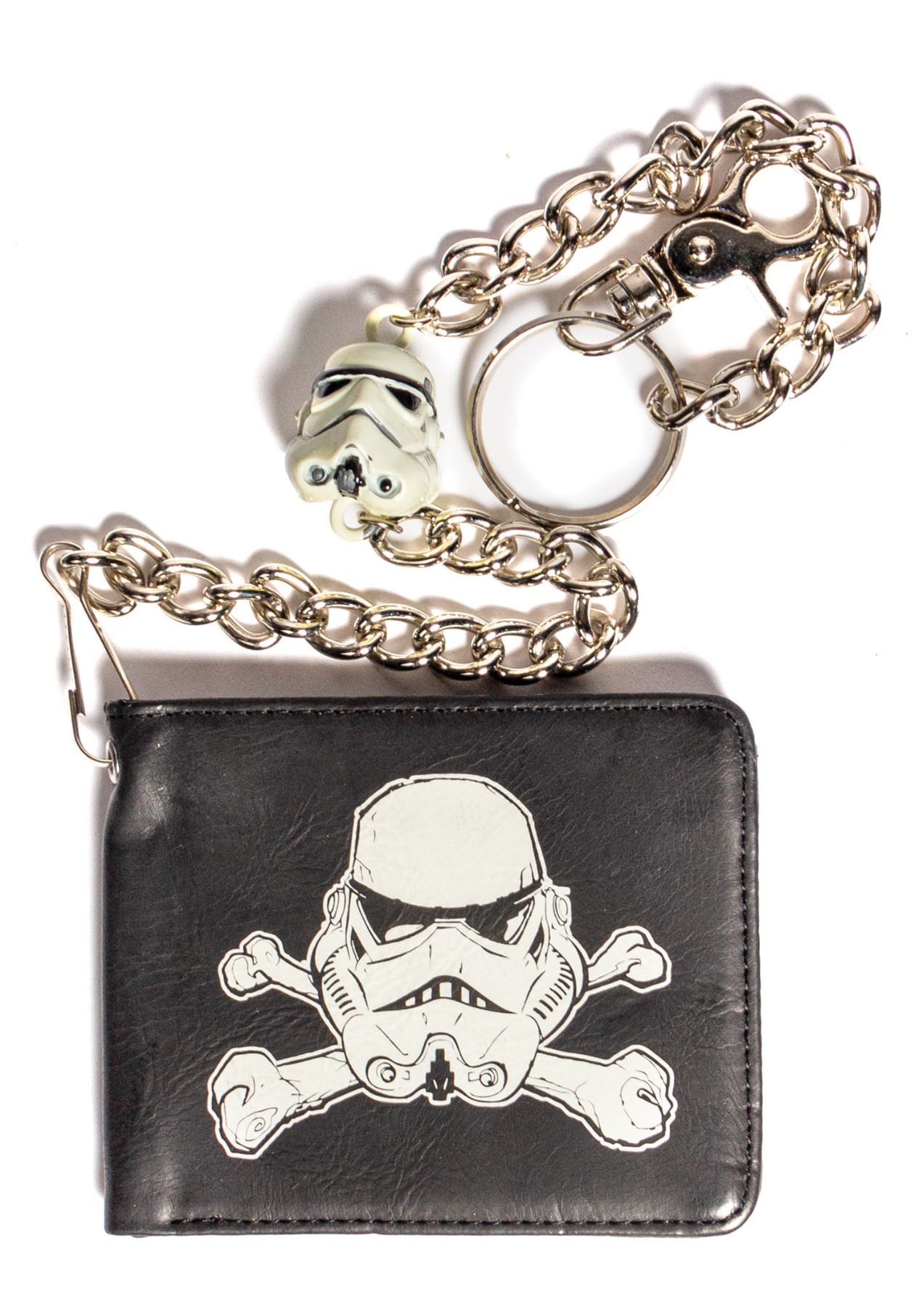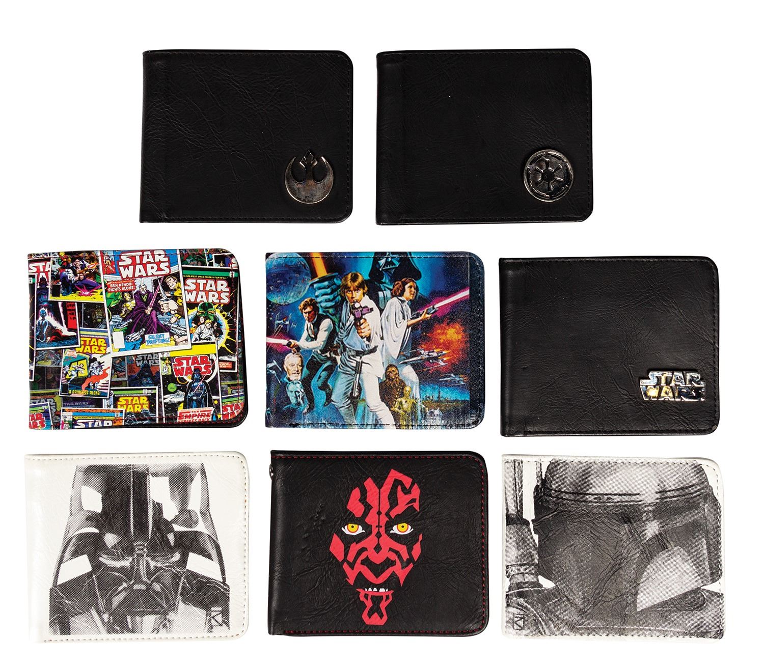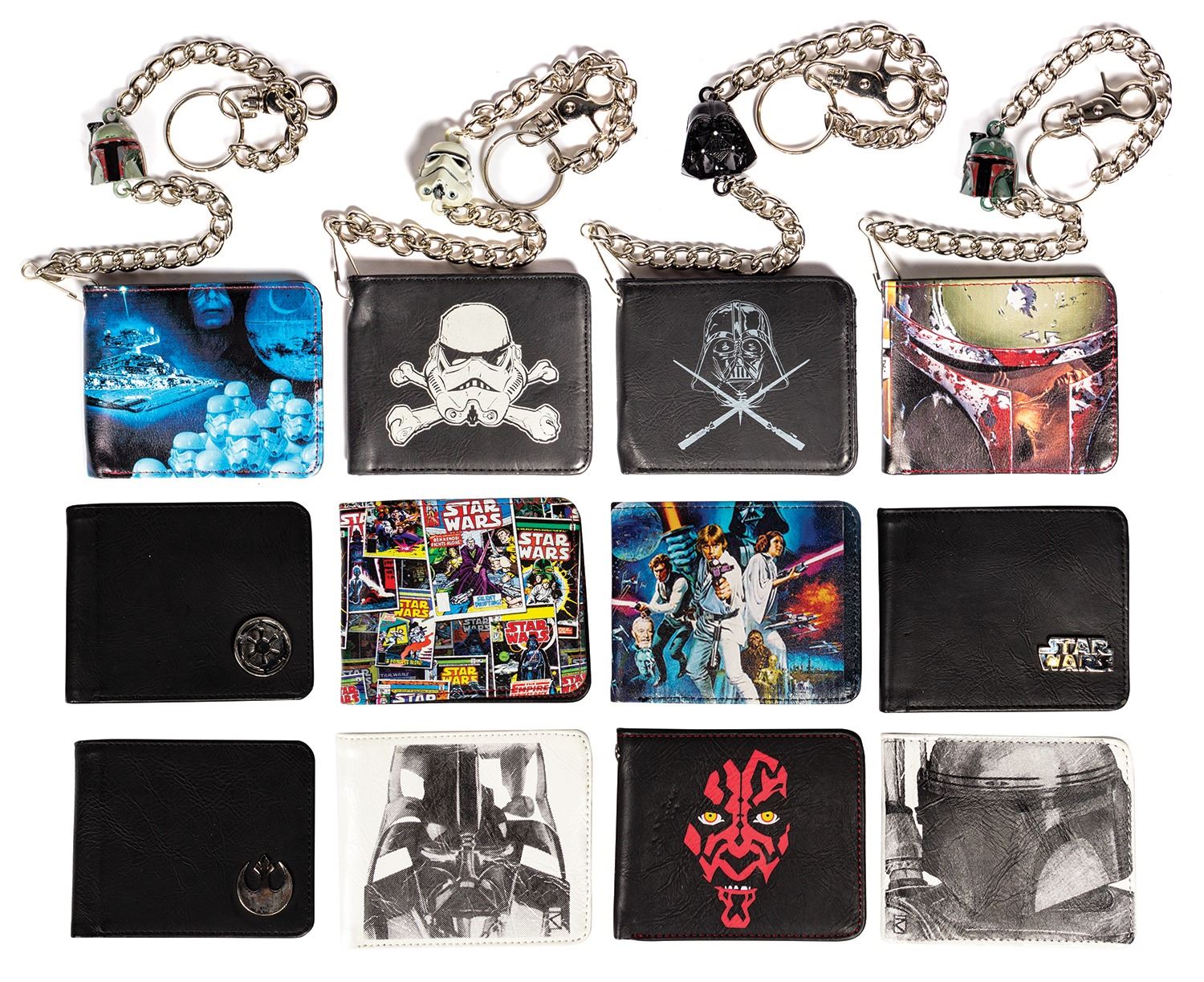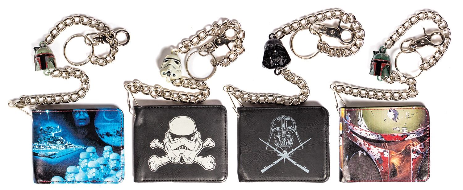 (Lucasfilm, c.2010-11) A collection of (12) production samples for a line of Star Wars wallets that were created by the clothing brand Rock Rebel. The wallets feature imagery of various characters and scenes from the iconic film series. Some of the characters depicted include Boba Fett, Darth Maul, Darth Vader, and Storm Troopers. Four of the wallets have attached chains with figural heads. Each of the wallets measure 3.5"x4.25" when closed and the chains have a length between 18" and 20" long. The condition is very good with minor surface wear.