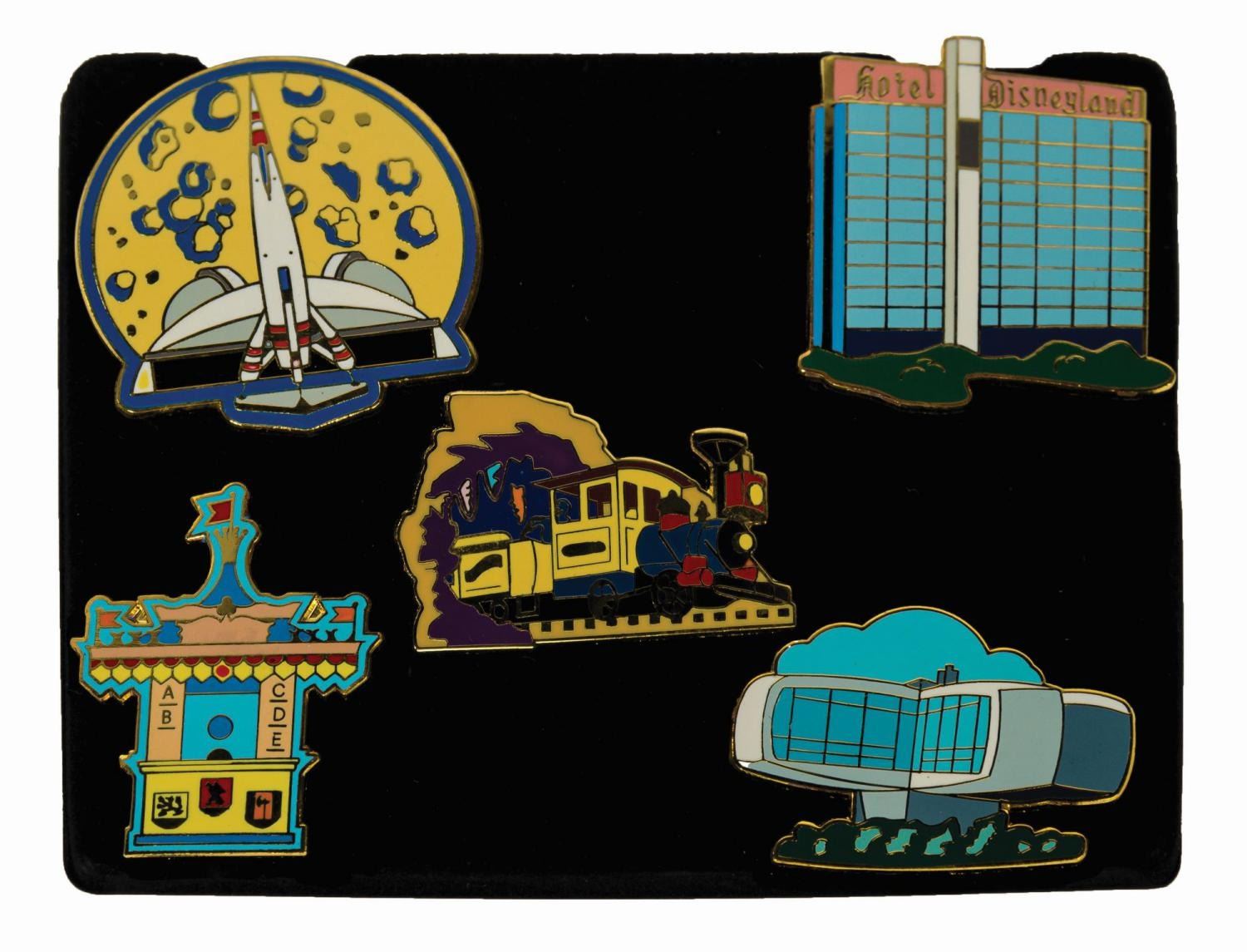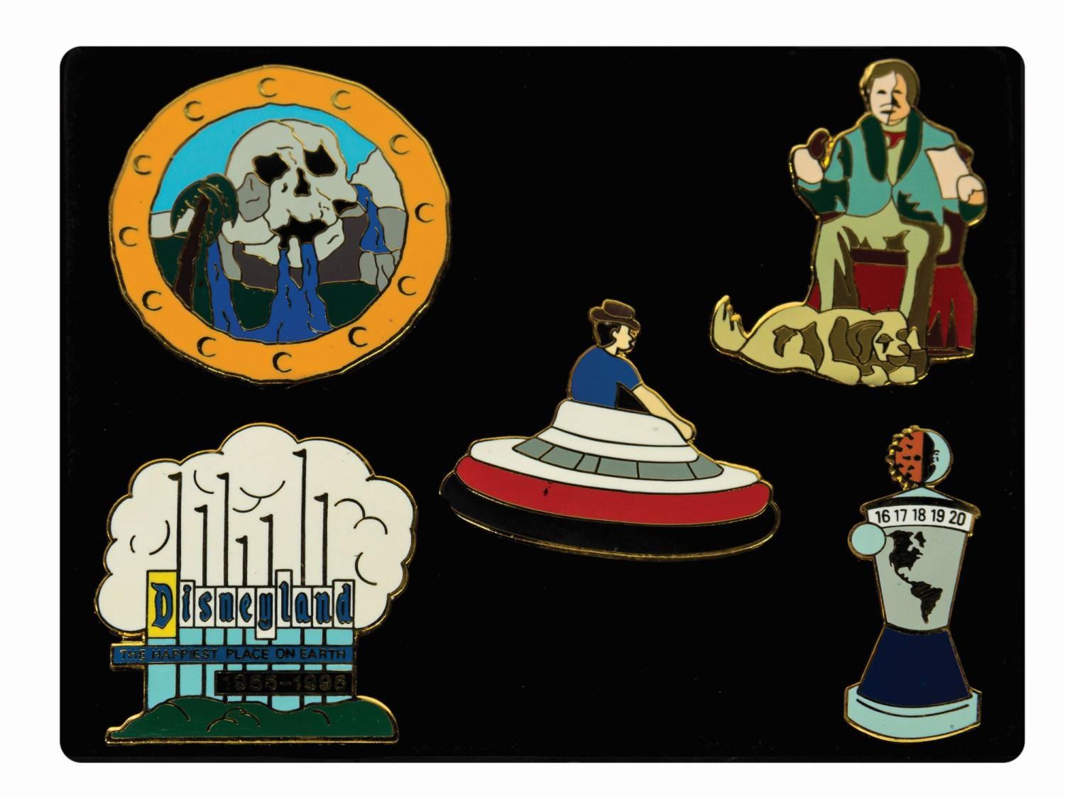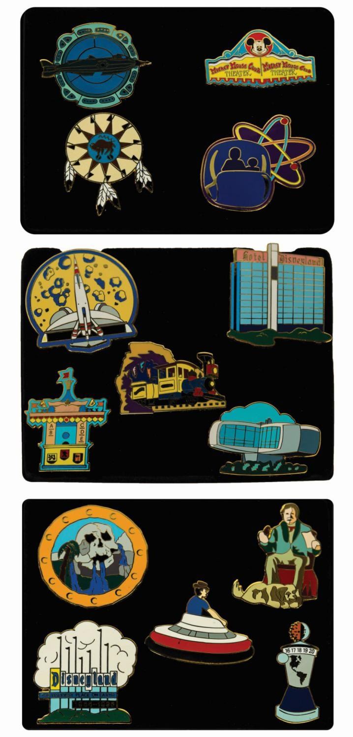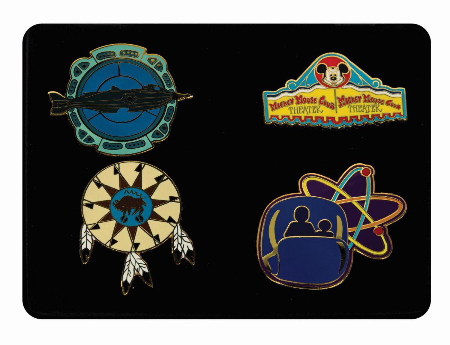 (Disneyland, 1995) A collection of (14) pins offered exclusively to cast members for the 40th anniversary of Disneyland. These pins were sold in (3) sets and celebrate attractions which were no longer at the park. Each set contains description cards with information about the retired attractions. The pins are approximately 1.5"x1.5" with some variation and come in a 3.5"x4.25" case with 4-5 pins each. The condition is very good with minimal wear. The flying saucer pin has 3 small defects to the enamel.