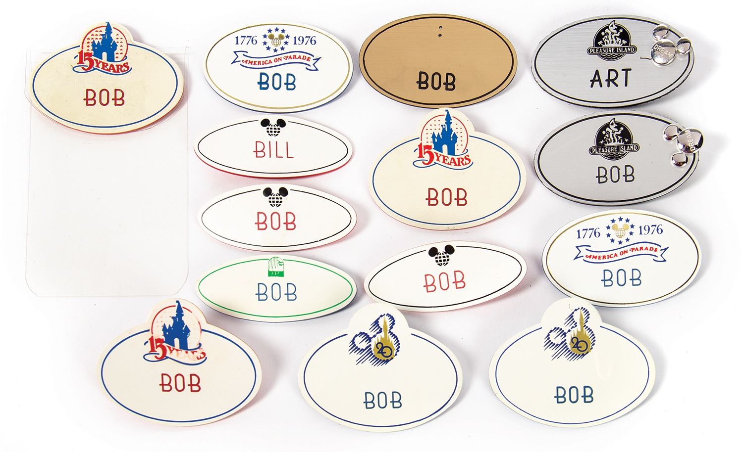 (Walt Disney World, 1970s-90s) A collection of (14) Walt Disney World name tags. These name tags belonged to Bob Phelps of Walt Disney World's costuming department. The name tags were used during various events throughout the park's history, such as the 15th and 20th anniversaries, America on Parade, as well as badges for Pleasure Island. The badges measure between 1"x2.5" and 2"x2.5". The condition is good overall with minor surface wear.
