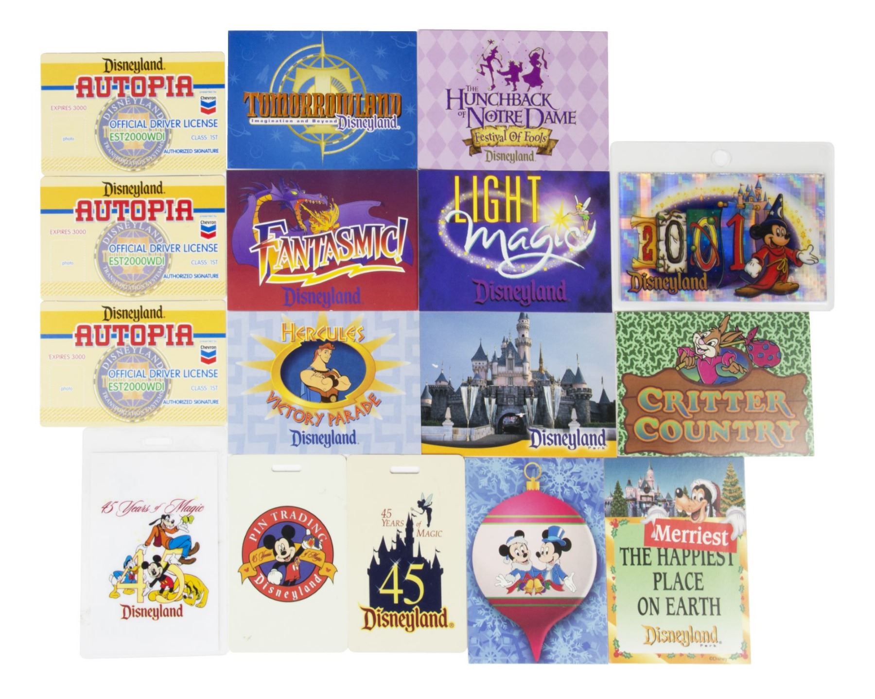 (Disneyland, 1990s-2000s) A collection of (16) cards from Disneyland. The cards include (9) cast member information cards with facts about various parades and lands of the park on the back sides, (3) unused "Autopia" driver's licenses, and (4) lanyard cards for pin trading, Disneyland's 45th Anniversary, and more. The cards range in size from 3.4"x2.2" to 4"x3", and the condition is very good overall with some wear from use.