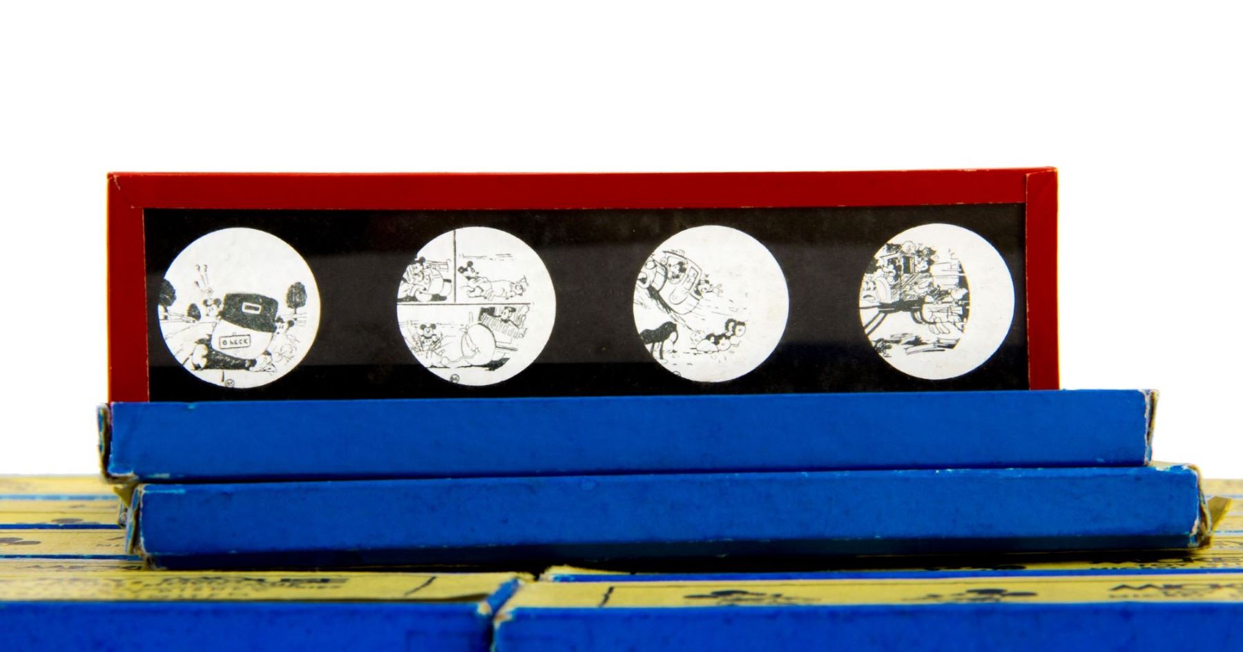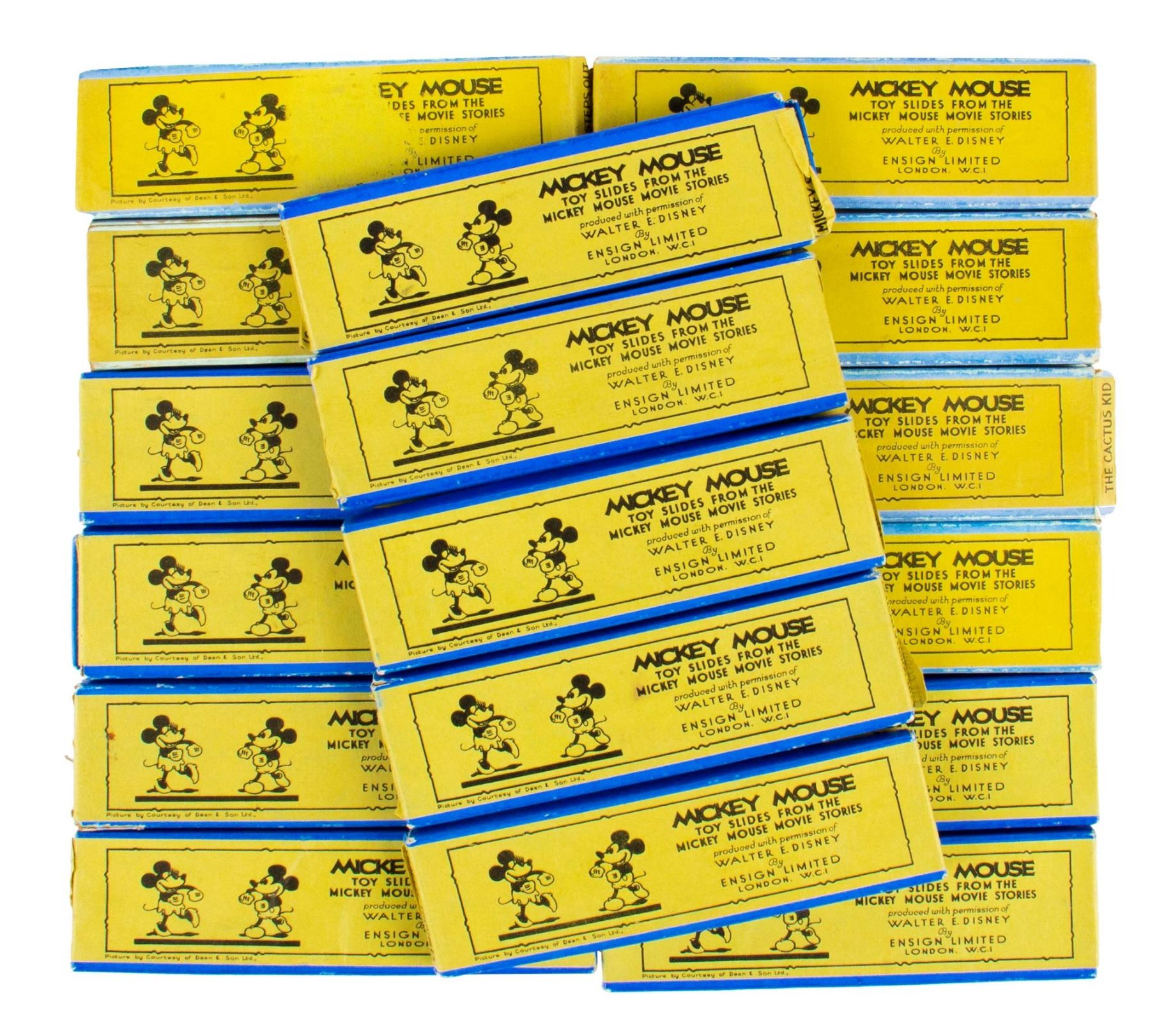 (Ensign Limited, c.1930s) A collection of 17 boxes of Mickey Mouse toy lantern slides to be used in magic lanterns, an early form of projector. Each box contains 2 plates with 4 individual images from various Mickey Mouse cartoons. This grouping includes 11 unique boxes of slides and 6 duplicates. The boxes each measure 1.75"x5.5" and the set is in overall good condition with varying amounts of wear from use.