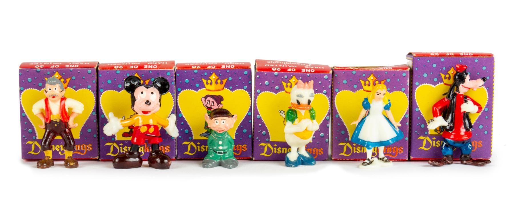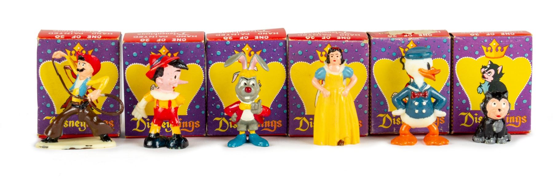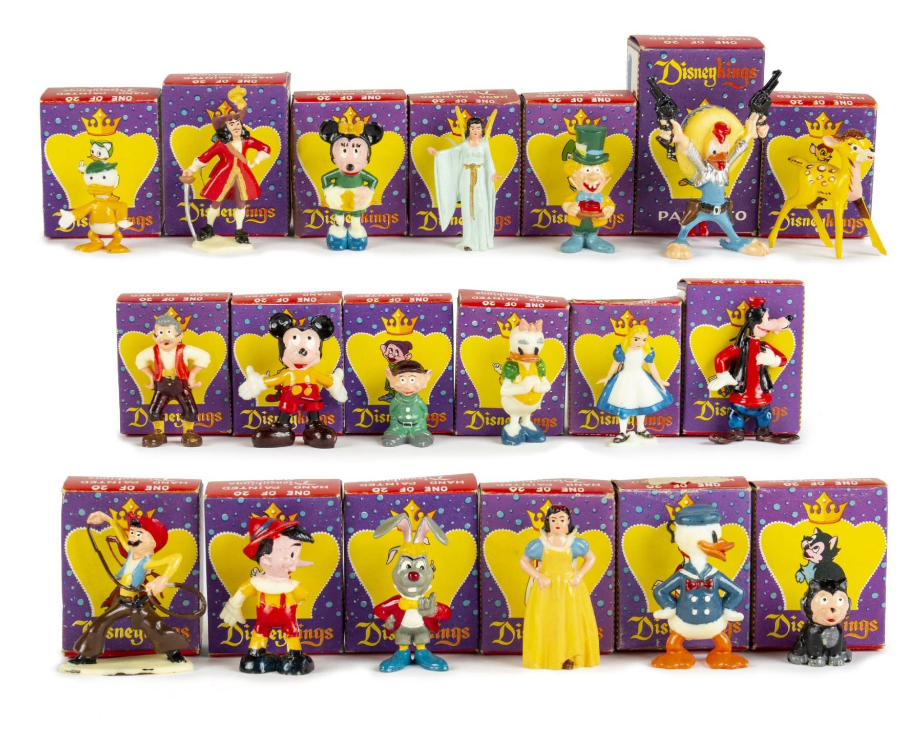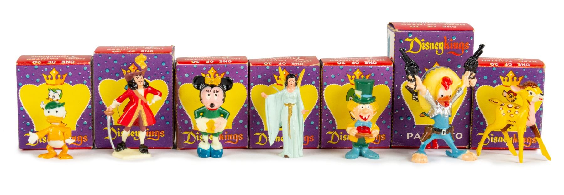 (Marx, 1961) A very rare collection of (19) hand-painted Disneykings figures in their original sales boxes. These "Disneykings" were advertised as deluxe king-size versions of the popular Disneykins figures, and this collection contains a wonderful assortment of iconic Walt Disney characters. Each figure comes in its original colorful Marx Toys box. Most of the boxes measure 2.25" tall except for Captain Hook and Goofy which measure 2.5" tall, and Panchito which measures 3" tall. The condition is very fine overall with minor wear to the boxes.