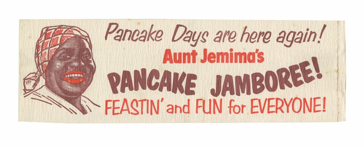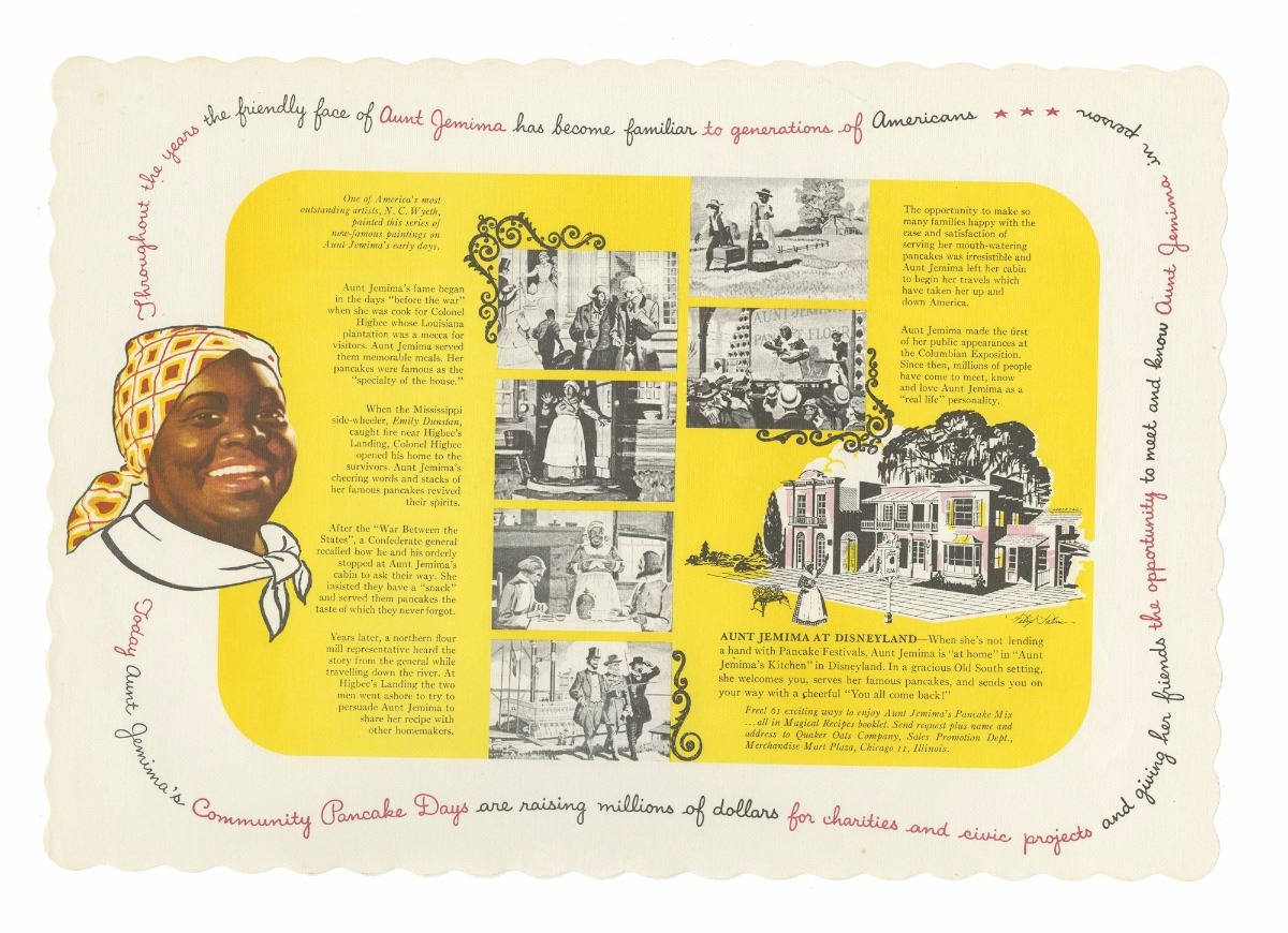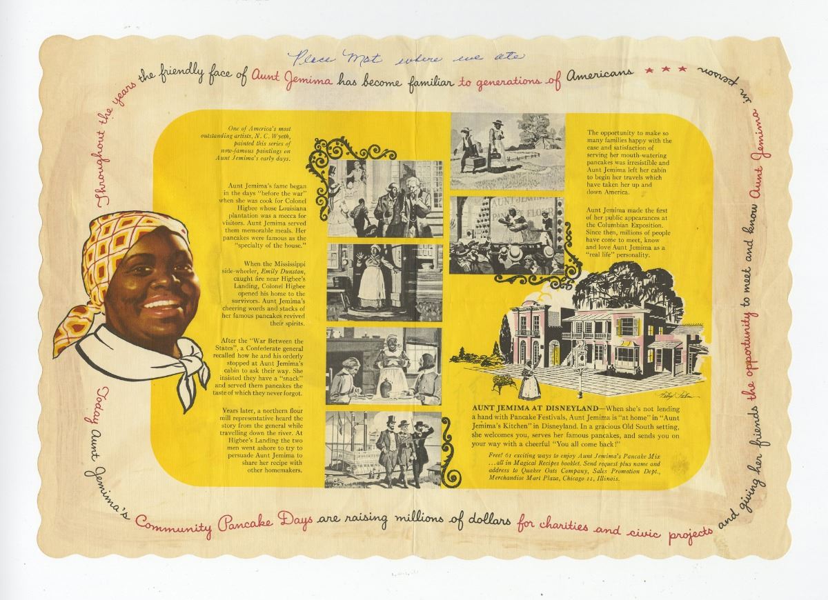 (Disneyland, 1950s) Collection of (3) paper placemats and (1) paper cook's hat from Aunt Jemima's Kitchen. Placemats measure 9.75"x14" and hat measures 3.5"x11", still folded. Set is in good condition with minor spots of staining and wear. One placemat has writing on it.