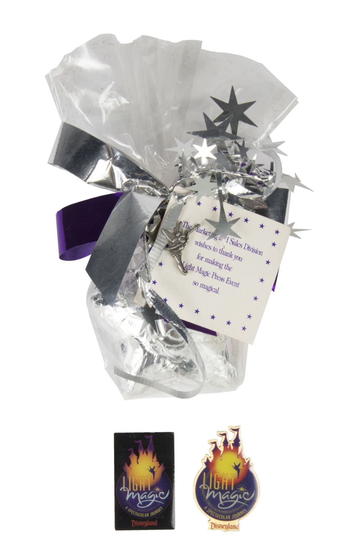 (Disneyland, 1997) A rare pin set from Disneyland's "Light Magic" parade in 1997. The set includes a star-shaped chocolate candy with a Tinker Bell pin that was given to attendees of the "Light Magic Press Event". Additionally, the set includes two color "Light Magic" pins with imagery of Tinker Bell & Sleeping Beauty Castle. The Tinker Bell pin measures 0.75"x0.75" and the color pins measure approximately 1.5"x1". The condition of the pins is very good, but the chocolate bar is showing signs of wear and age.