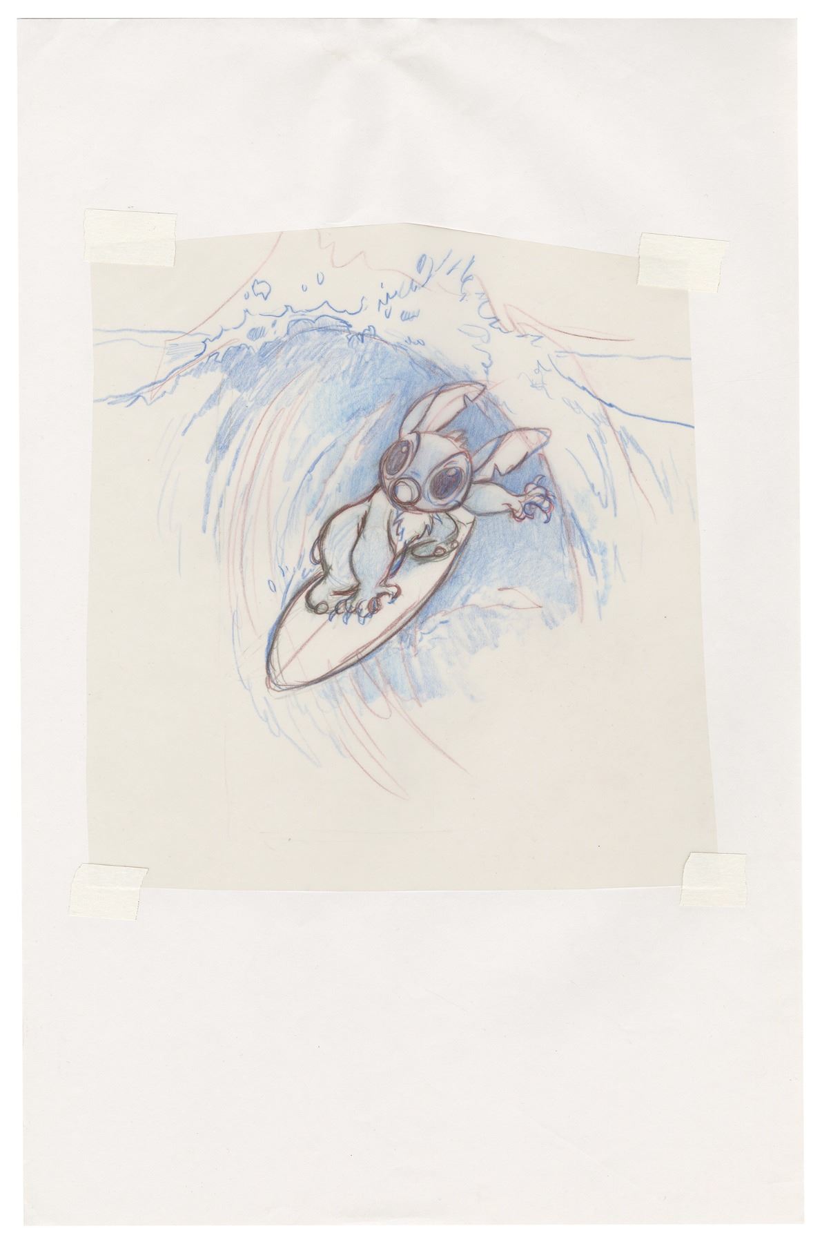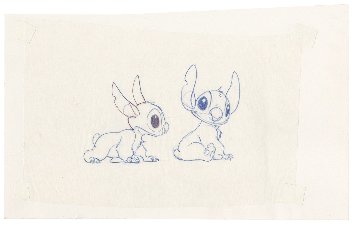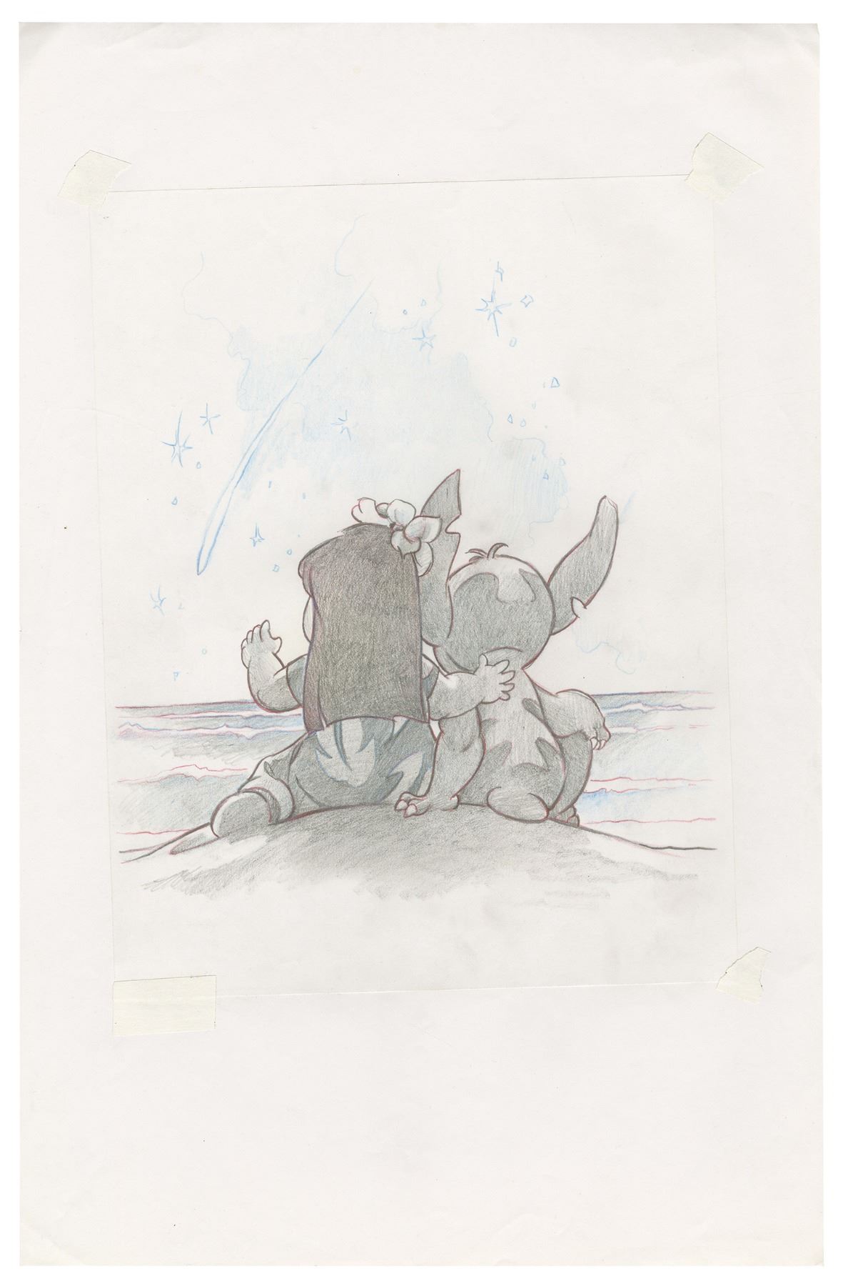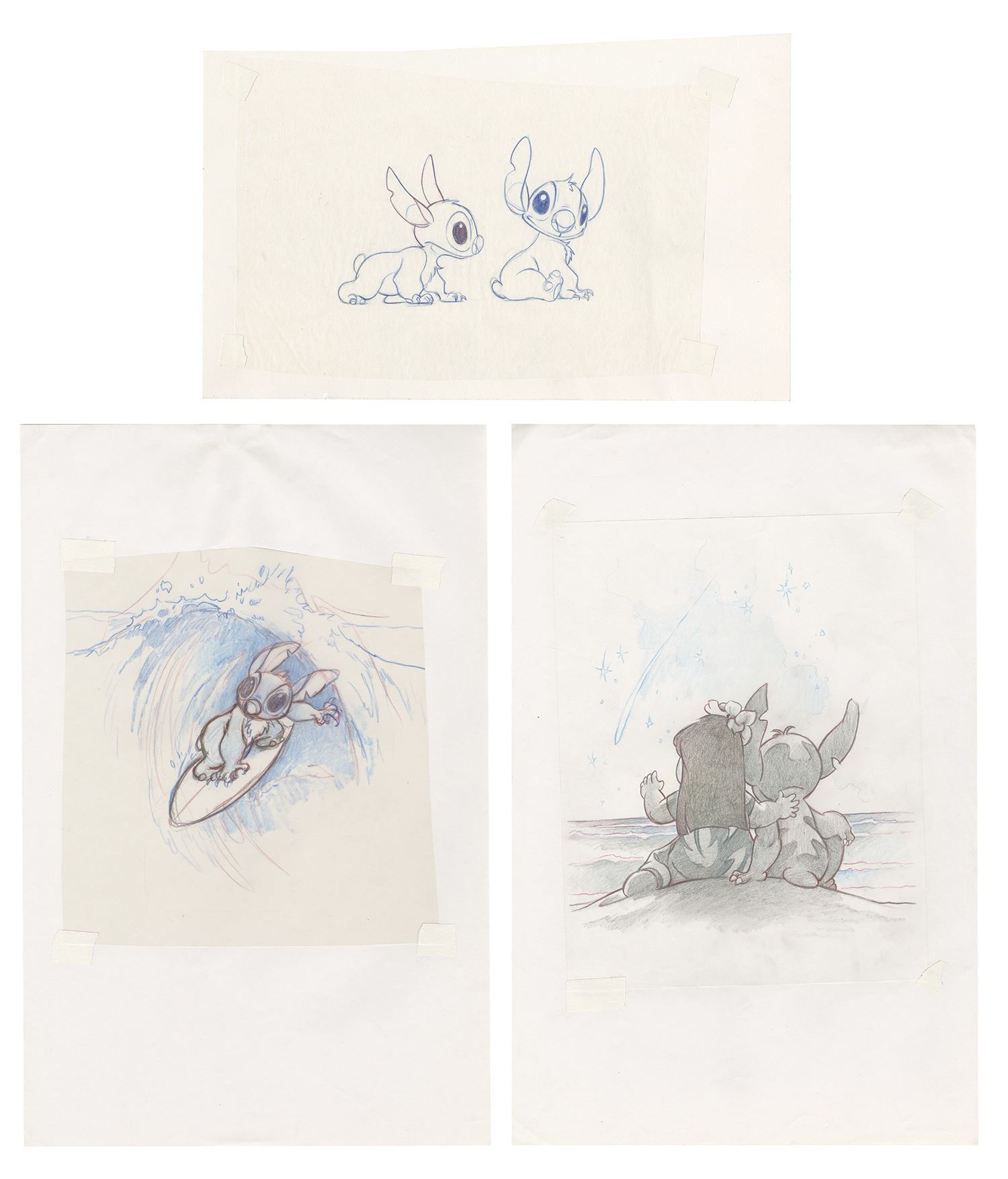(Disney, 2002) A collection of (3) drawings created for Lilo and Stitch. The artwork is believed to have been created for posters or other promotional materials for the theatrical release of the film. Depicting both Lilo and Stitch in wonderful poses, these drawings are accomplished in blue, red, and black pencils on vellum sheets. The sheets are adhered to larger sheets of paper that measure between 8"x14" and 11"x17". The condition is very good with minor edge wear.