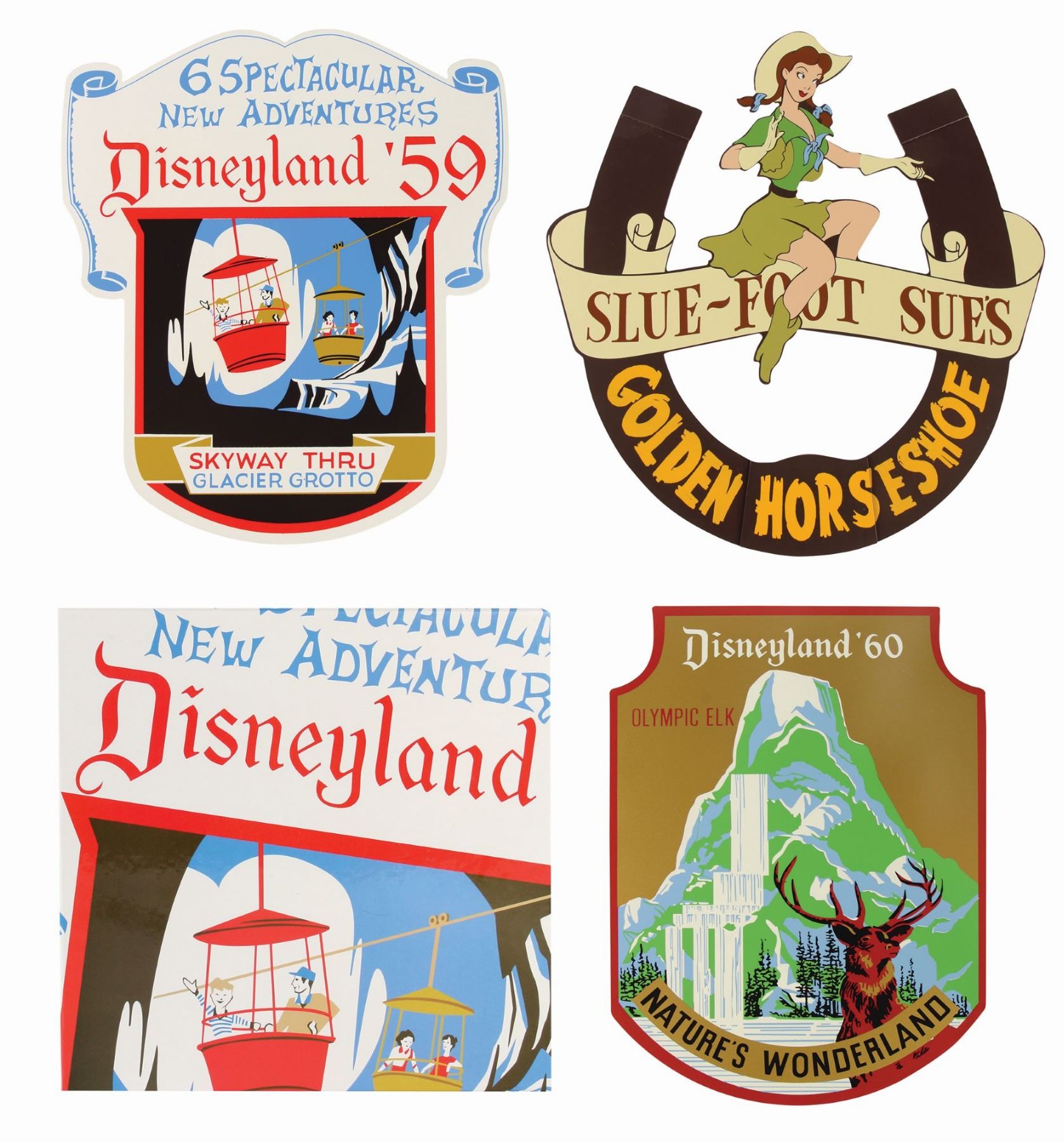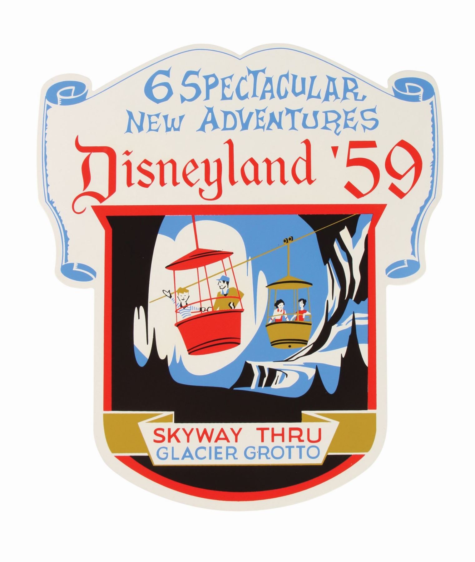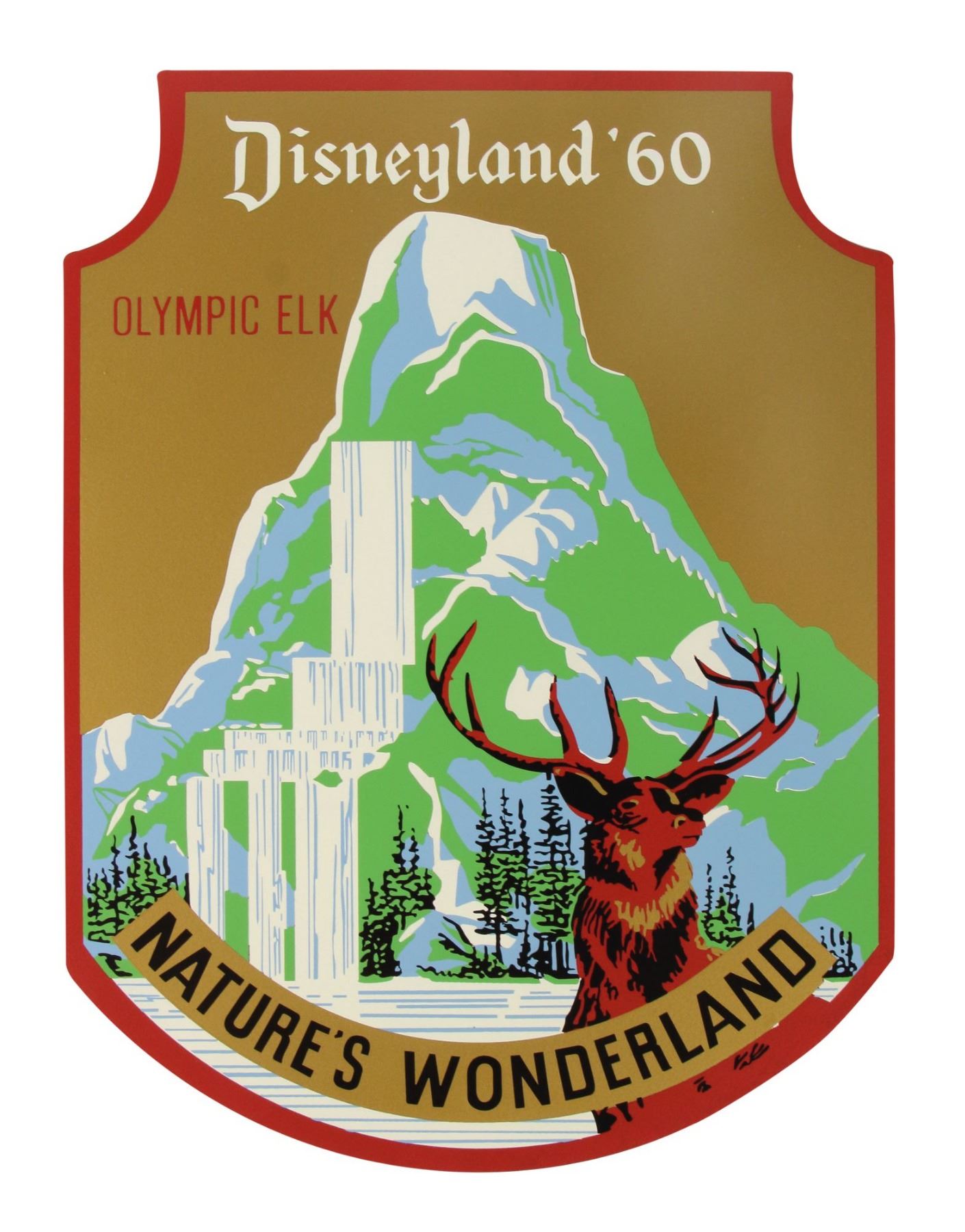 (Disneyland, 2005) A very rare boxed set of (3) attraction shields created by Kevin Kidney and Jody Daily to commemorate Disneyland's 50th Anniversary. These limited edition shields were produced in an edition of 1955 and feature the "Skyway", "Nature's Wonderland", and "Golden Horseshoe". The shields come in their original decorative box, and each one lists information about the anniversary and edition amounts on the back sides. Each piece measures approximately 10"x10", and the set is in very good condition with little wear.