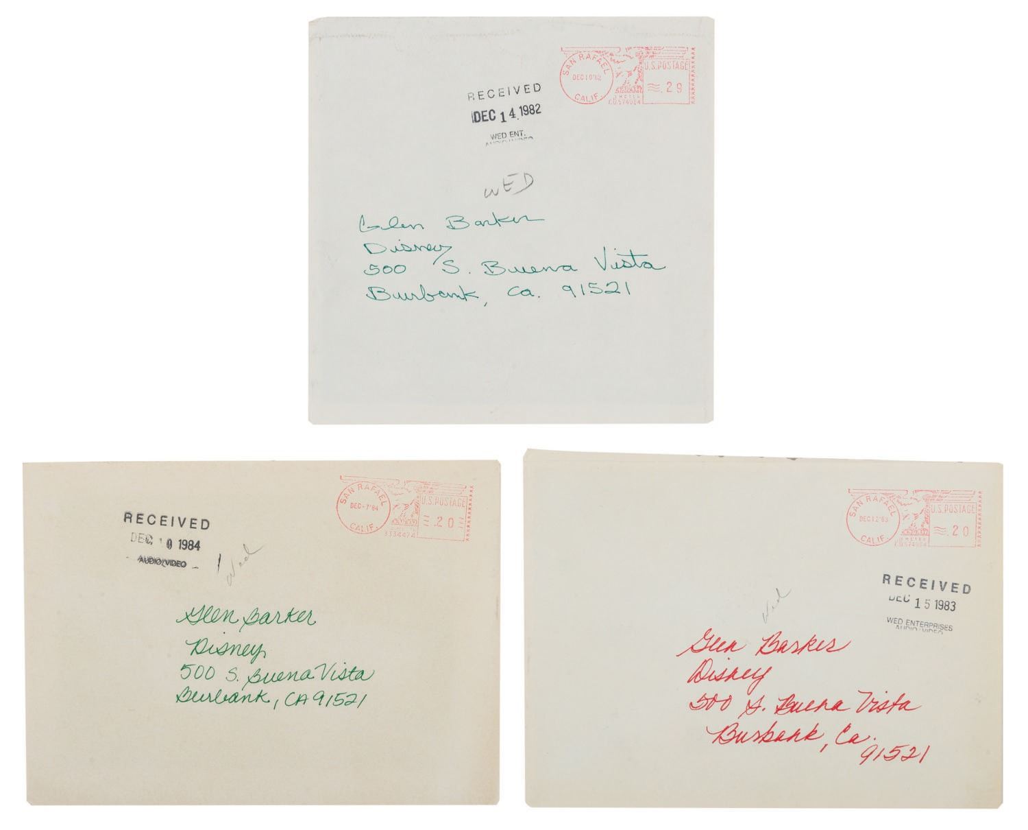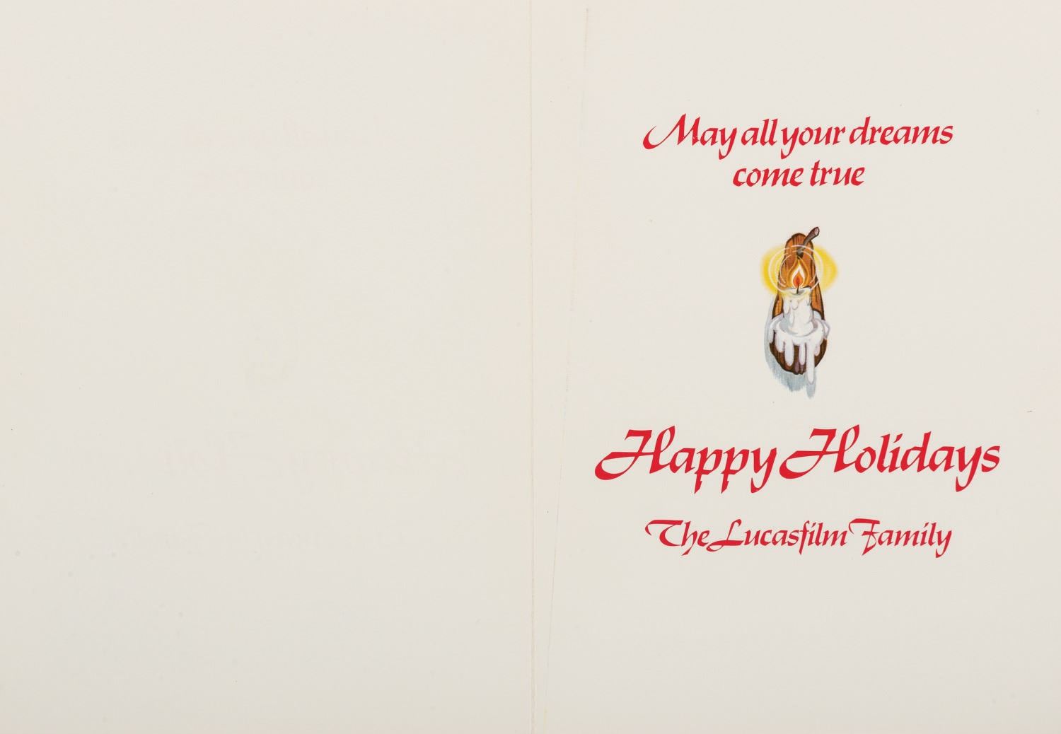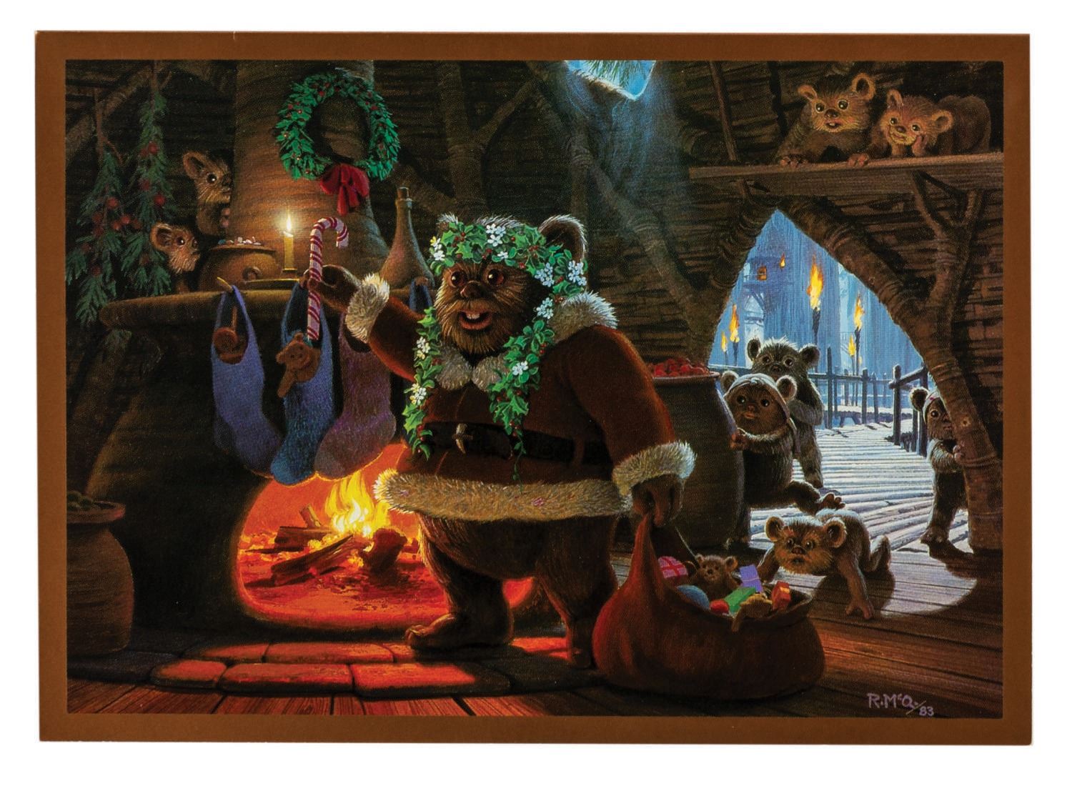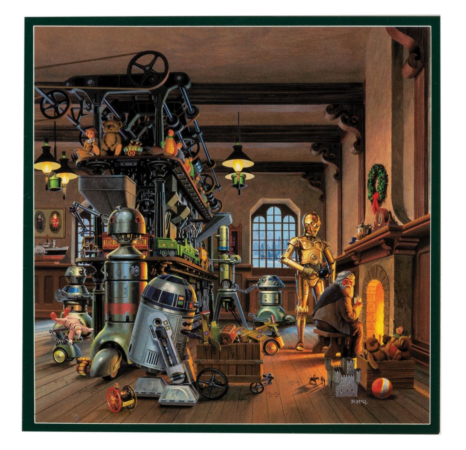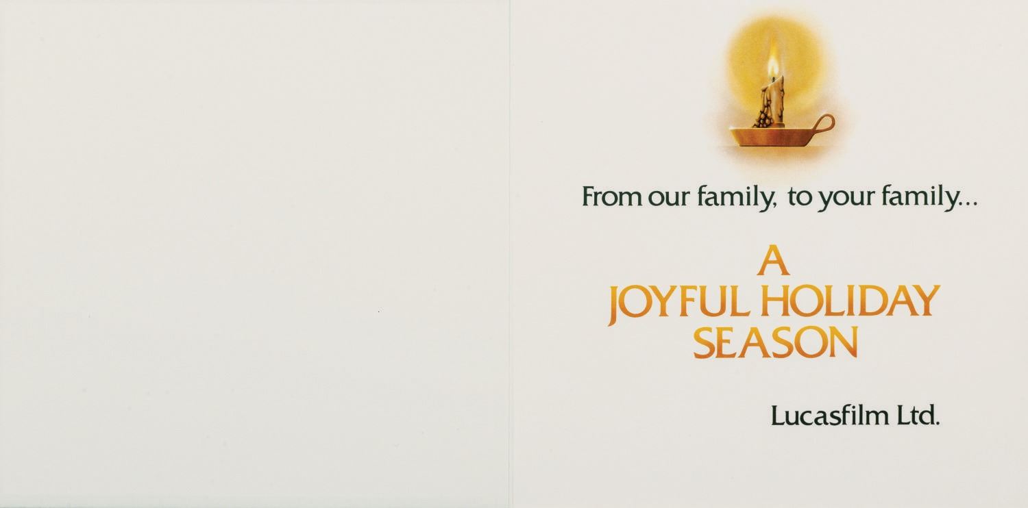 (Lucasfilm, 1982-84) A collection of (3) winter holiday season greeting cards featuring popular characters from the original Star Wars trilogy. Among the artwork are C-3PO, R2-D2, the droid helpers of Santa's Workshop, and the Ewok residents of Endor in various Christmas-inspired scenes. Measuring 6.25"x6.25" and 5.25"x7.25" the cards and envelopes are in very good condition.