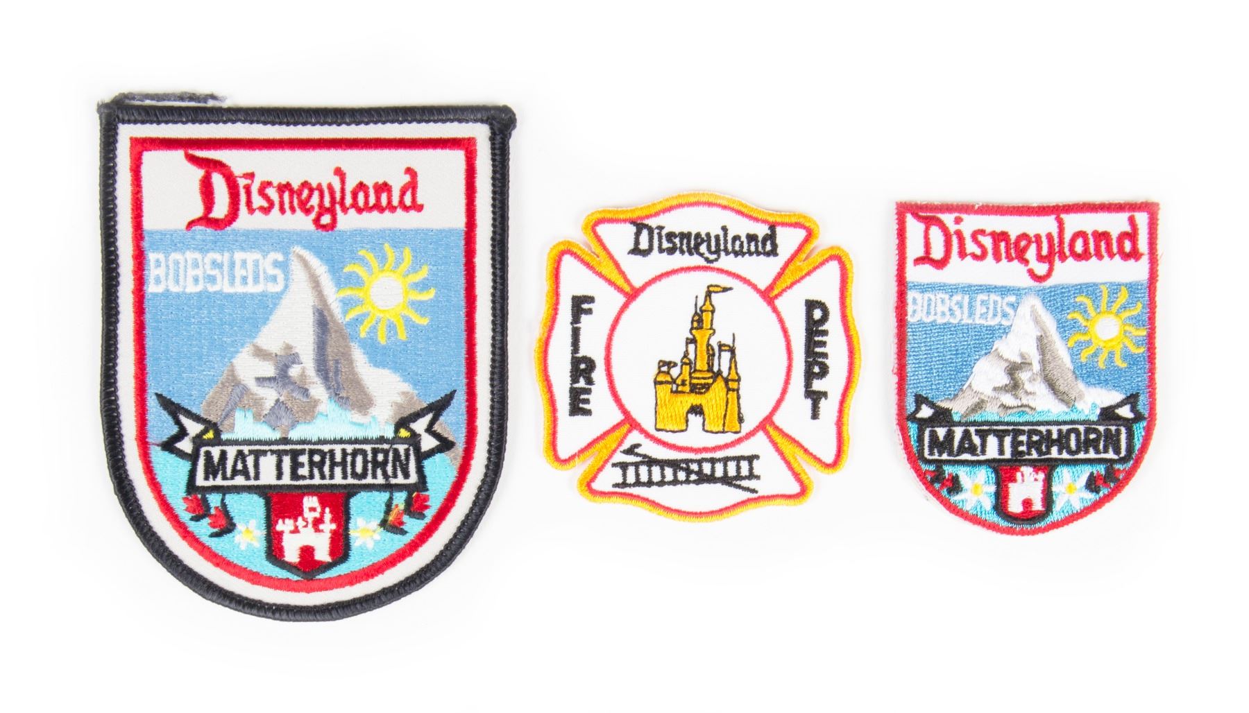 (Disneyland, c.1980s) A collection of (3) Disneyland patches from the "Matterhorn Bobsleds" and Disneyland Fire Department. The patches include two variant sizes for the Matterhorn, and one Castle logo Fire Department patch. The patches range in size between 2.5"x2" to 3.75"x3", and the condition is very good overall. The patches all appear to be unused.