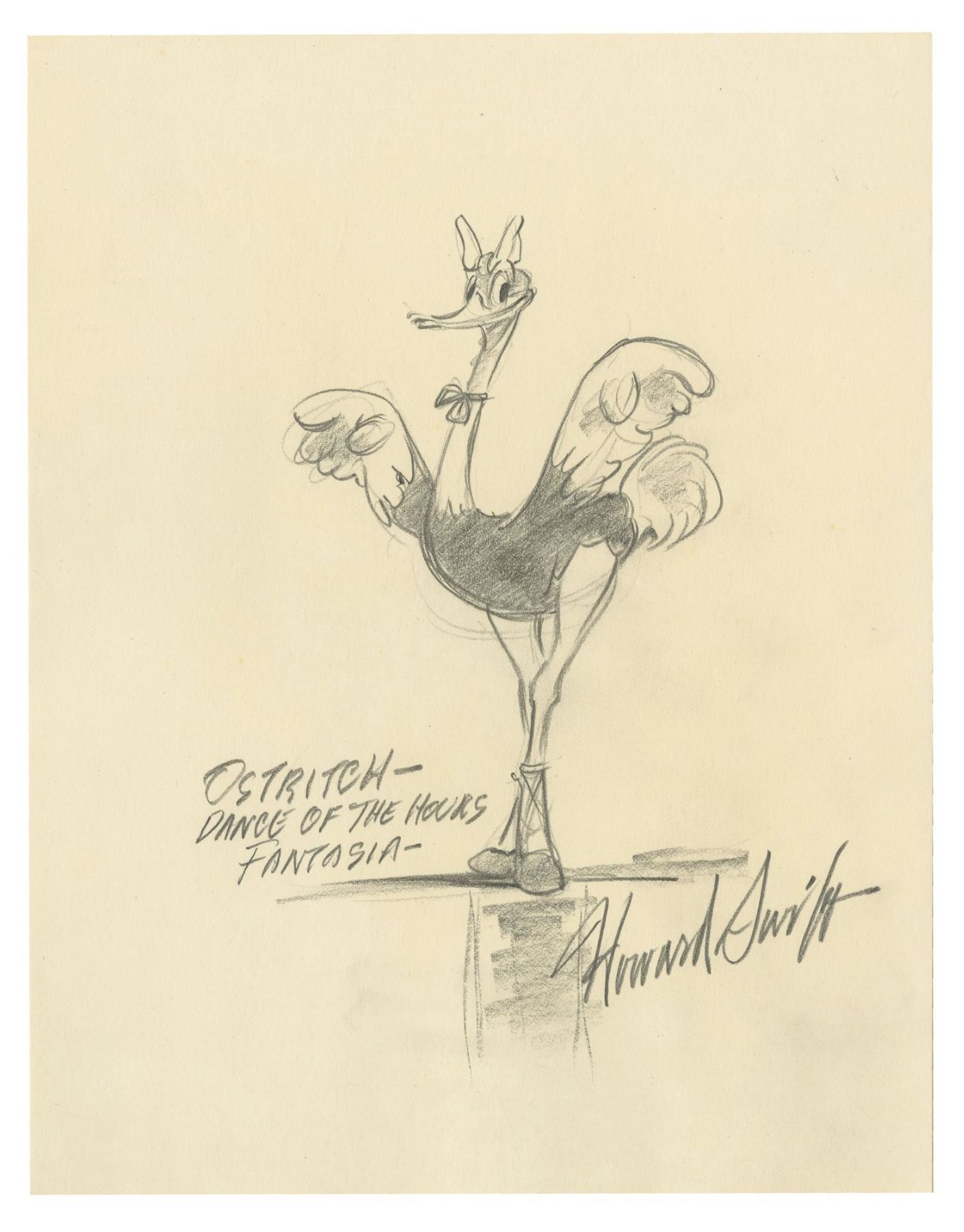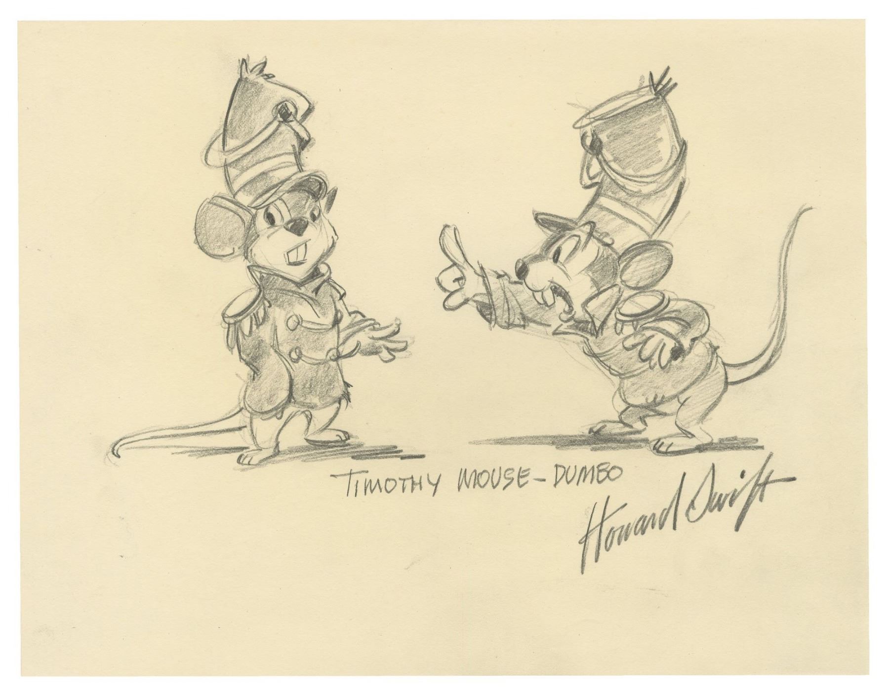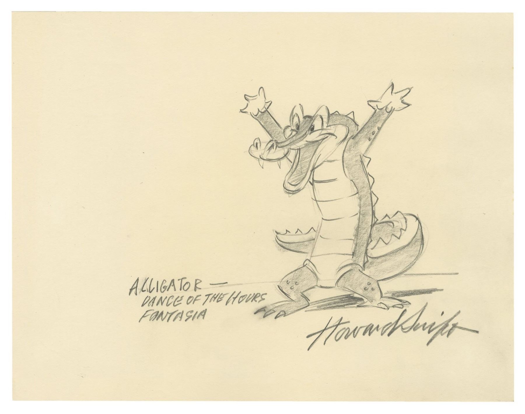 (Walt Disney Studios, c.1980) A collection of (3) original drawings by Howard Swift including Timothy Mouse from Dumbo, as well as an Alligator and an Ostrich from the Dance of the Hours segment of Fantasia. Swift worked as an animator on both of these films. Created in pencil on art paper, the drawings measure 8.5"x11" and are in very good condition. Swift signed the bottom-right corner of each drawing.