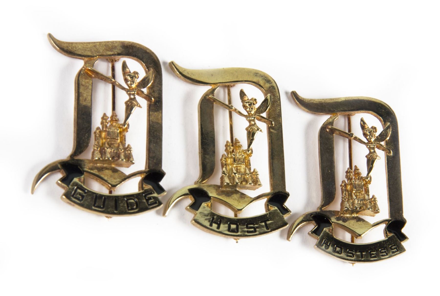 (Disneyland, c.1990s-2000s) A collection of (3) collector-made replica cast member pins featuring the Disneyland "D" with Tinker Bell. These pins pay homage to the popular cast member pins and are marked for Guide, Host, and Hostess. Measuring 2.25"x1.5" each, the pins are in good condition with minor wear.