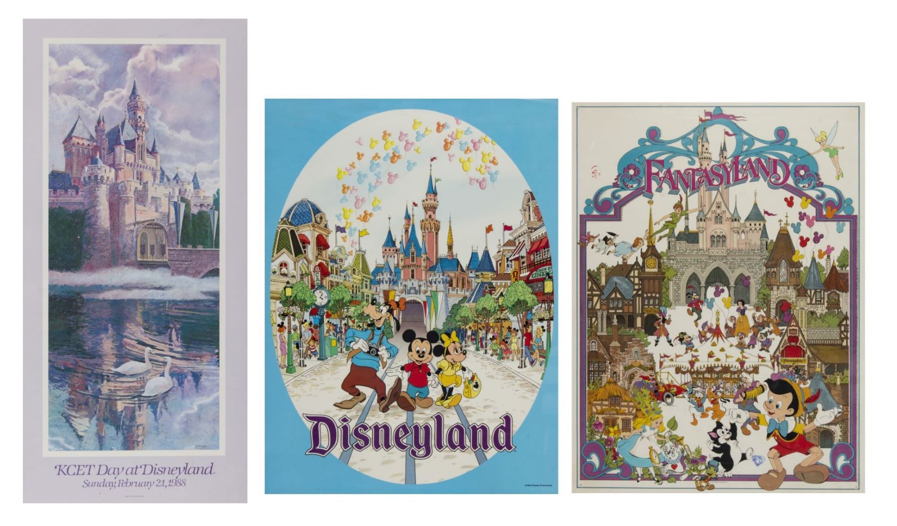 (Disneyland, c.1980s-90s) A collection of (3) Disneyland souvenir posters that each present a different stylistic view of Sleeping Beauty Castle. One poster depicts Fantasyland and the various attractions within the land, the second poster offers a great view of Main Street leading up to Sleeping Beauty Castle, and the third poster shows only the castle and was created for a special event day at Disneyland. The first two posters measure 24"x18", and the special event poster measures 31.5"x15". The condition is good throughout with some edge-wear.