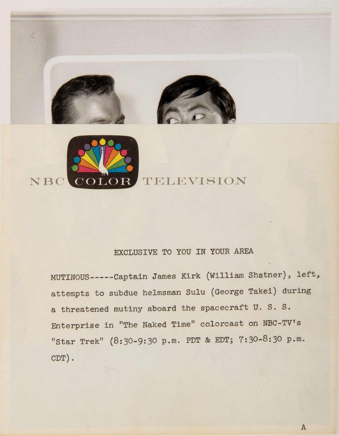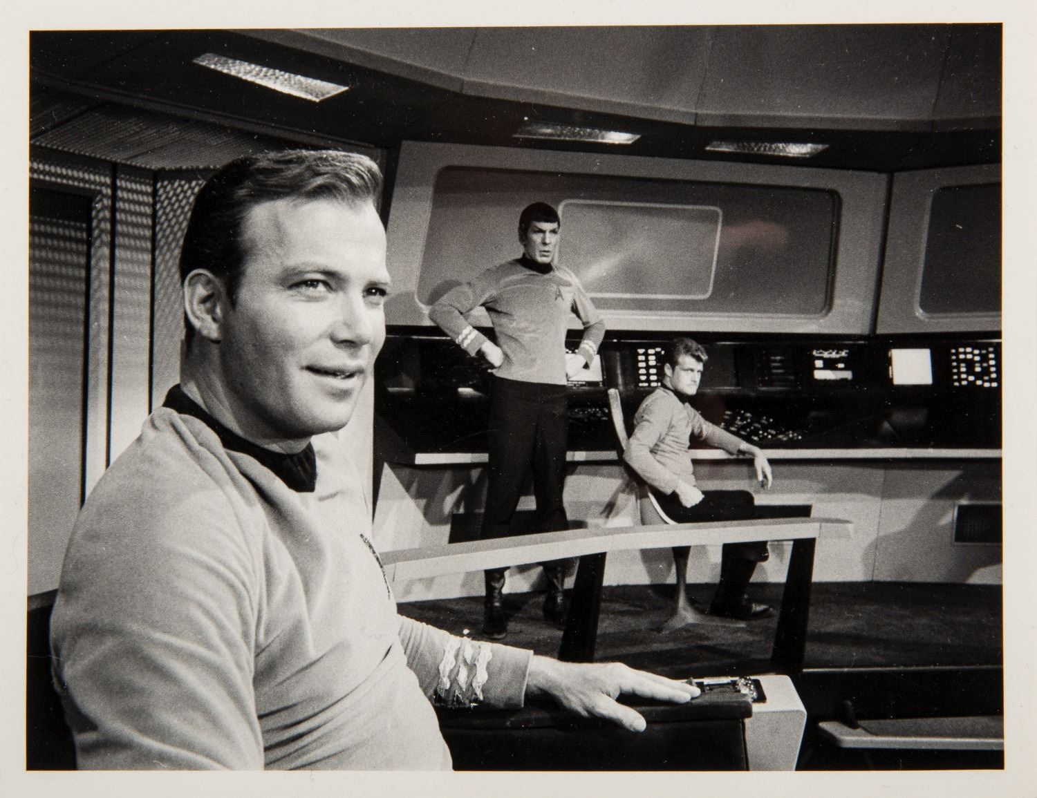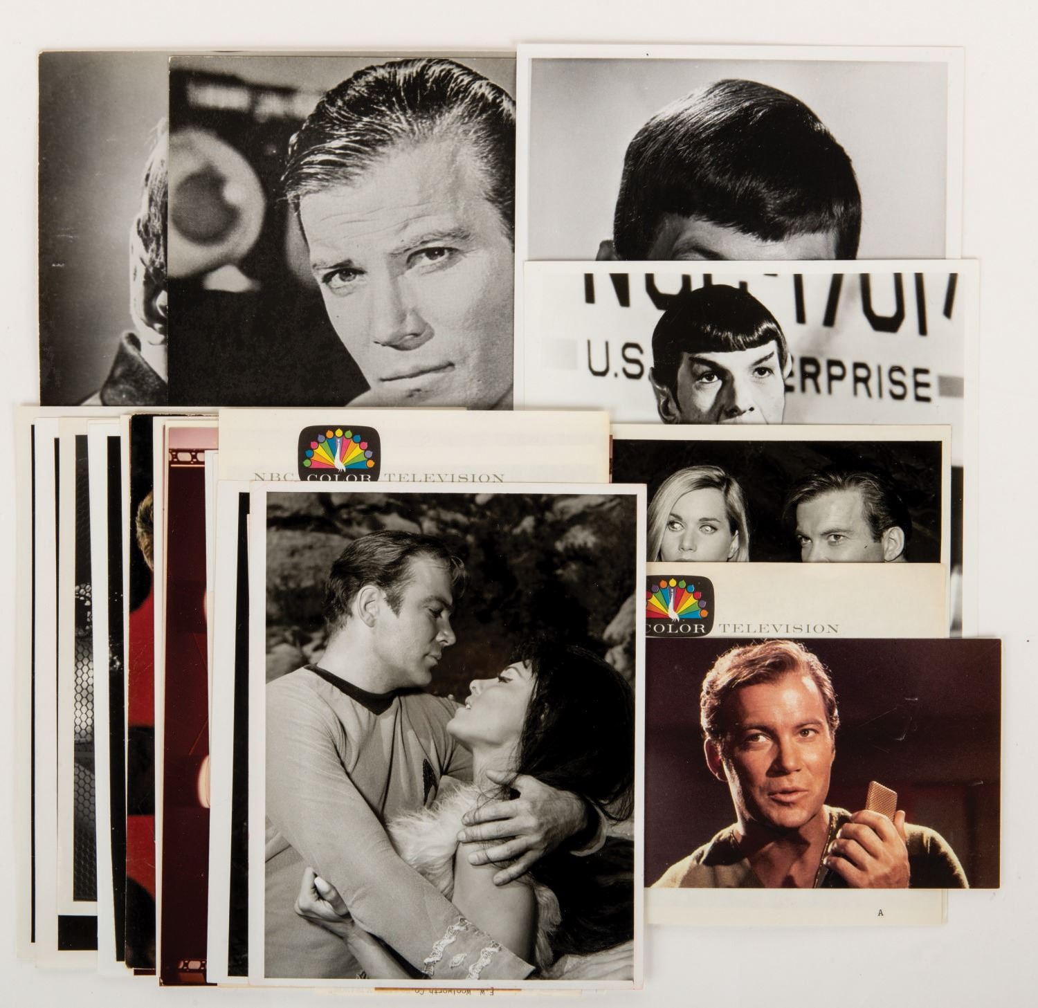 (Paramount, c.1960s-70s) A collection of (30) Star Trek publicity photos. The lot includes memorable scenes spanning all three seasons of Gene Roddenberry's popular TV series. Notable among the collection are two large photos of Kirk and Spock, two photos of the USS Enterprise, (6) publicity photos retaining their NBC Television captions, and (10) color photos. Measuring 9"x7" to 14"x10.75", the photo prints display in good overall condition, exhibiting some curling and wear to edges and corners.