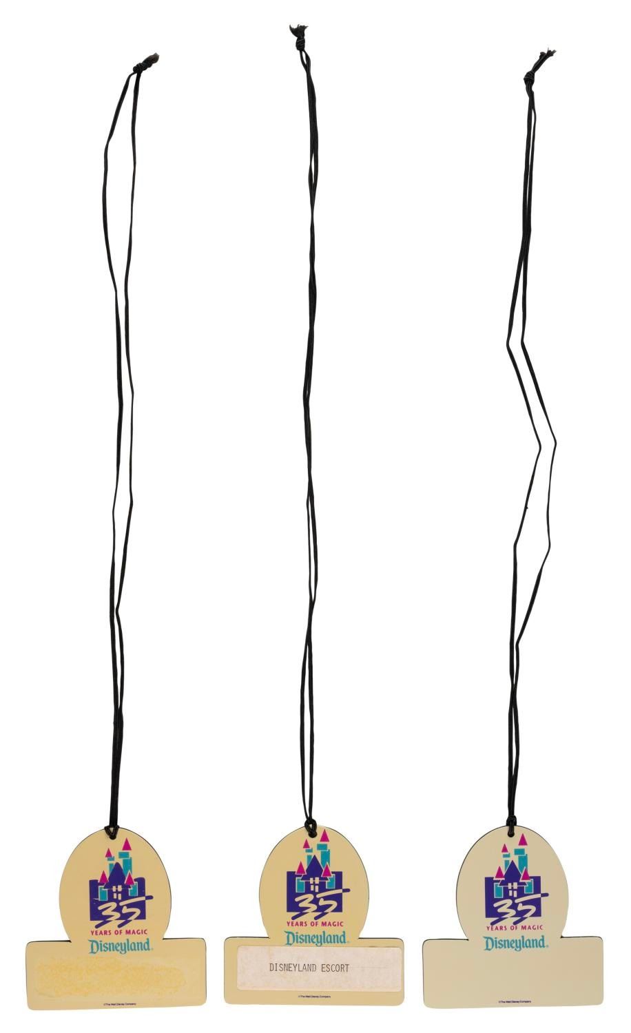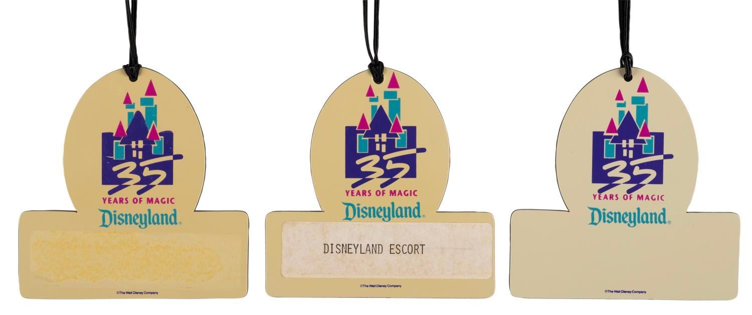 (Disneyland, 1990) A collection of three Press and Cast Escort badges for Disneyland's 35th anniversary celebration. Measuring 3.75"x3.75" each, the badges are in fine to very good condition with discoloration, surface scratching, adhesive residue and a label.