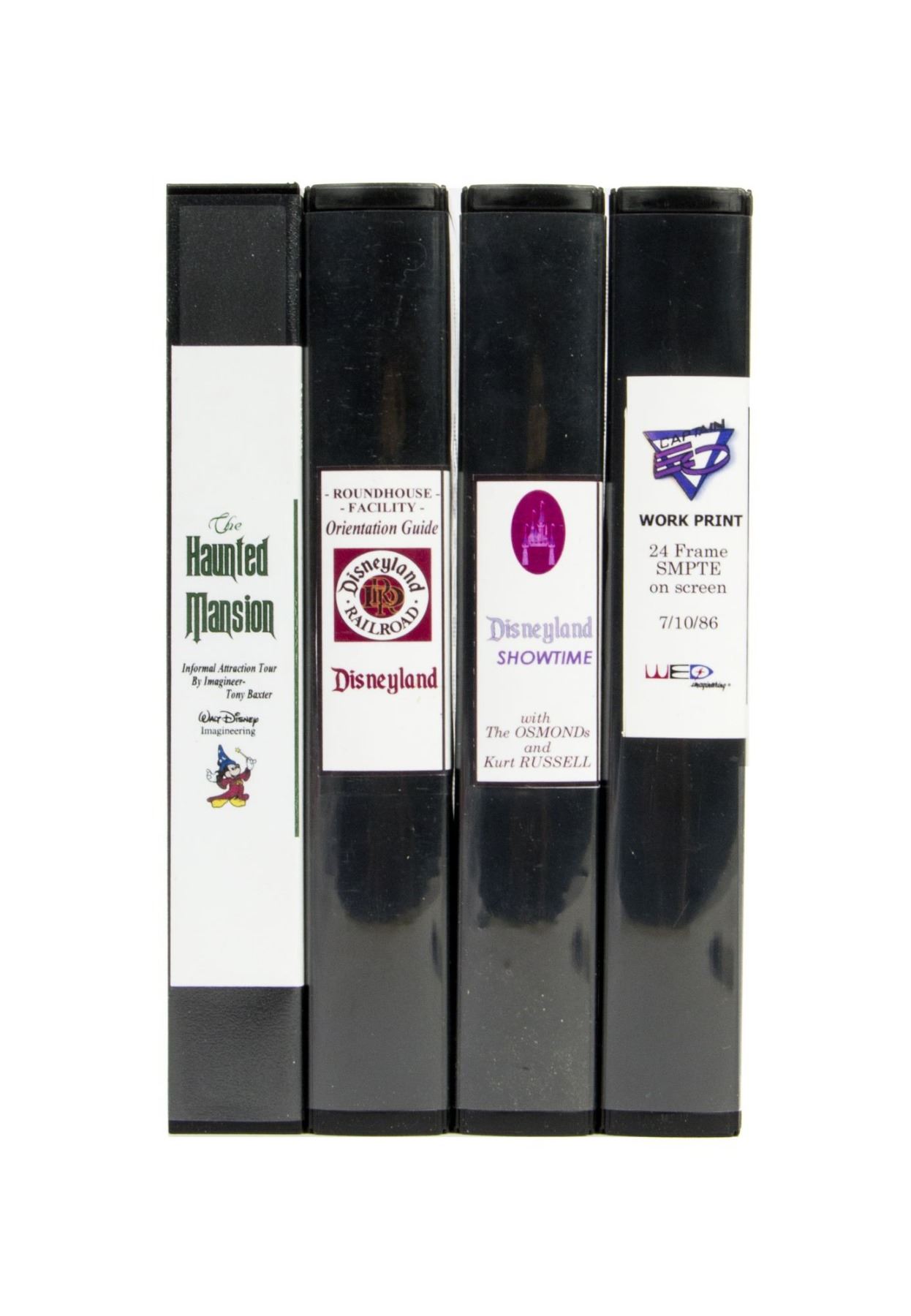 (Disneyland, c.1998) A collection of (4) VHS Disneyland Cast Member orientation and informative tapes. The tapes are labeled: "The Haunted Mansion - Informal Attraction Tour by Imagineer Tony Baxter", "Disneyland Railroad Roundhouse Facility Orientation Guide", "Disneyland Showtime with The Osmonds and Kurt Russell", and "Captain EO Work Print". Cast Member and promotional tapes like these were often used as a means of educating new hires. Each tape comes in a hard shell case. The tapes have not been tested for functionality or content, but appear to be in very good condition with little wear.