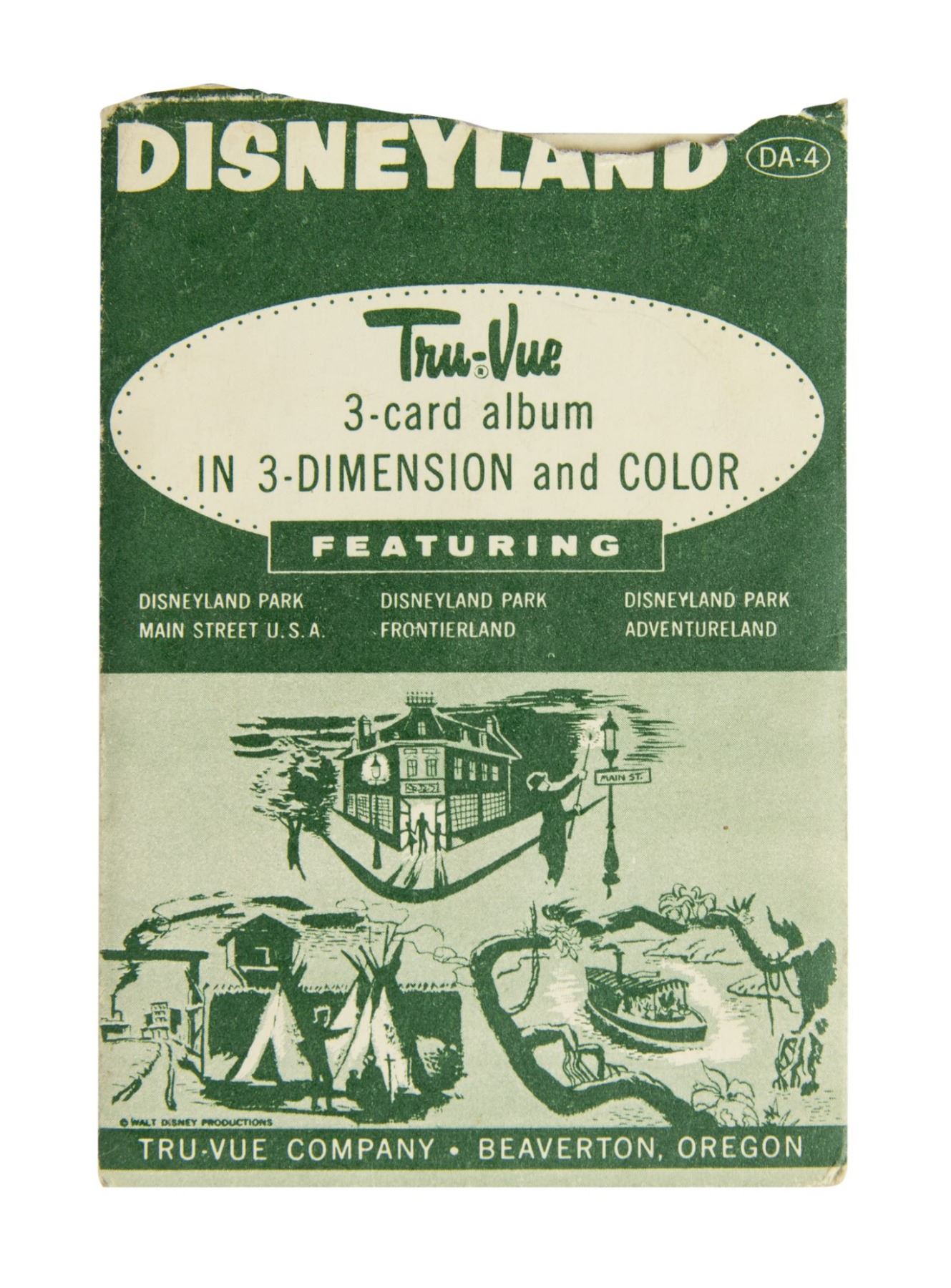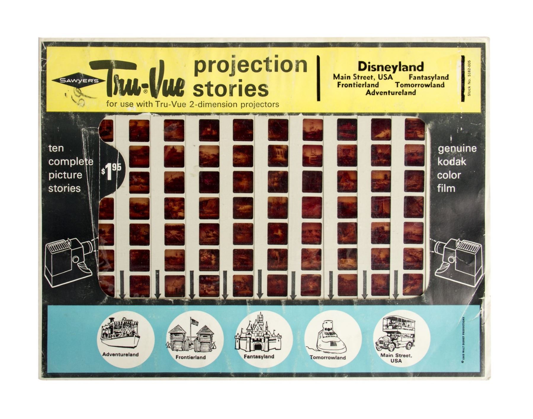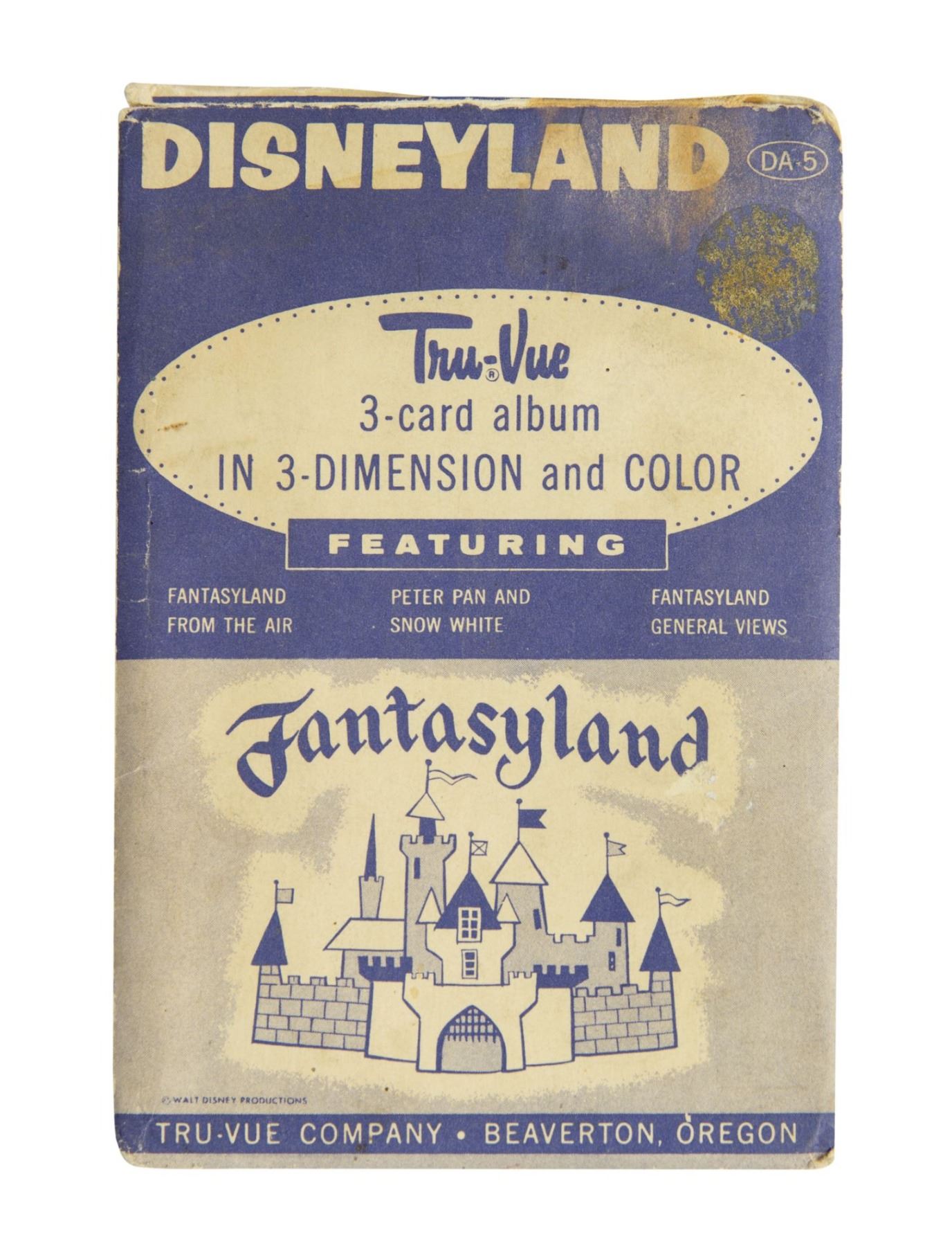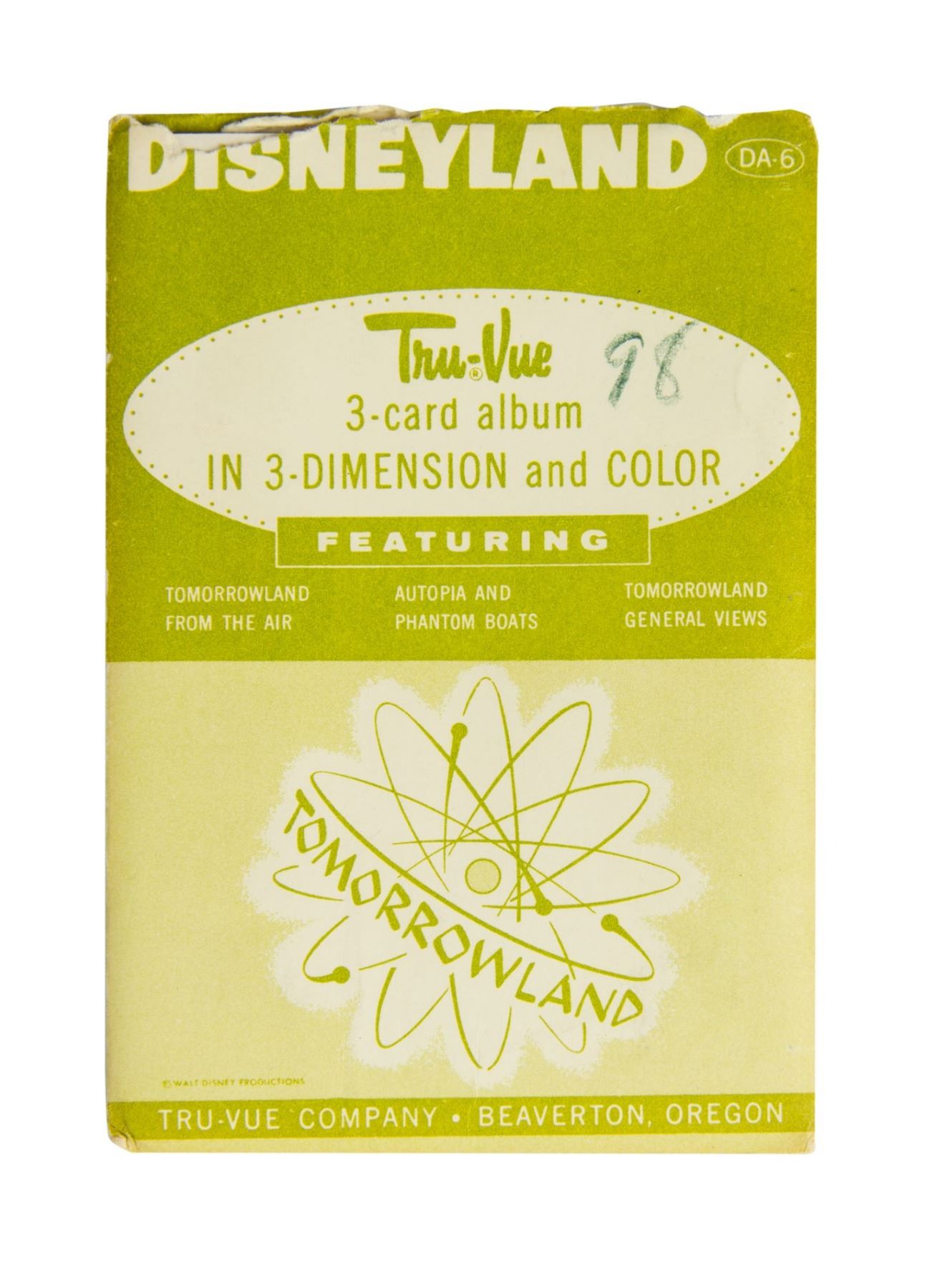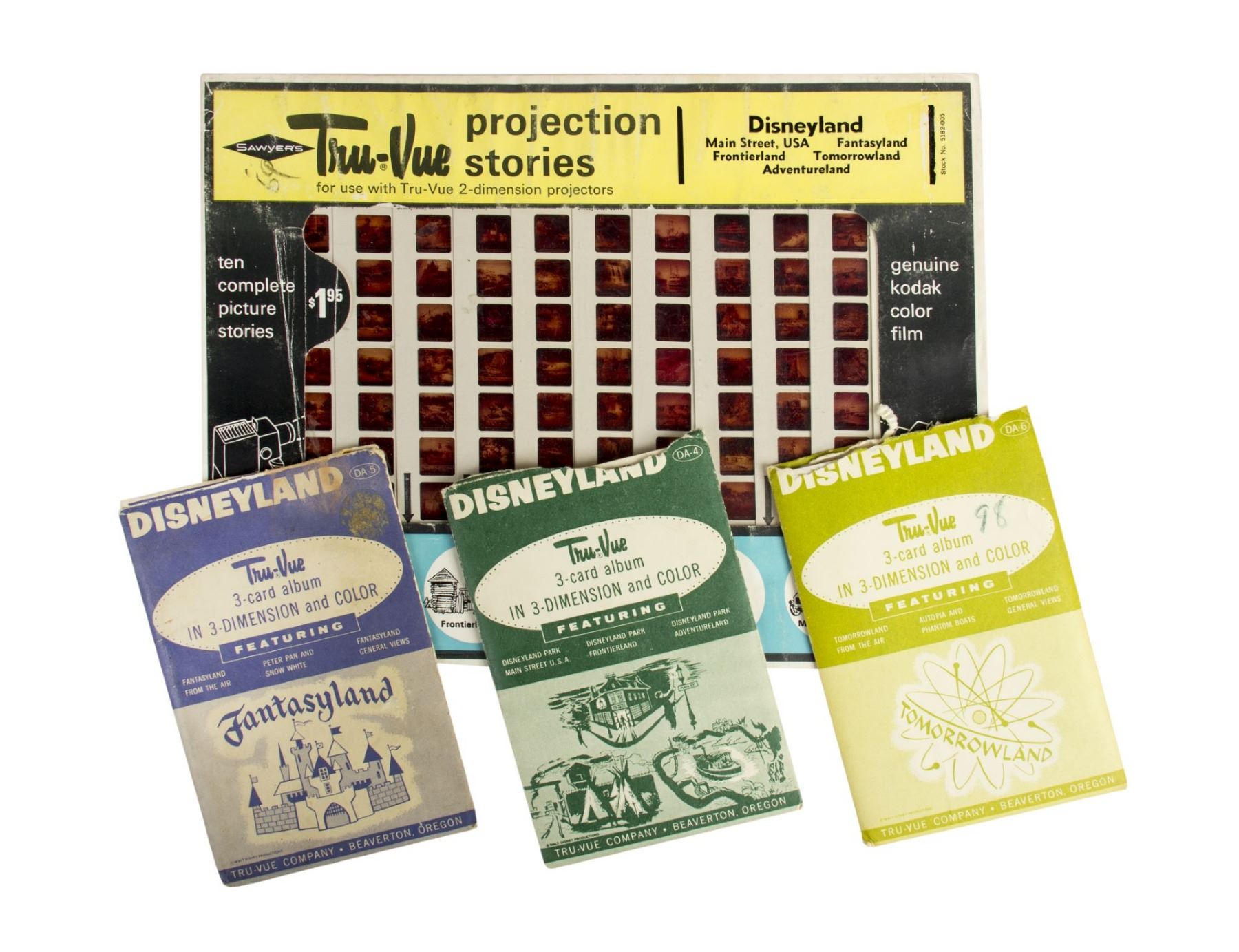 (Disneyland, c.1955-1960s) A collection of Tru-Vue picture cards featuring early Disneyland imagery. Included in this collection are: a photo card album for Tomorrowland, one for Fantasyland, and a general Disneyland album. Additionally, there is a larger album of "Tru-Vue Projection Stories" to be used with Tru-Vue 2-dimension projectors. The smaller albums measure approximately 6"x4" while the larger measures 9"x11.75". The set is in good condition overall with varying degrees of wear throughout.