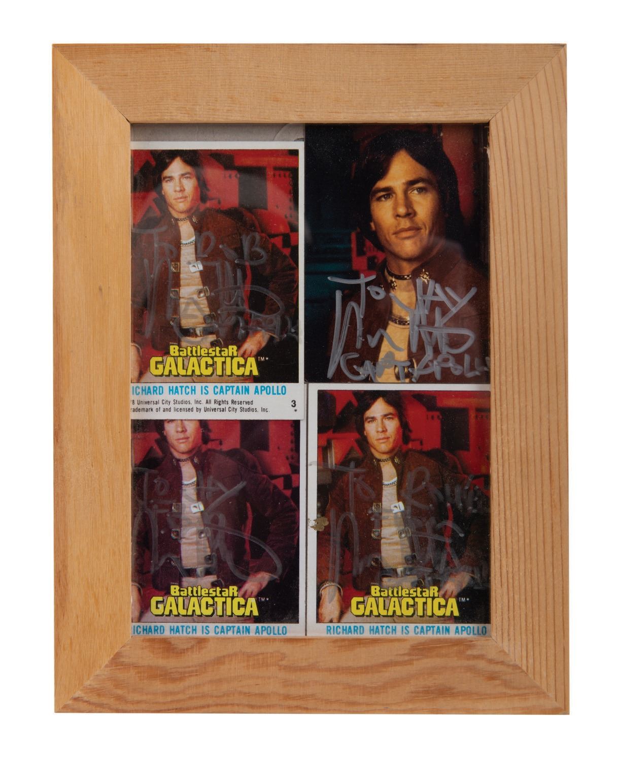 (Universal, 1978,96) A collection of Battlestar Galactica collectible cards by Topps and Dart, signed by Richard Hatch. Included in the lot are (3) Topps #3 "Richard Hatch is Captain Apollo" cards and one (of 500) Dart Flipcards. All (4) are signed by Richard Hatch. Measuring 3.5"x2.5", the cards are in fine condition, exhibiting little apparent wear.