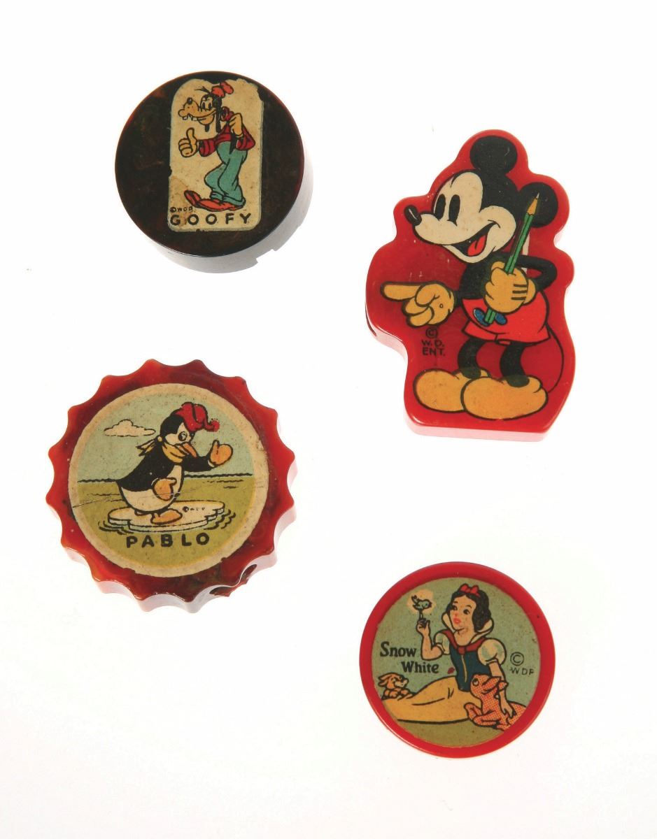 (Plastic Novelties, Inc., 1930s-40s) This set of (4) illustrated color pencil sharpeners from Plastic Novelties, Inc. ranges from the mid 30s to mid 40s. The set features the characters Mickey Mouse, Pablo the Penguin, Snow White, and Goofy. Sizes range from 1" tall to 1.75" tall. In very good condition with some wear from use.