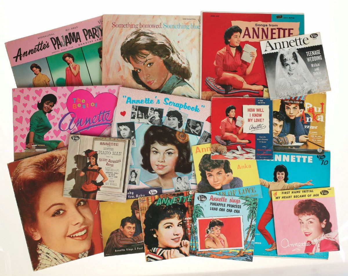 (1950s-1960s) Fantastic collection of 1950's and 1960's Annette Funicello records. Includes twenty-four (24) 45 rpm records (some duplicates) and twenty-one (21) LP Albums (some duplicates). All in very good to fine condition.