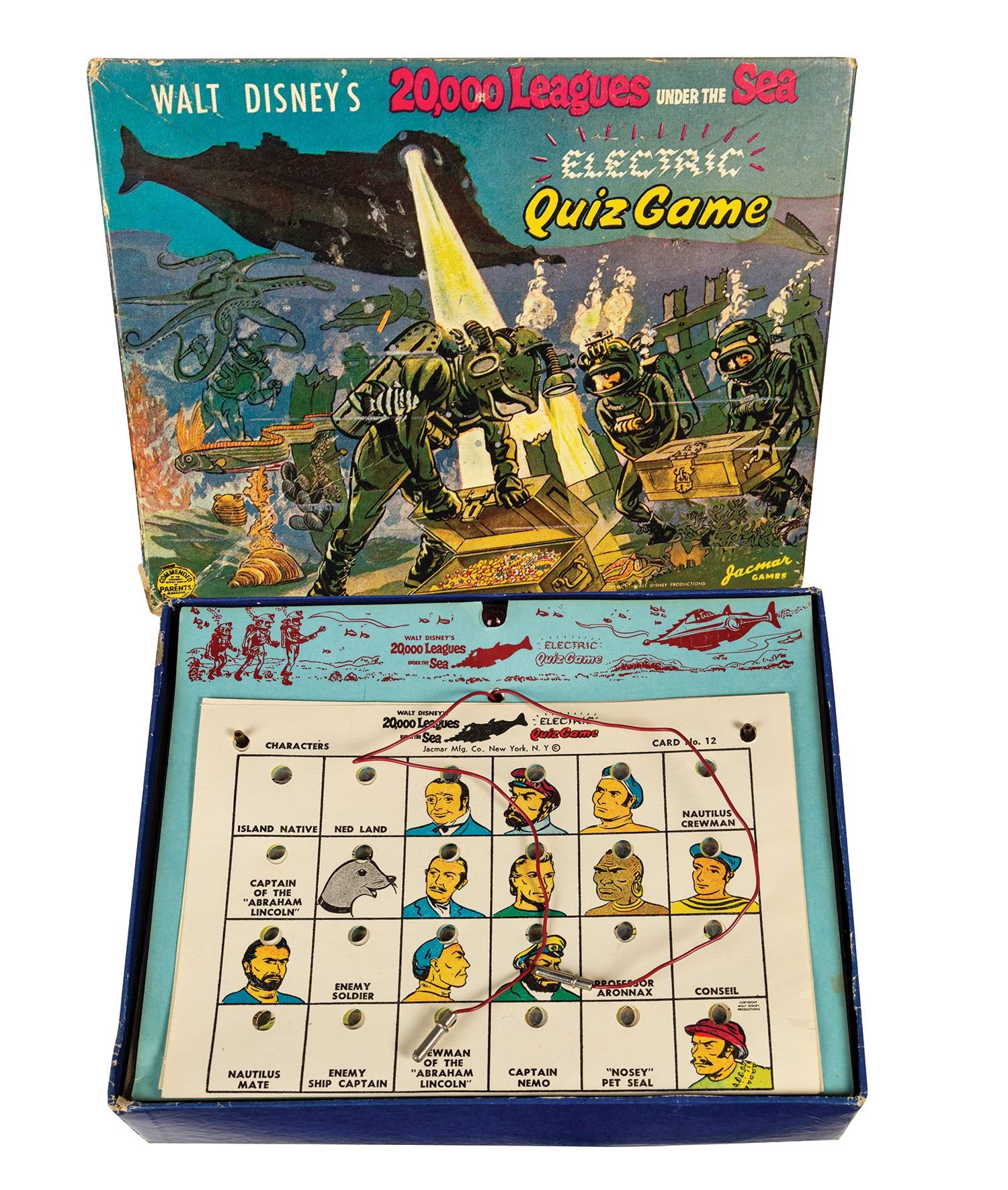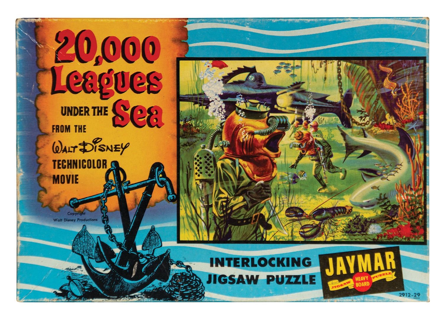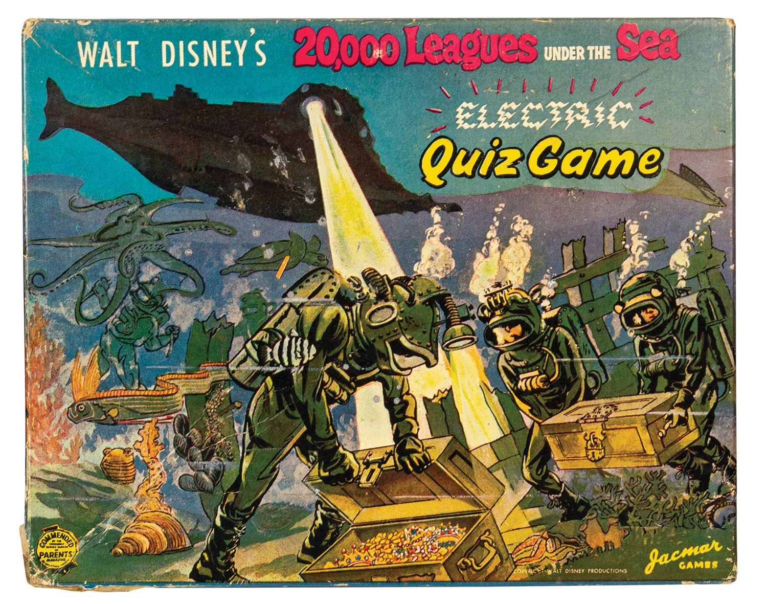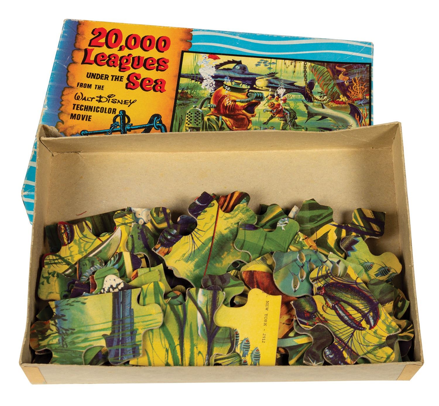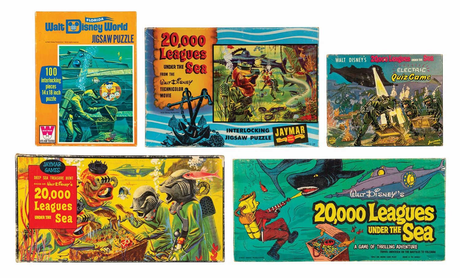 (Disney, c.1950s-70s) A collection of (5) games and puzzles based on Walt Disney's 20,000 Leagues Under the Sea. The collection includes an electric quiz game, a puzzle by Jaymar, a puzzle by Whitman, a deep sea treasure hunt game, and a board game by Gardner Games. The games come in their original boxes and while the games appear to be complete, the individual pieces have not been counted and functionality of the electric game has not been tested. The boxes range in size from 7"x10" to 8"x16" and the condition is good overall with some wear throughout from use. The Whitman puzzle has been assembled.