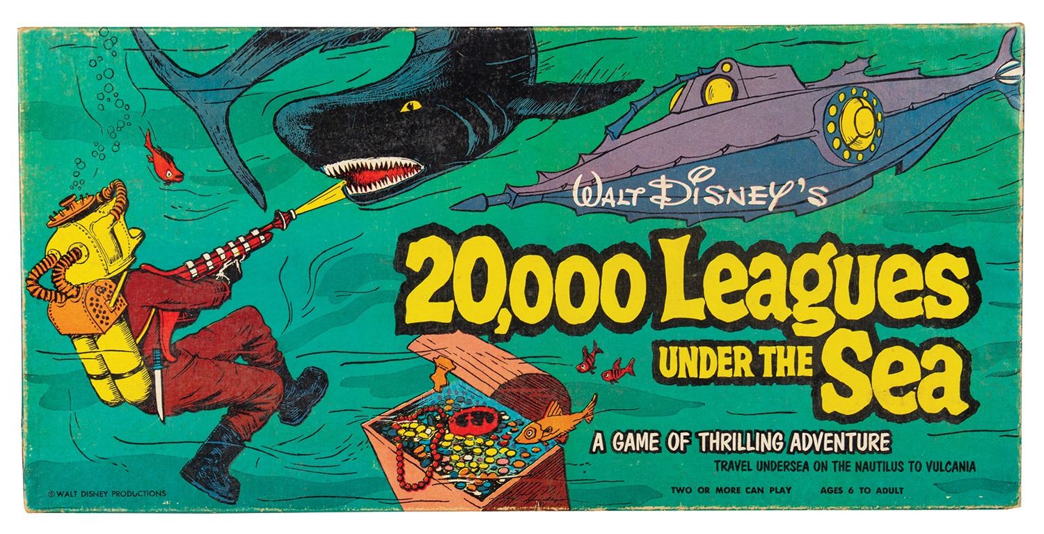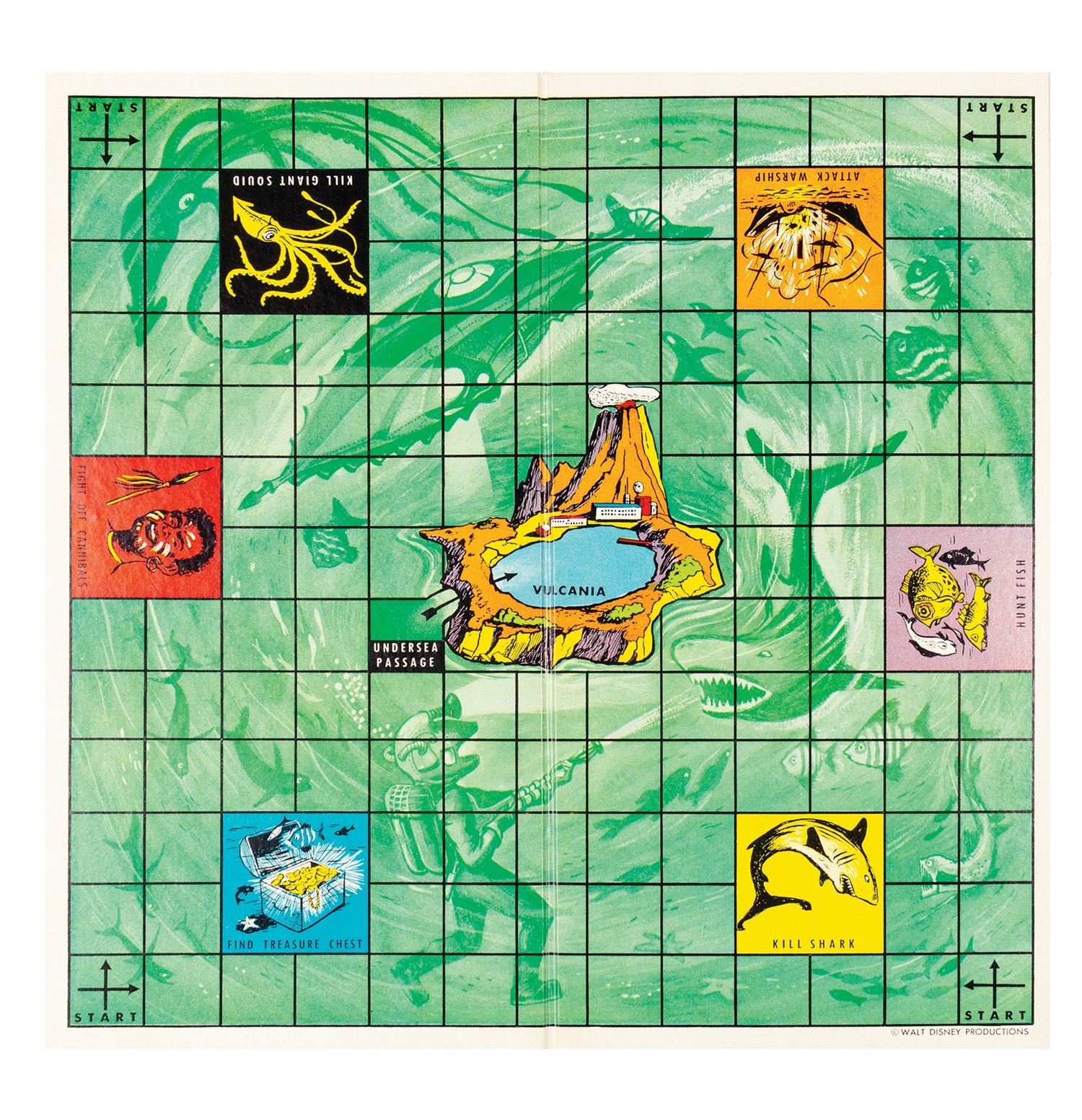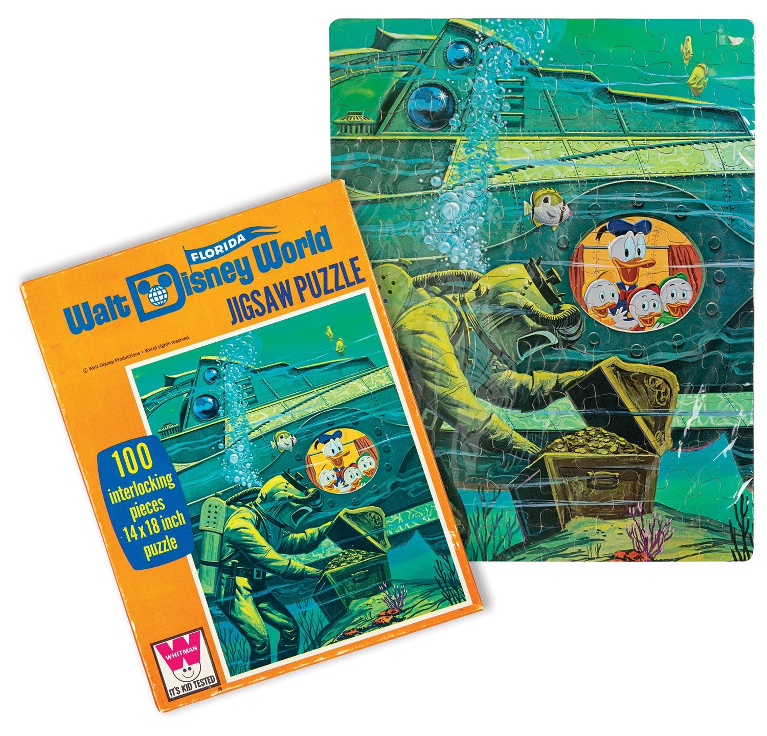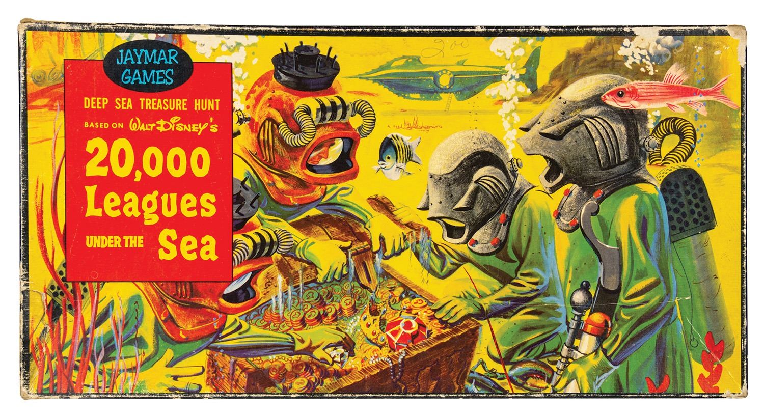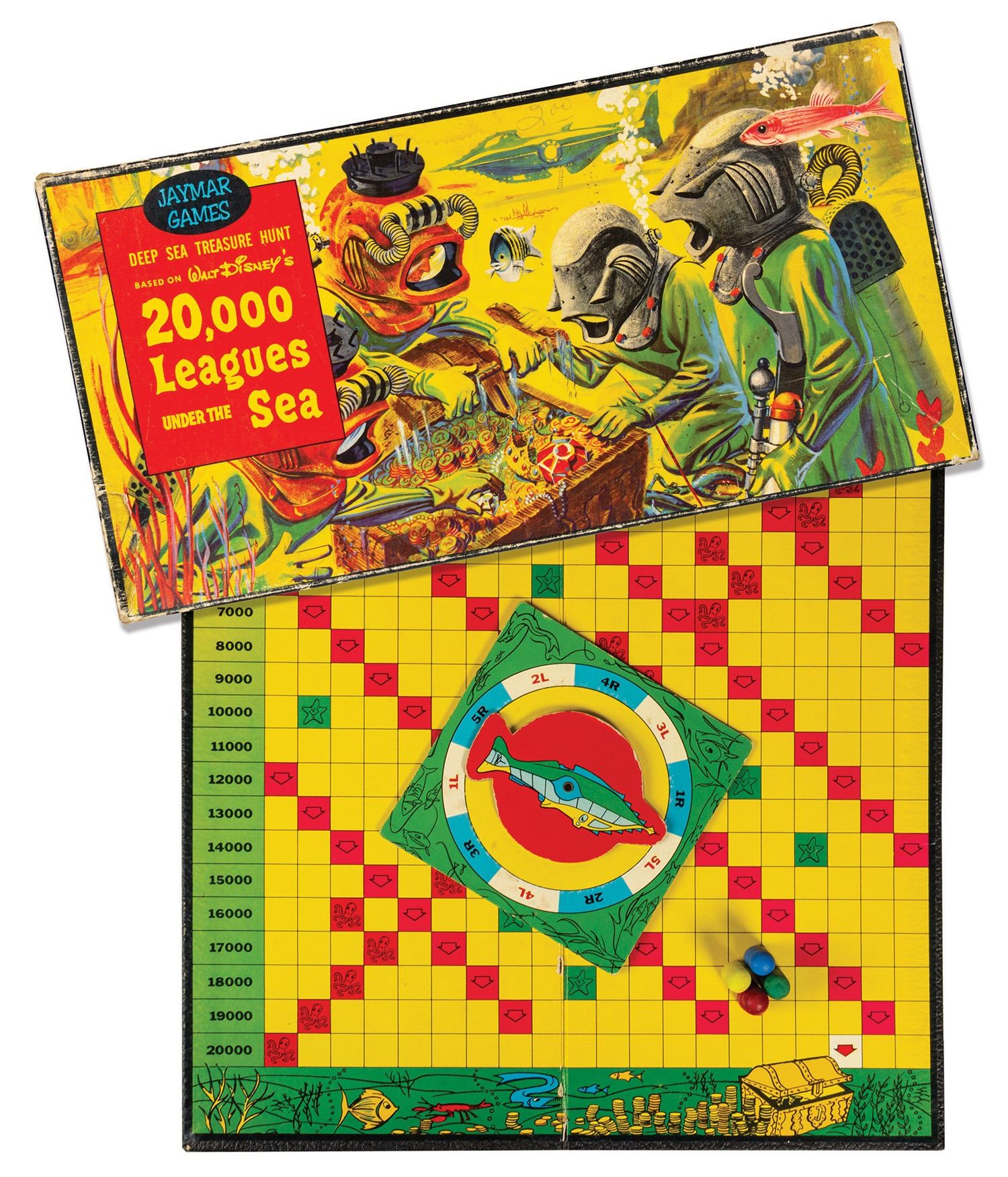 (Disney, c.1950s-70s) A collection of (5) games and puzzles based on Walt Disney's 20,000 Leagues Under the Sea. The collection includes an electric quiz game, a puzzle by Jaymar, a puzzle by Whitman, a deep sea treasure hunt game, and a board game by Gardner Games. The games come in their original boxes and while the games appear to be complete, the individual pieces have not been counted and functionality of the electric game has not been tested. The boxes range in size from 7"x10" to 8"x16" and the condition is good overall with some wear throughout from use. The Whitman puzzle has been assembled.