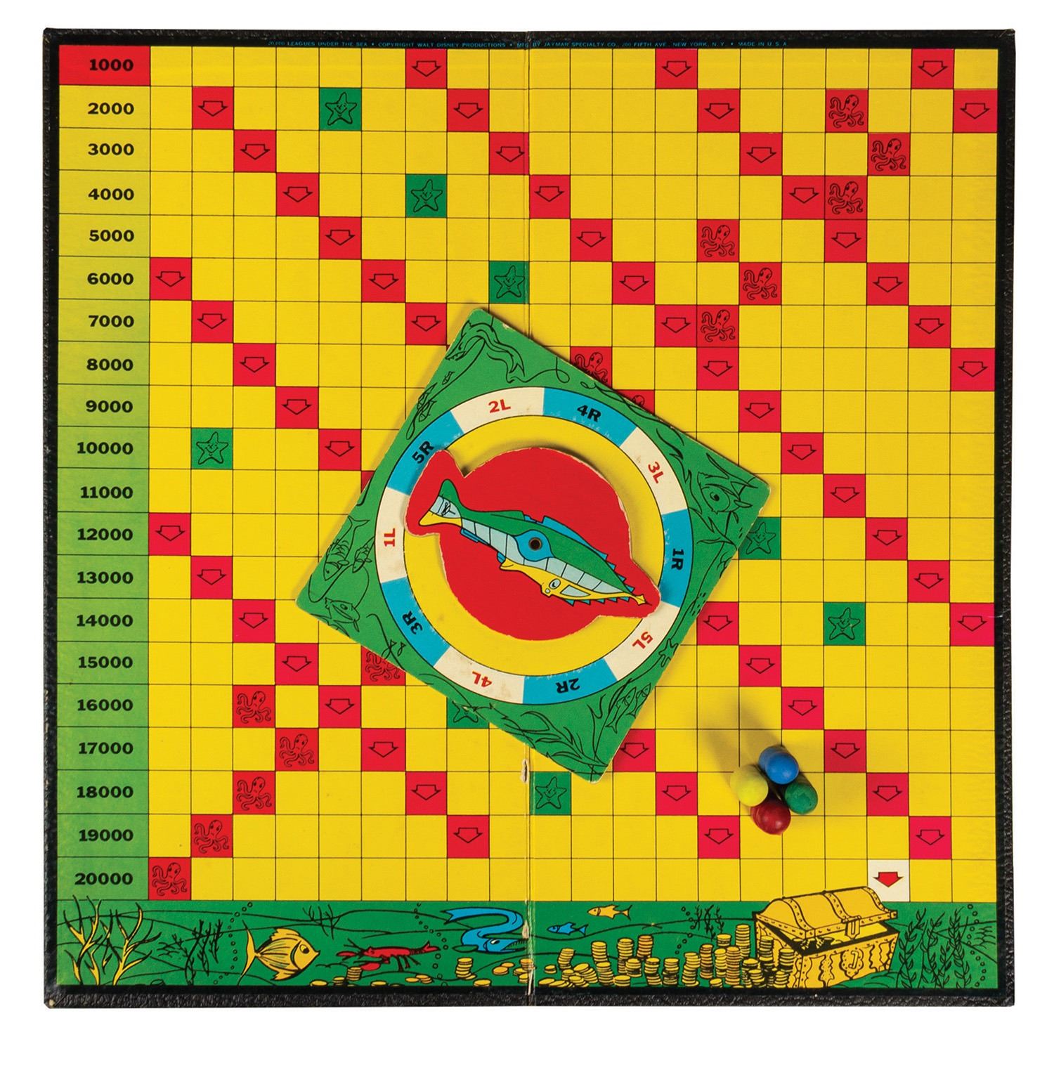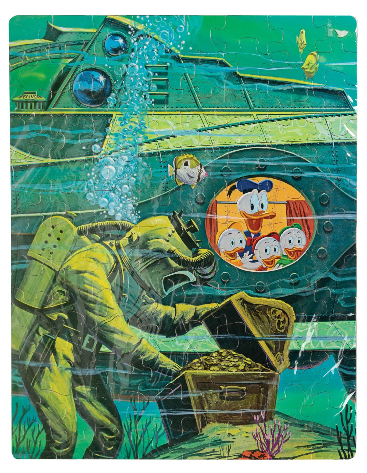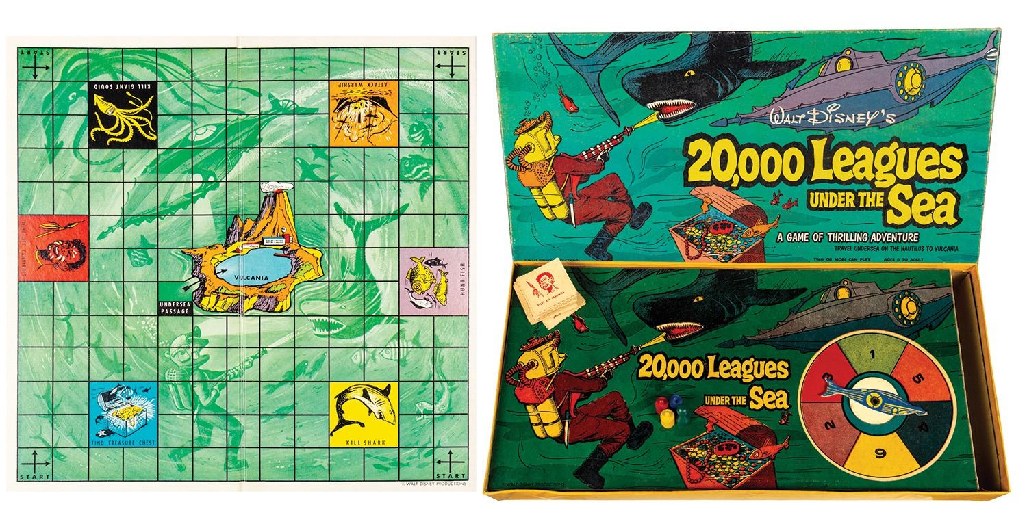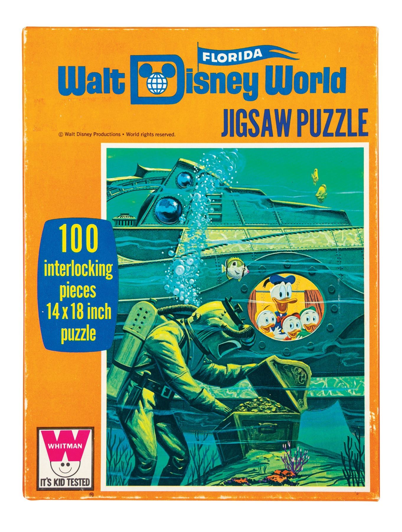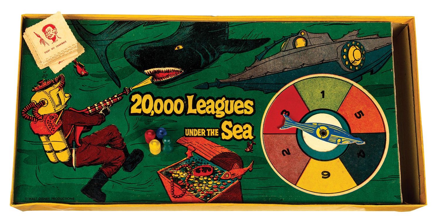 (Disney, c.1950s-70s) A collection of (5) games and puzzles based on Walt Disney's 20,000 Leagues Under the Sea. The collection includes an electric quiz game, a puzzle by Jaymar, a puzzle by Whitman, a deep sea treasure hunt game, and a board game by Gardner Games. The games come in their original boxes and while the games appear to be complete, the individual pieces have not been counted and functionality of the electric game has not been tested. The boxes range in size from 7"x10" to 8"x16" and the condition is good overall with some wear throughout from use. The Whitman puzzle has been assembled.