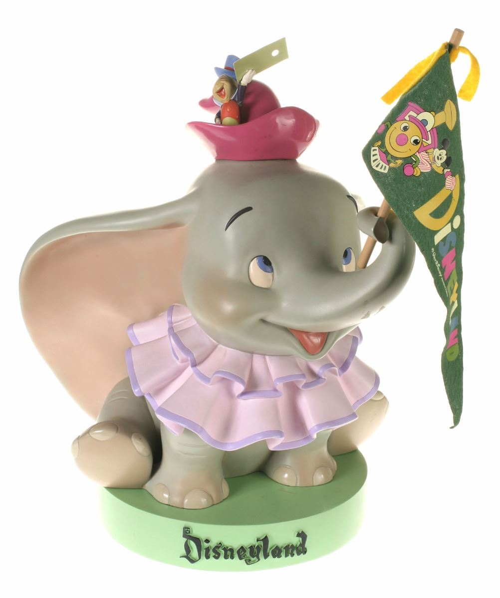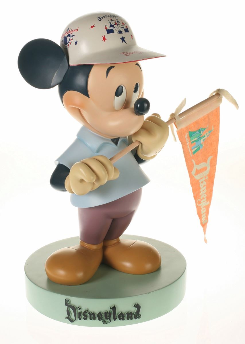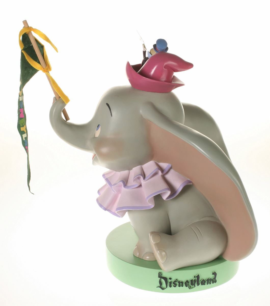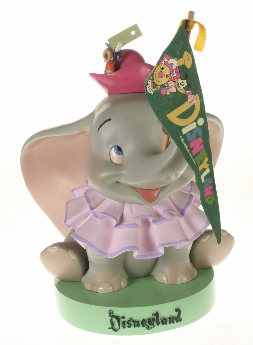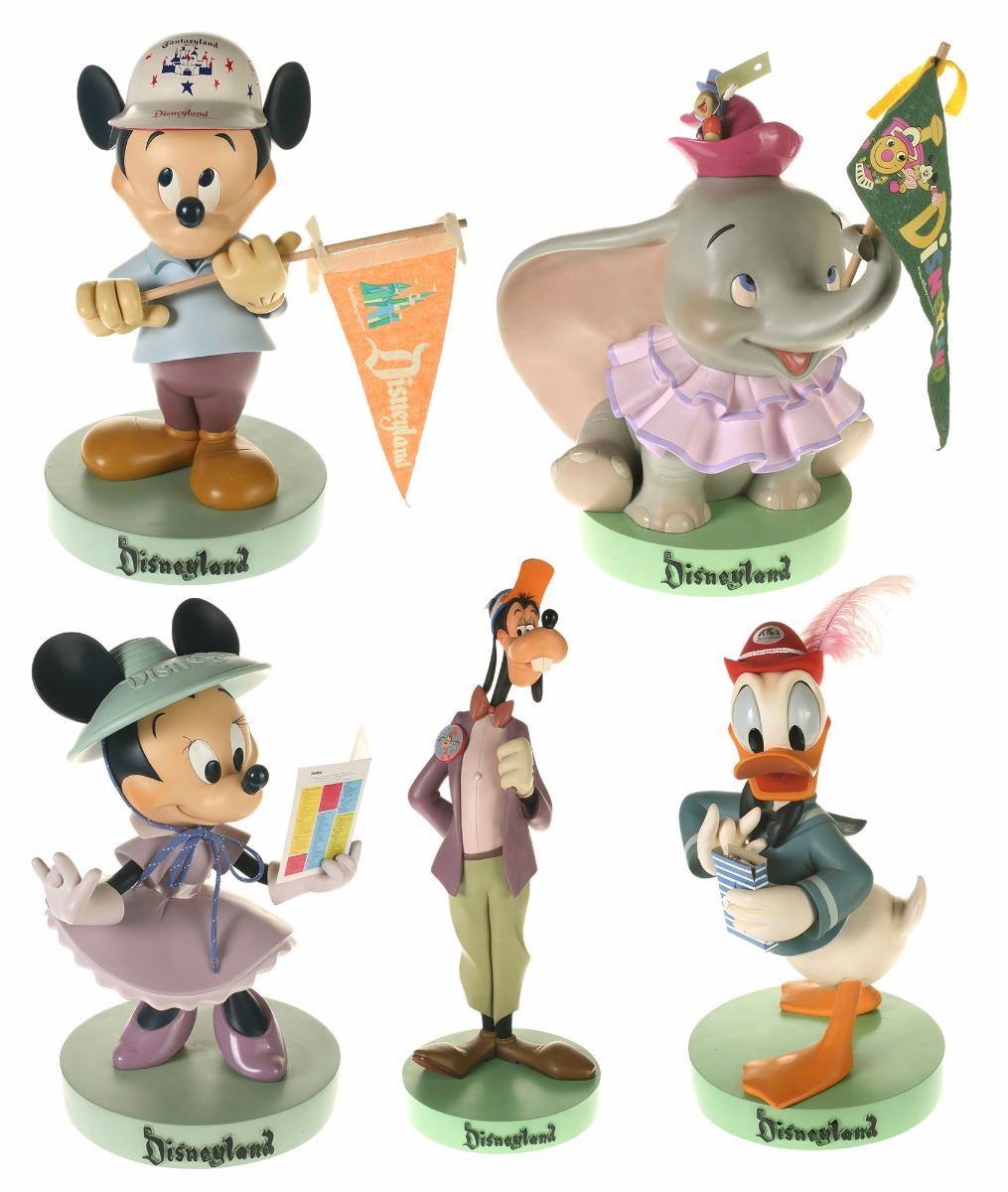 (Disneyland, 2005) Collection of (5) Disneyland 50th Anniversary "Big Fig" figures. The hand-painted resin cast figures were available for a limited time in the park and have become extremely hard-to-find. Includes (1) Mickey, (1) Minnie, (1) Donald, (1) Goofy, and (1) Dumbo figure. Each character has a green base that reads "Disneyland", and is wearing or holding replica vintage souvenirs from the park. Each figure measures approximately 13" in diameter and 21" tall, with Goofy standing a bit taller, and Dumbo a bit wider. The set is in good condition with some wear throughout, including a break to Mickey's left ear which has been repaired.
