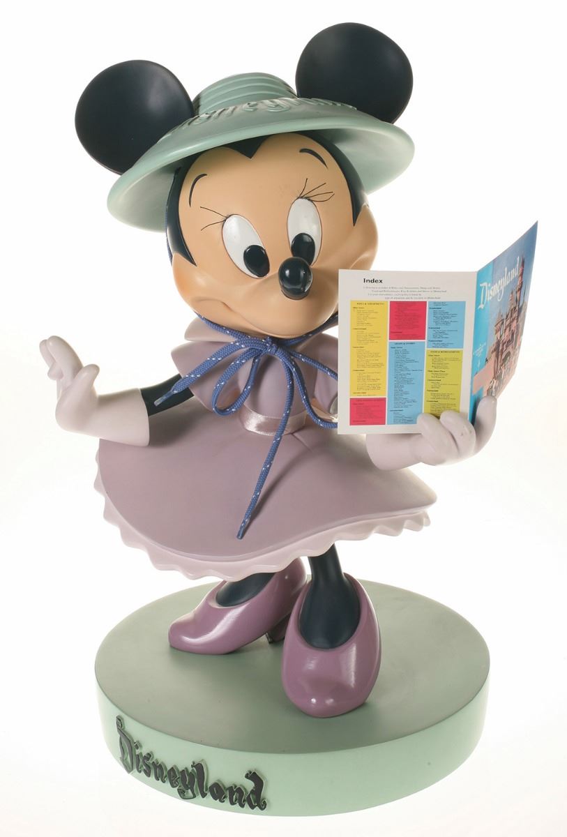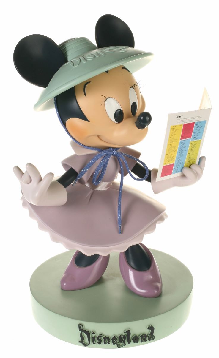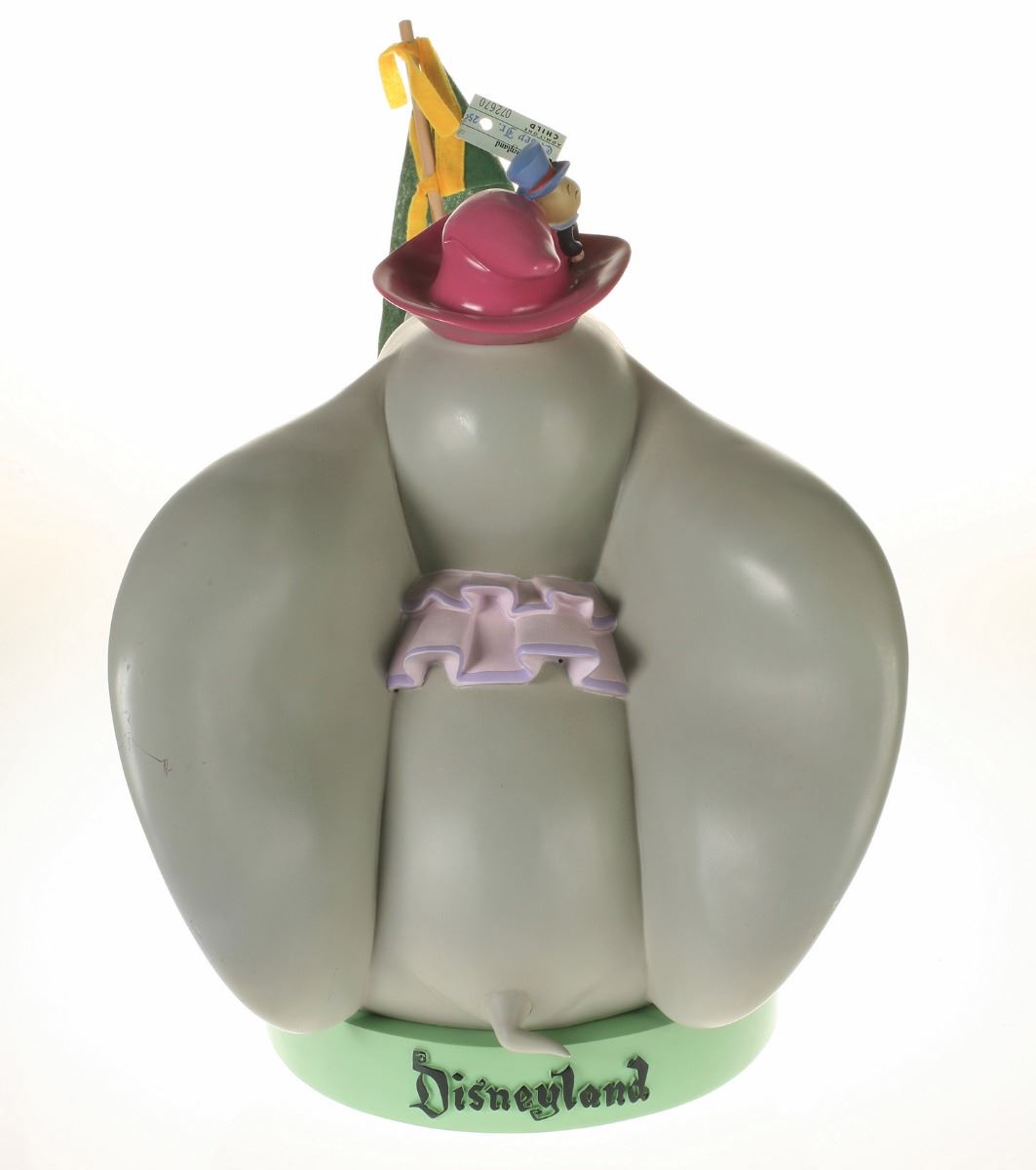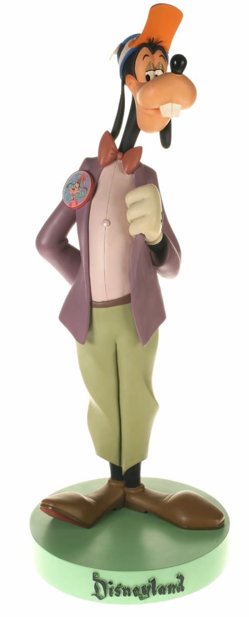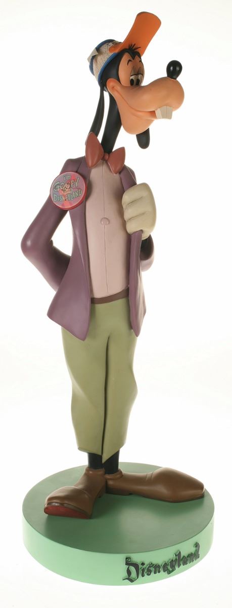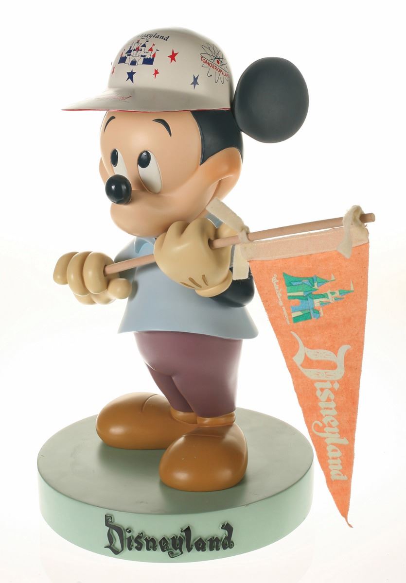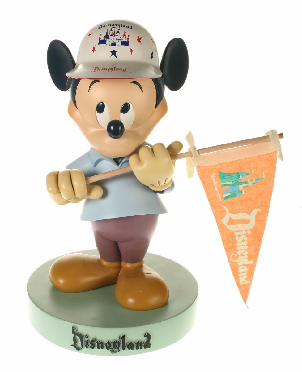 (Disneyland, 2005) Collection of (5) Disneyland 50th Anniversary "Big Fig" figures. The hand-painted resin cast figures were available for a limited time in the park and have become extremely hard-to-find. Includes (1) Mickey, (1) Minnie, (1) Donald, (1) Goofy, and (1) Dumbo figure. Each character has a green base that reads "Disneyland", and is wearing or holding replica vintage souvenirs from the park. Each figure measures approximately 13" in diameter and 21" tall, with Goofy standing a bit taller, and Dumbo a bit wider. The set is in good condition with some wear throughout, including a break to Mickey's left ear which has been repaired.