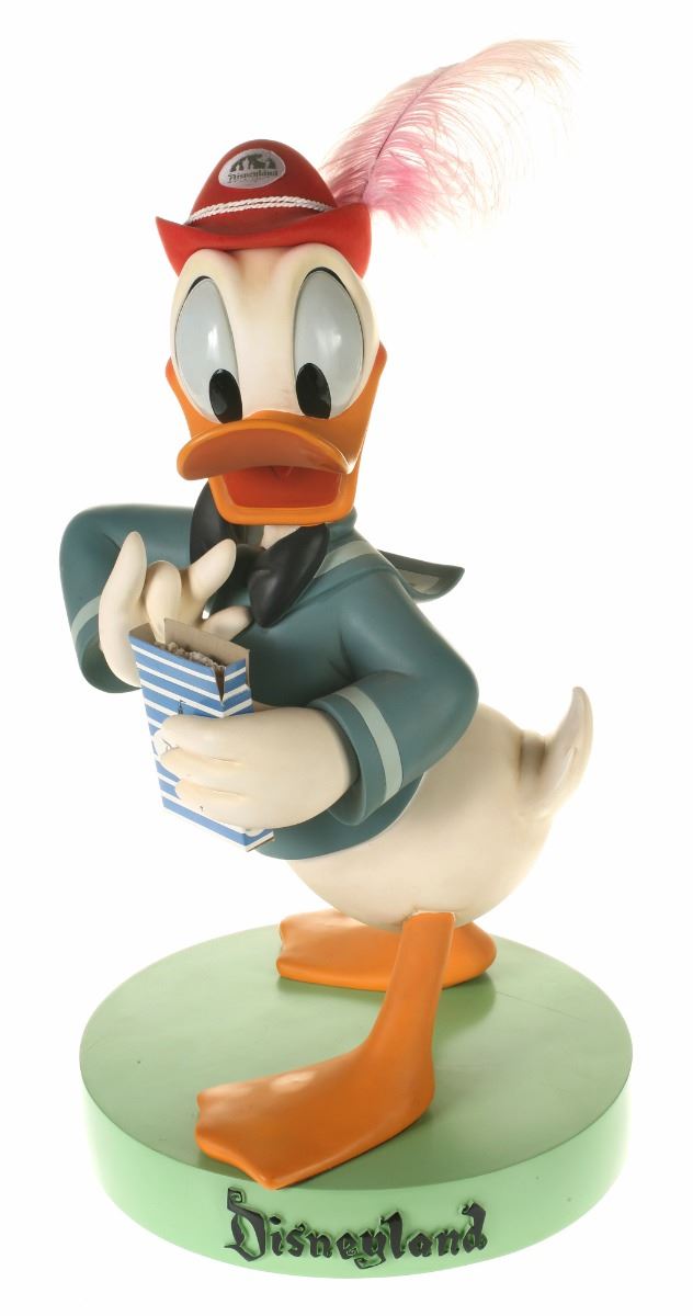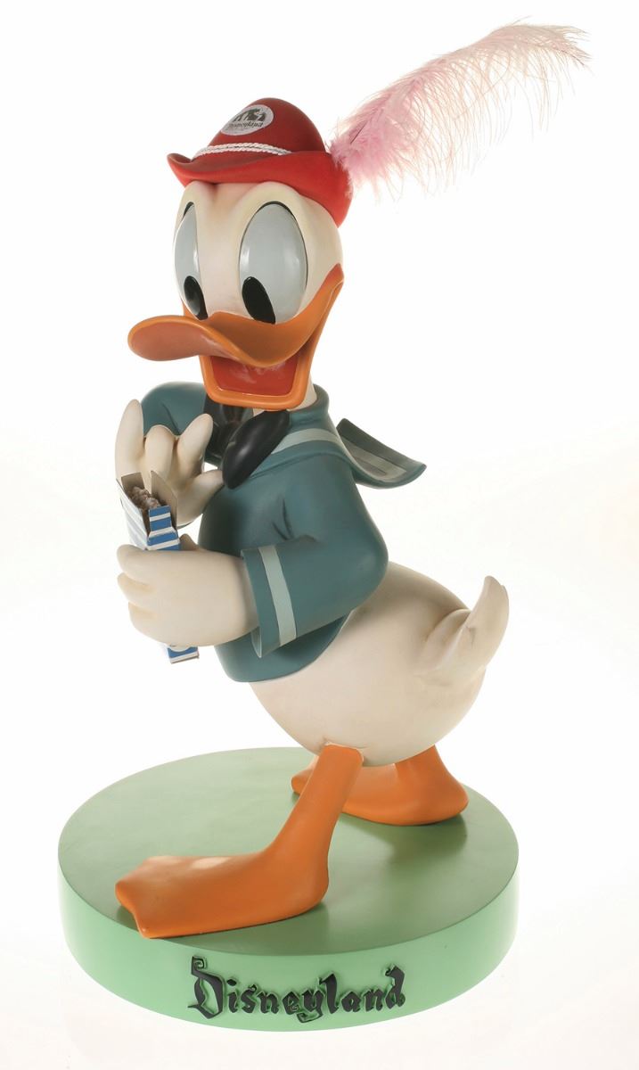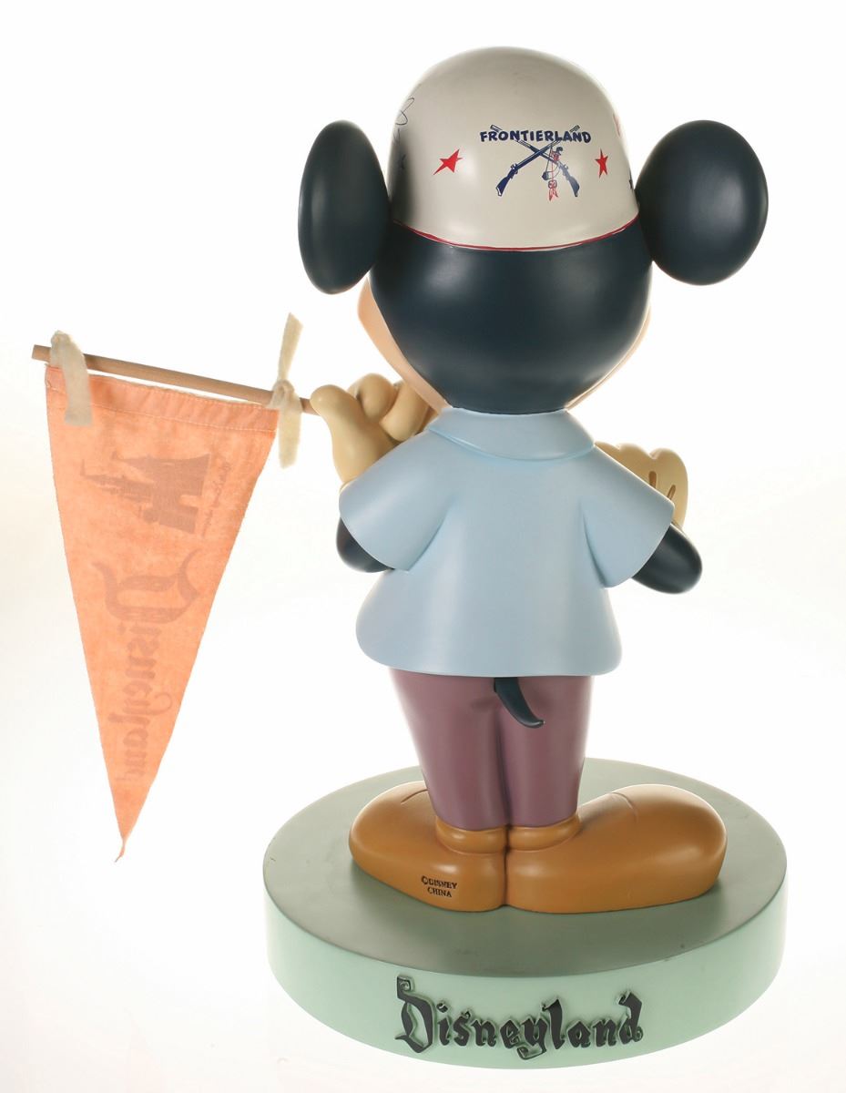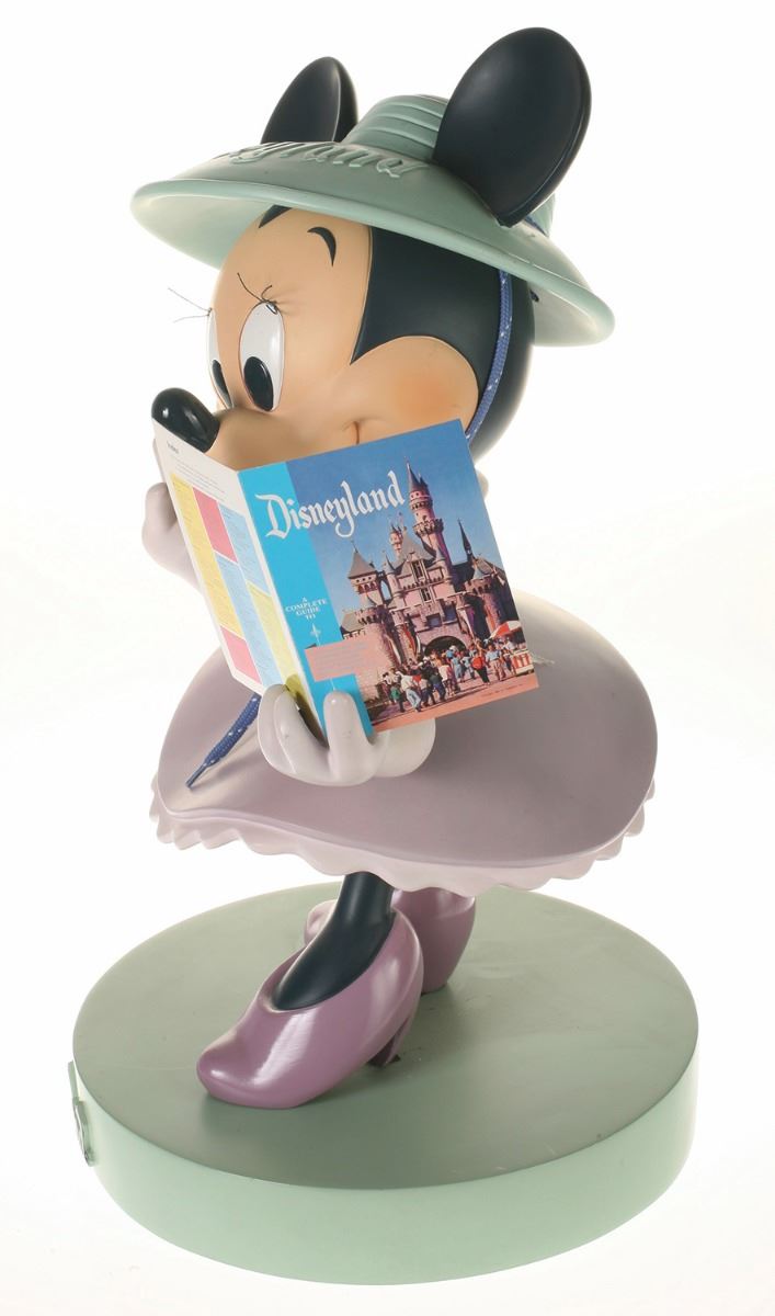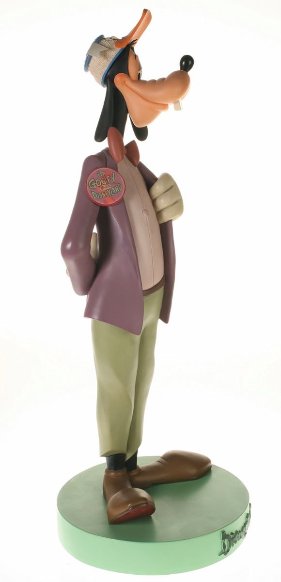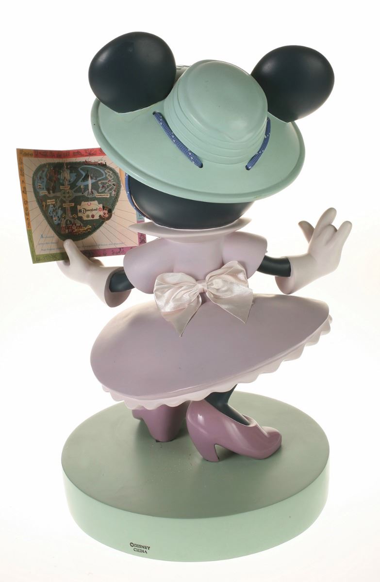 (Disneyland, 2005) Collection of (5) Disneyland 50th Anniversary "Big Fig" figures. The hand-painted resin cast figures were available for a limited time in the park and have become extremely hard-to-find. Includes (1) Mickey, (1) Minnie, (1) Donald, (1) Goofy, and (1) Dumbo figure. Each character has a green base that reads "Disneyland", and is wearing or holding replica vintage souvenirs from the park. Each figure measures approximately 13" in diameter and 21" tall, with Goofy standing a bit taller, and Dumbo a bit wider. The set is in good condition with some wear throughout, including a break to Mickey's left ear which has been repaired.