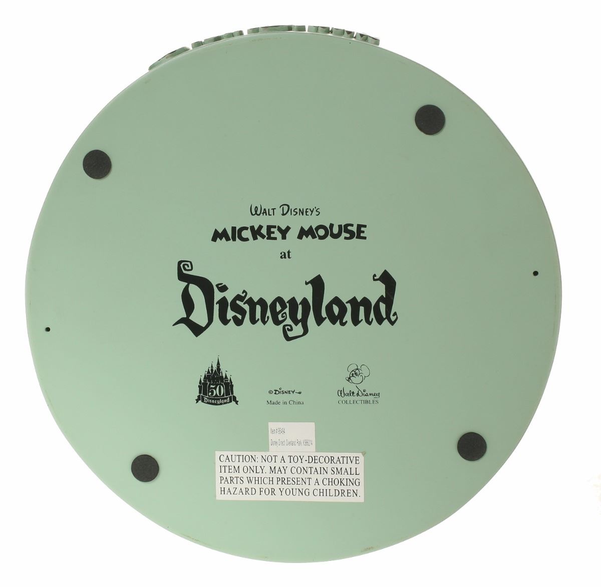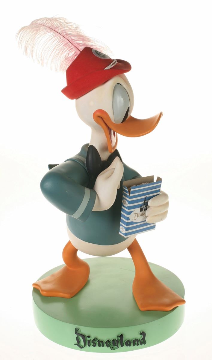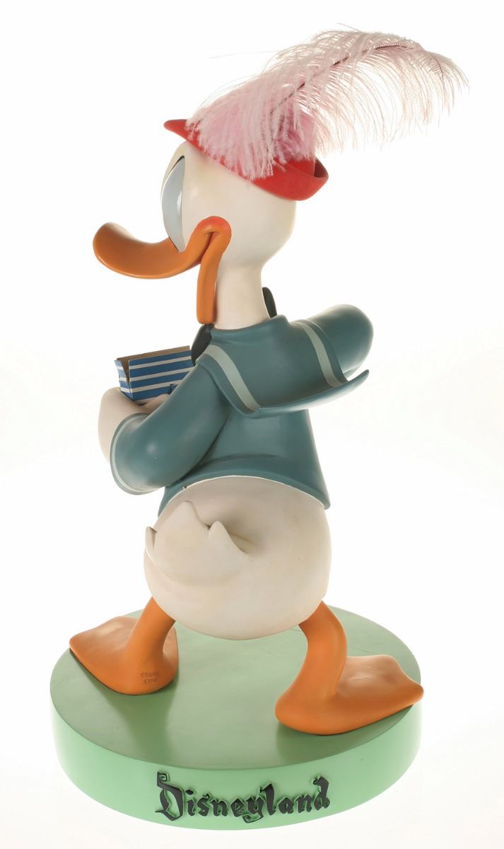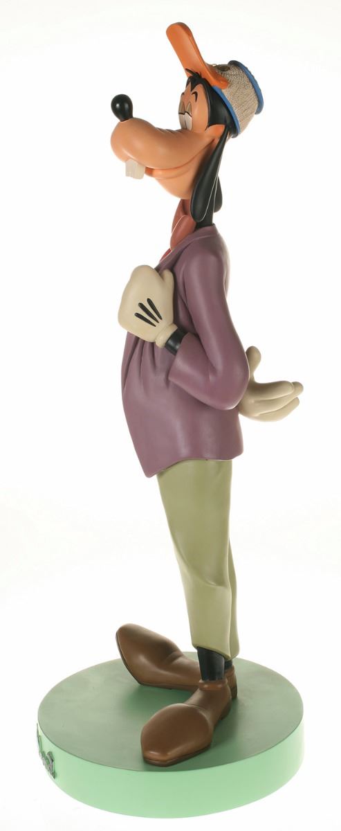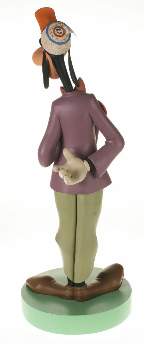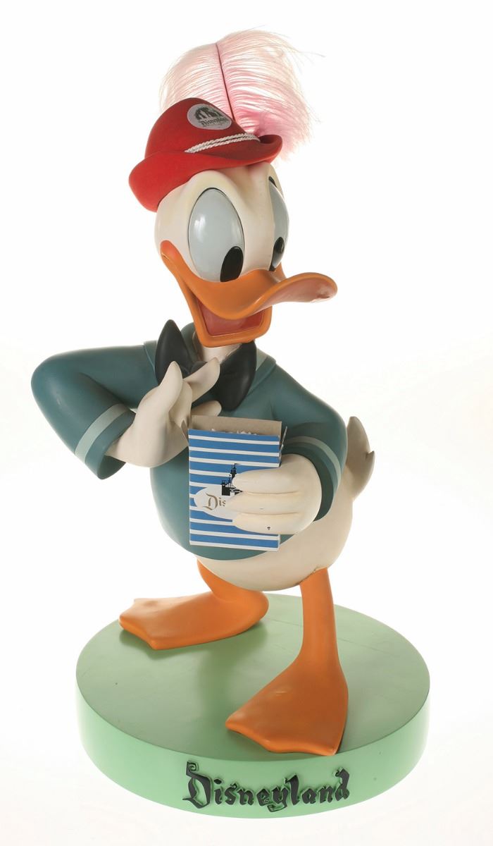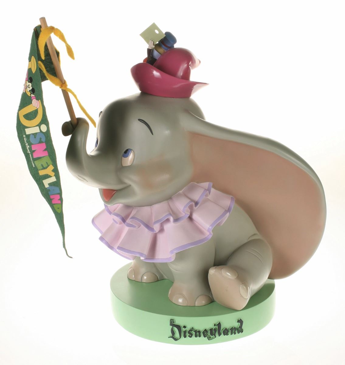(Disneyland, 2005) Collection of (5) Disneyland 50th Anniversary "Big Fig" figures. The hand-painted resin cast figures were available for a limited time in the park and have become extremely hard-to-find. Includes (1) Mickey, (1) Minnie, (1) Donald, (1) Goofy, and (1) Dumbo figure. Each character has a green base that reads "Disneyland", and is wearing or holding replica vintage souvenirs from the park. Each figure measures approximately 13" in diameter and 21" tall, with Goofy standing a bit taller, and Dumbo a bit wider. The set is in good condition with some wear throughout, including a break to Mickey's left ear which has been repaired.