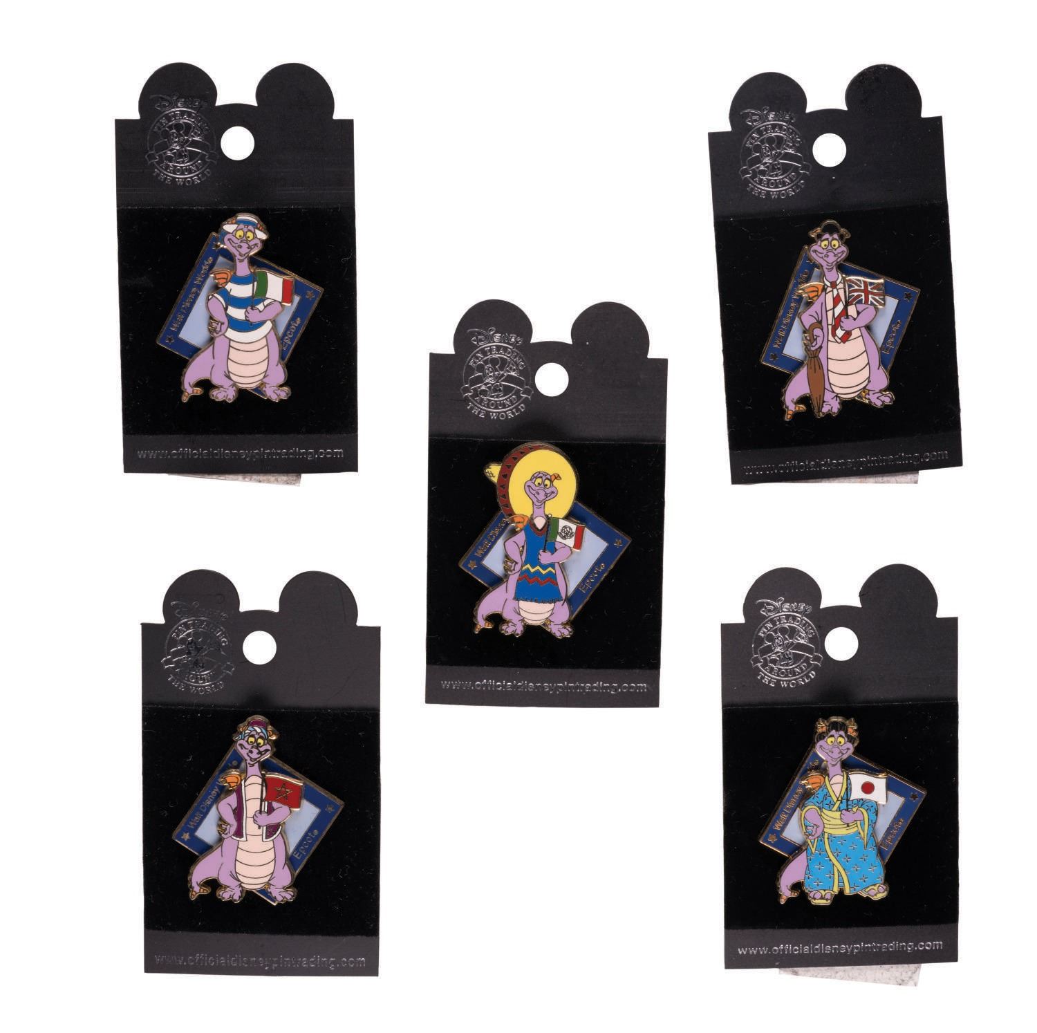 (EPCOT, 2004) A collection of (5) souvenir pins celebrating the different countries at the EPCOT World Showcase. Each pin depicts the beloved Figment in attire from a specific country and holding their respective flag. The countries depicted are Great Britain, Italy, Mexico, Japan and Morocco. The pins all come on their original backing cards, and measure approximately 1.75"x1.5" each. The condition is very good overall.