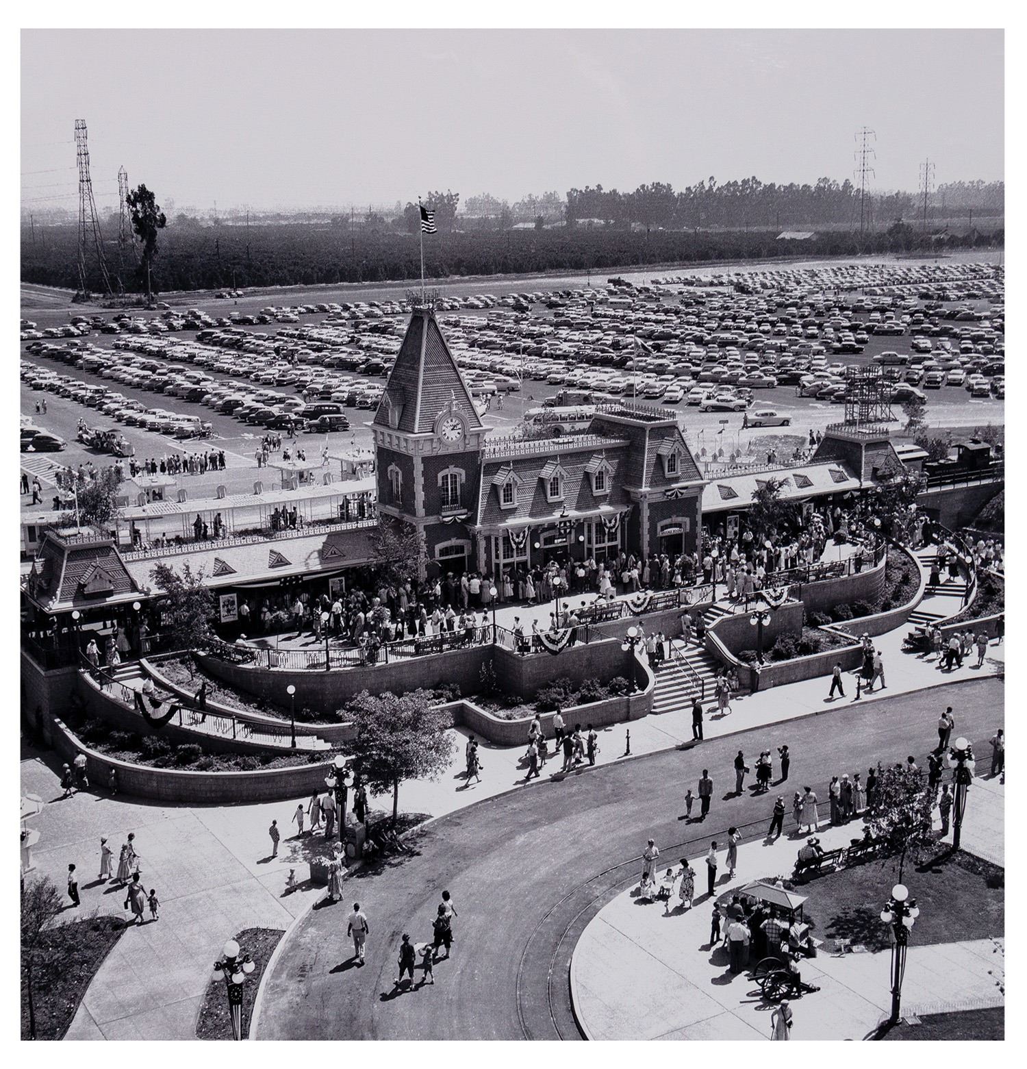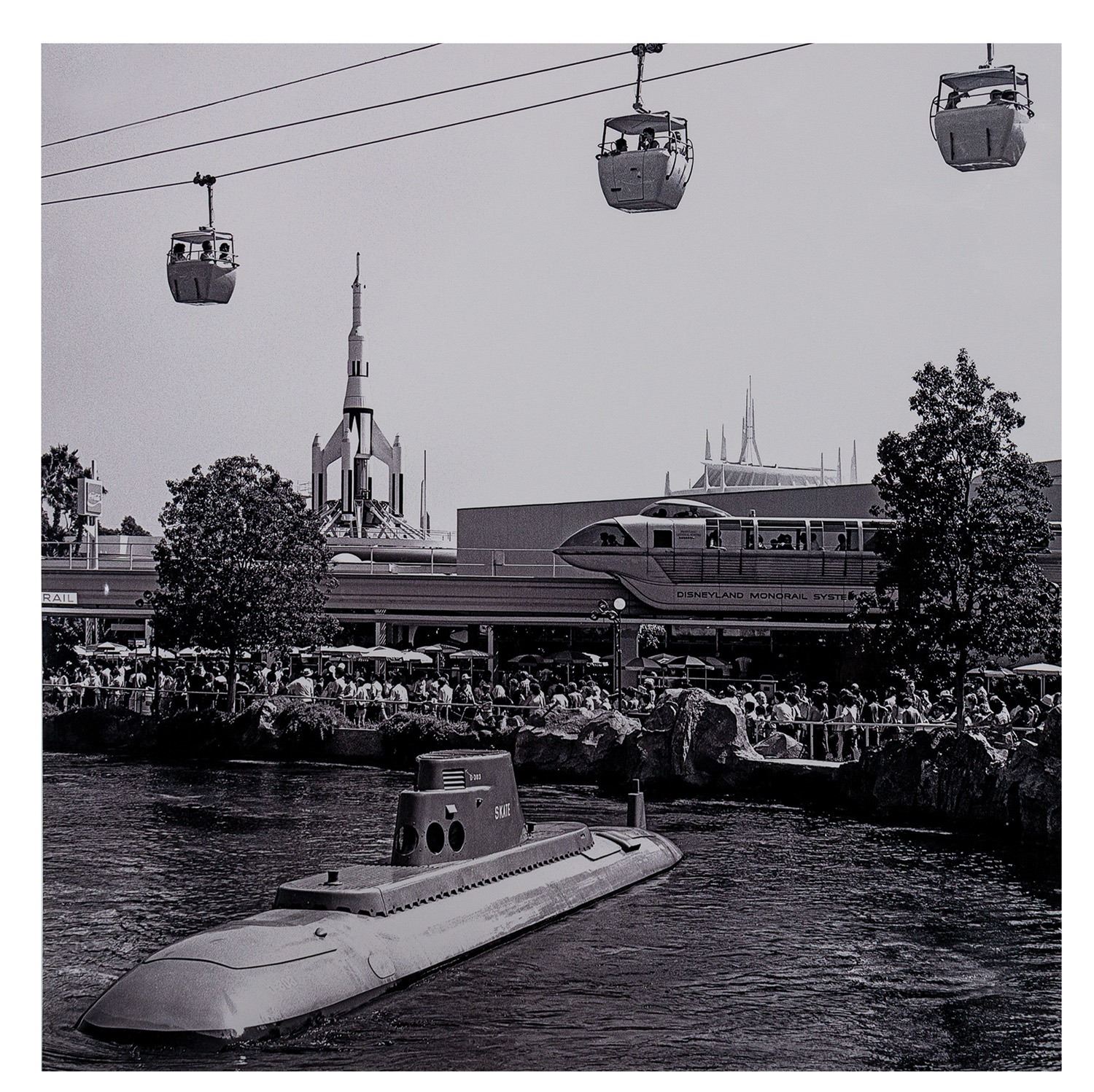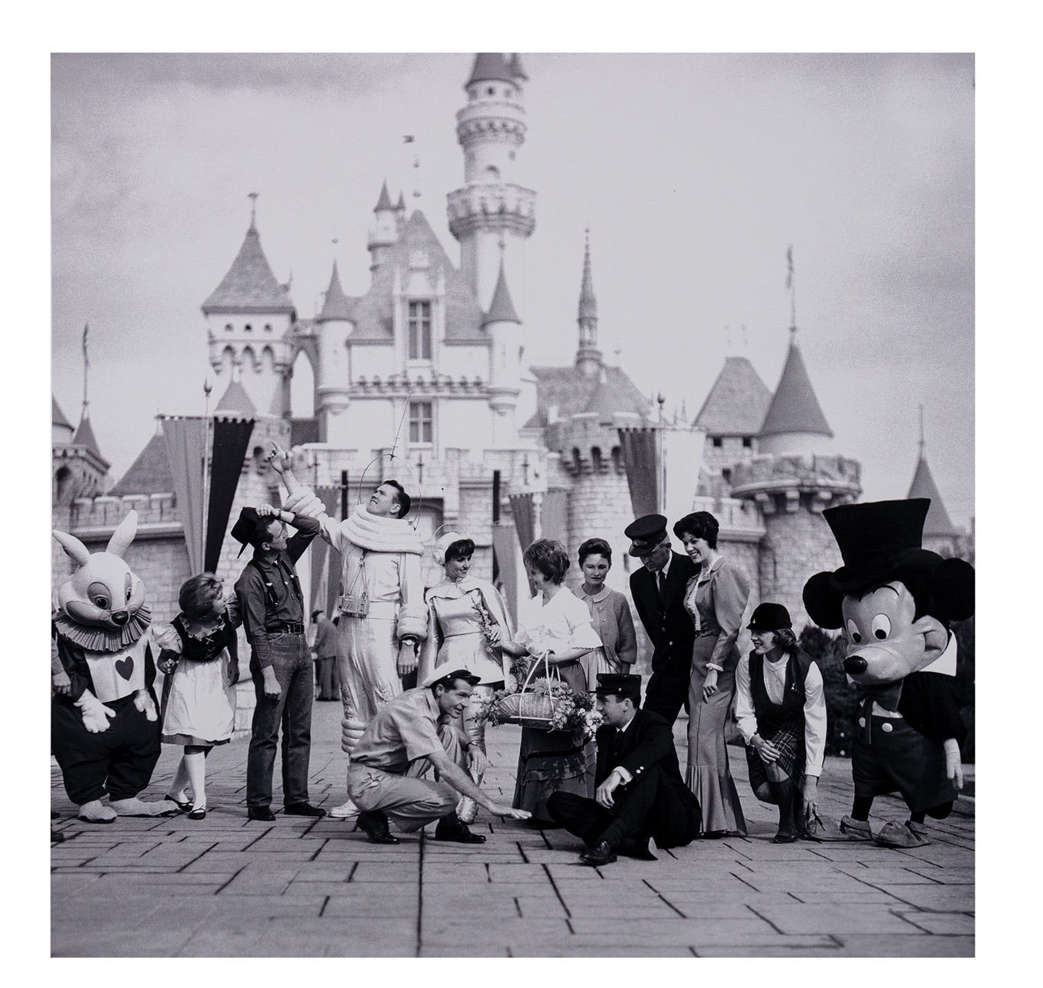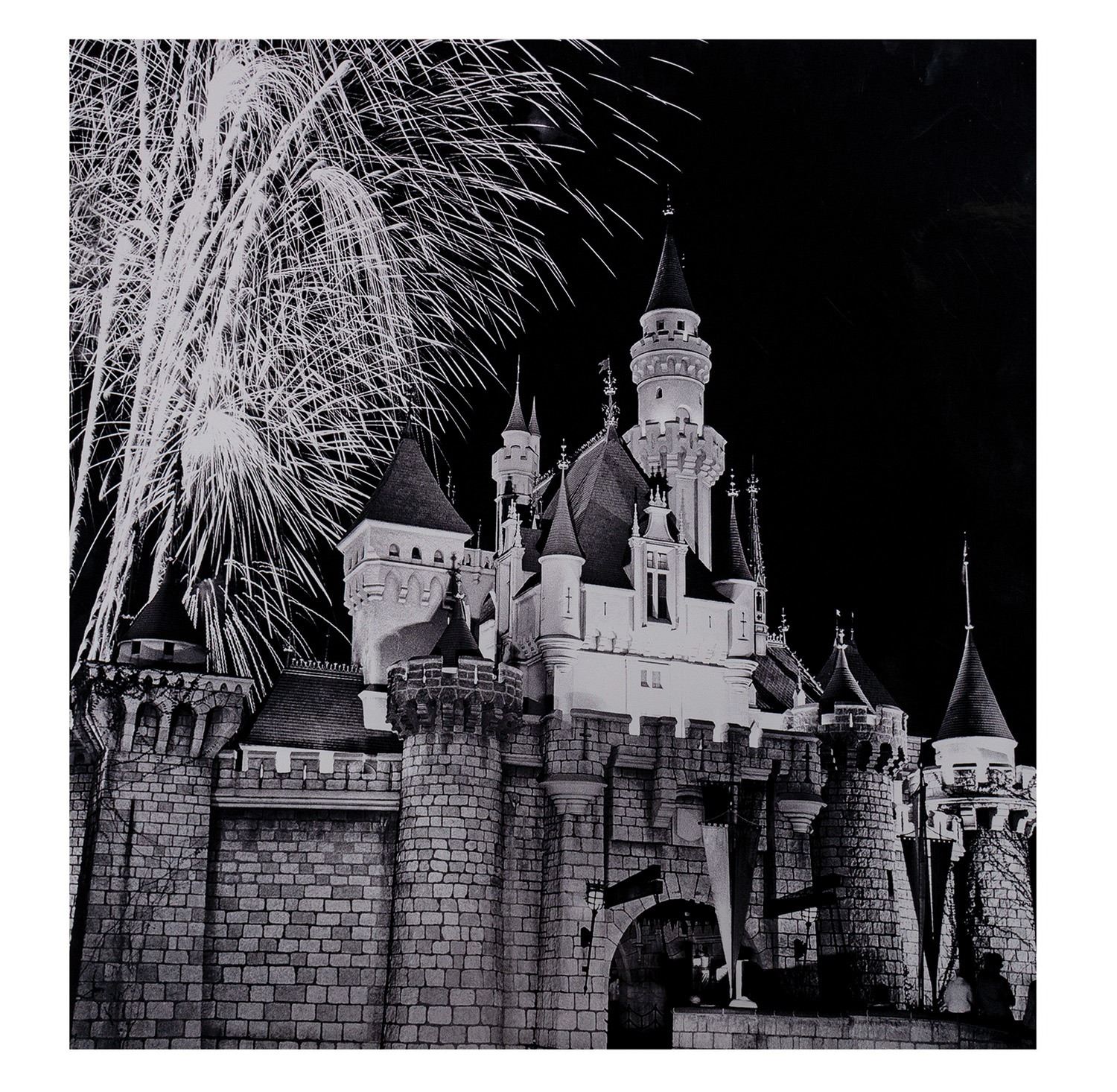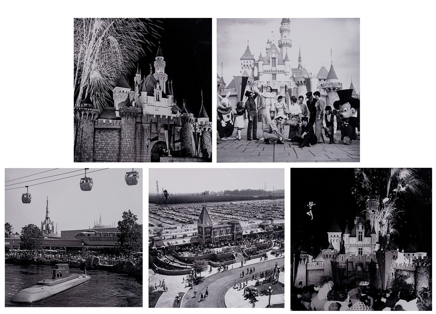 (Disneyland, 2005) A set of (5) large high-quality photos that represent significant Disneyland attractions and lands from the early years of the park. The photos come from the collection of Paul Hiffmeyer who was the chief photographer at Disneyland Resort during the park's 50th anniversary. The imagery of these black and white photos is attributed to the 1950s-60s, and were likely used by Hiffmeyer as reference or as part of a special event. The set includes two photos of Sleeping Beauty Castle, as well as imagery of the entrance to the park, Tomorrowland, and Disneyland cast members in front of the Sleeping Beauty Castle. Each of these photos measure 21"x21" and the set is in very good condition with minor wear from use.