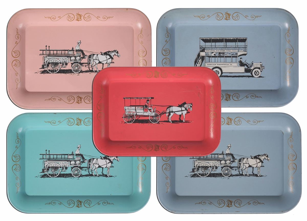 (Disneyland, 1950s) Collection of (5) Main Street transportation-themed tin trays including (3) horse-drawn fire cart trays in different colors, (1) blue Omnibus tray, and (1) red horse and carriage tray. Trays measure 4.75"x6.75" each. Set is in good condition with some wear from use.