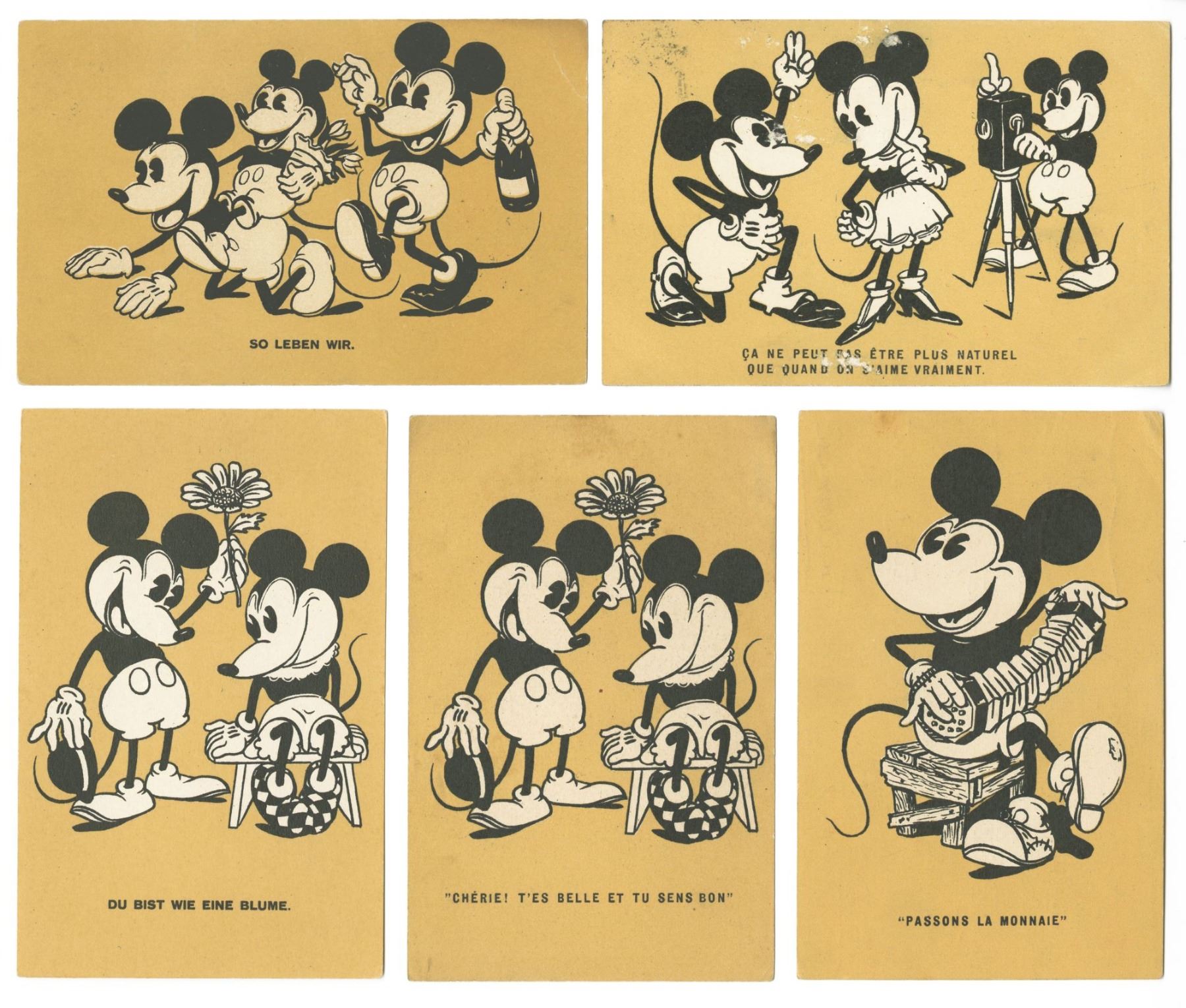 (W. Hagelberg A.G., 1930s) A collection of (5) German and French Mickey Mouse postcards produced in the early 1930s. These cards depict Mickey and Minnie Mouse in various scenes with a short line beneath the image. Some cards have been used, and include the message and postmark on the back. The postcards measure 3.5"x5.5" and are in very good condition with expected edge and surface wear from age.