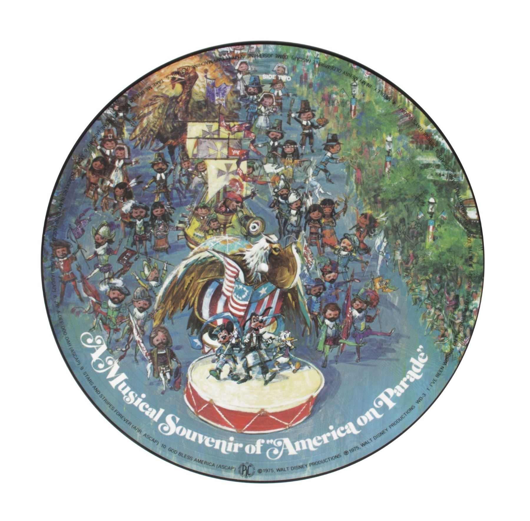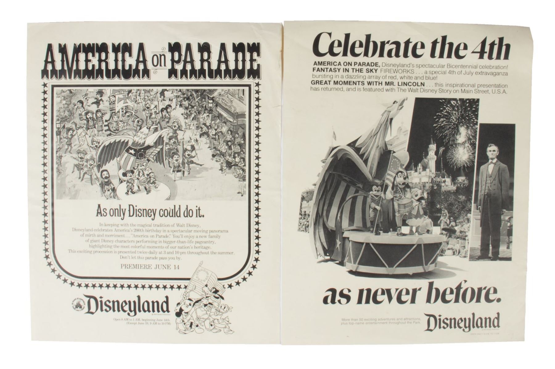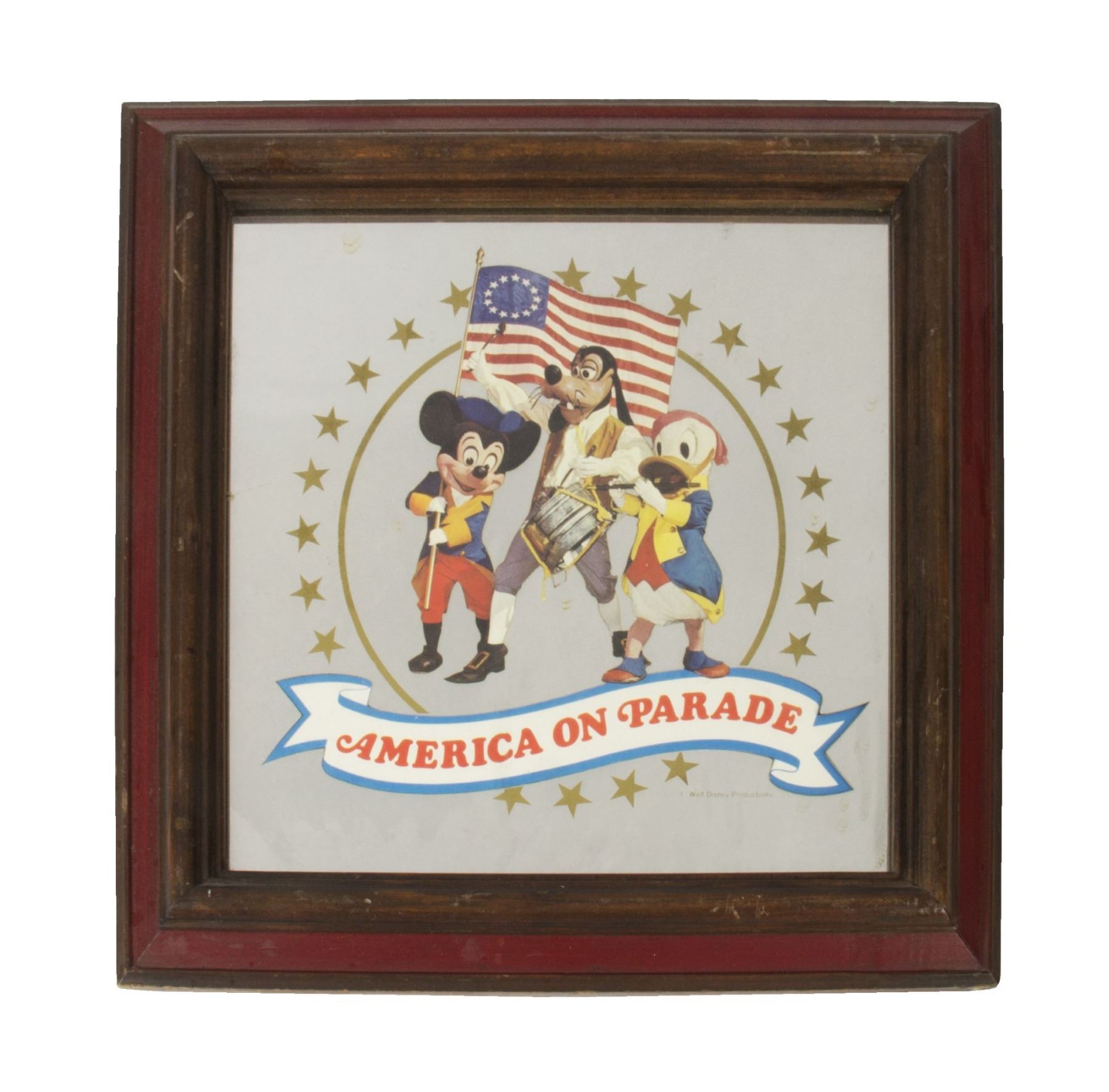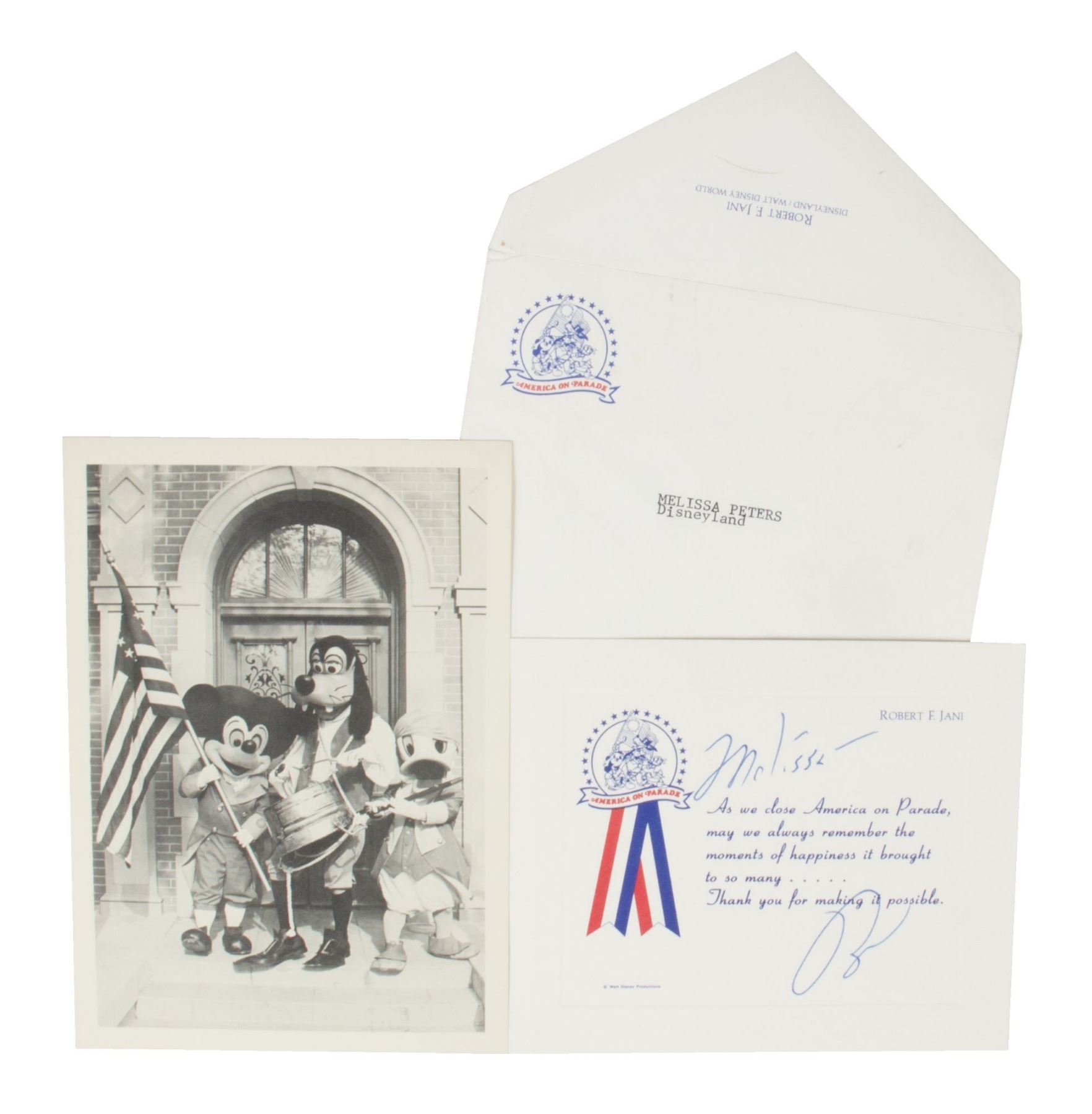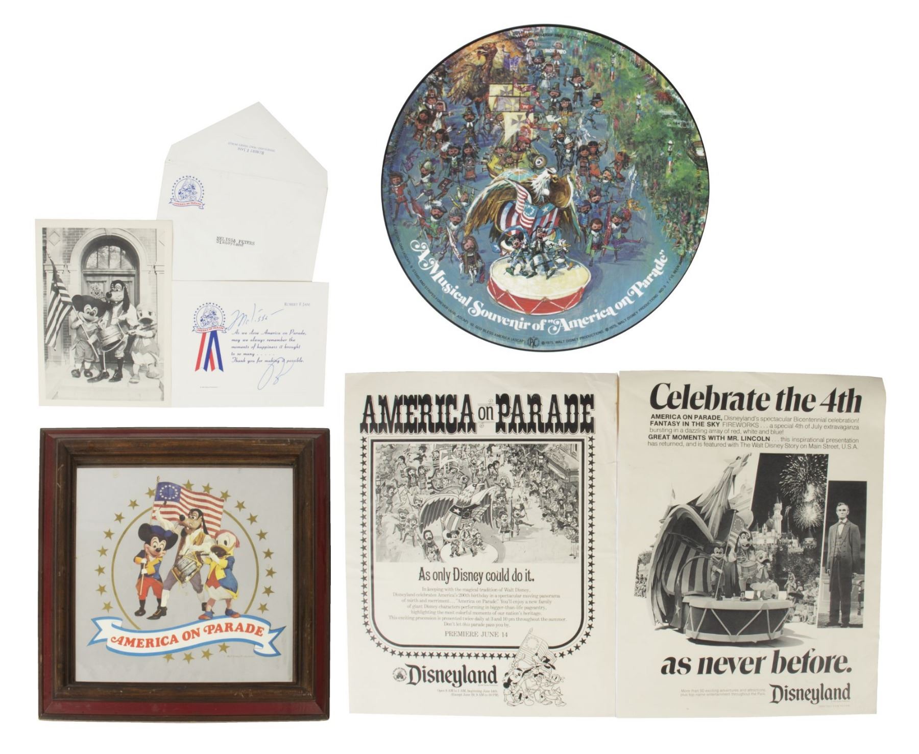 (Disneyland, 1975-76) A collection of (6) souvenirs and other related items from Disneyland's "America on Parade". This special parade celebrated the American Bicentennial and lasted from June of 1975 until September of 1976. Included in this collection are: (2) posters used to promote the new parade, a souvenir picture record, a promotional photo card, a framed mirror-backed photo, and a signed letter from creative director of Walt Disney Productions Robert Jani to a "Melissa", regarding the closing of America on Parade and offering Melissa thanks for her effort. The posters measure 14.5"x11.25" and the framed mirror photo measures 11.75"x11.75". The condition is good overall with some edge-wear and adhesive discoloration to the backs of the posters.