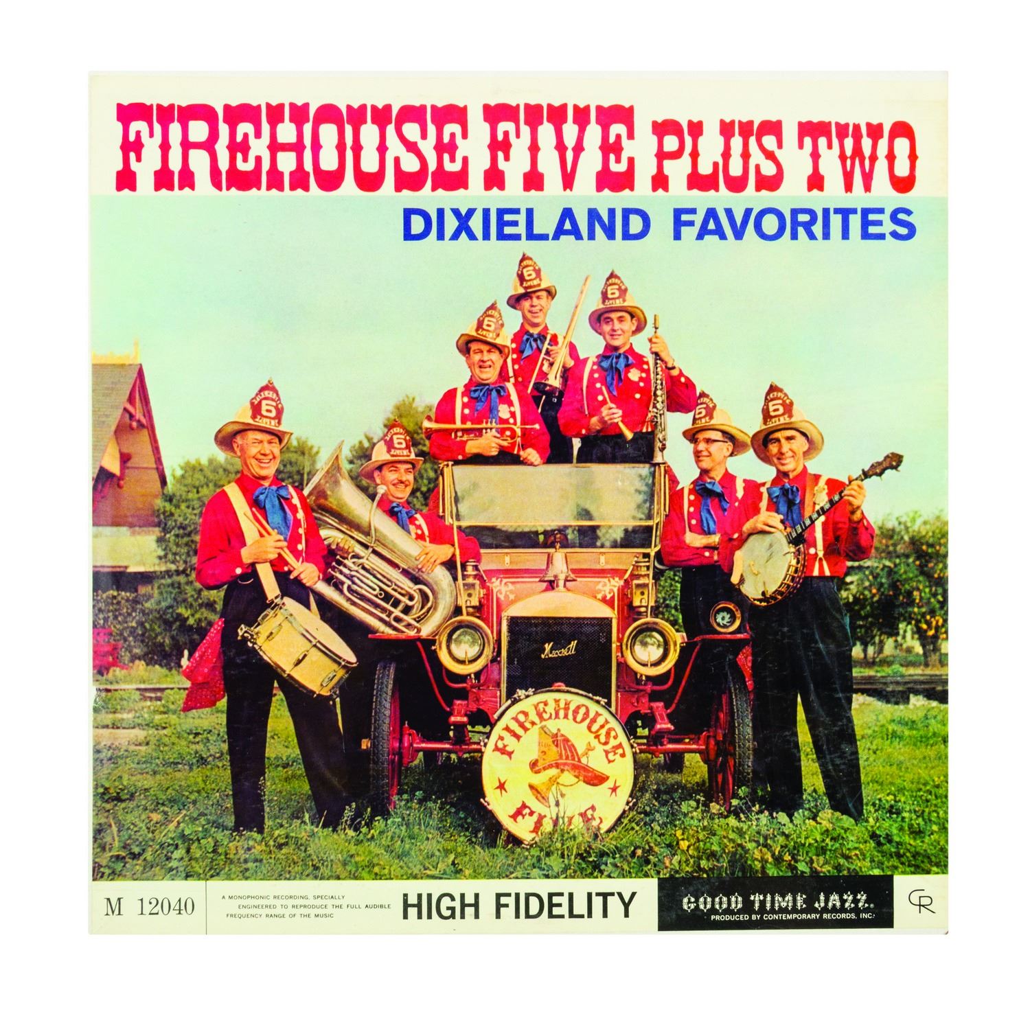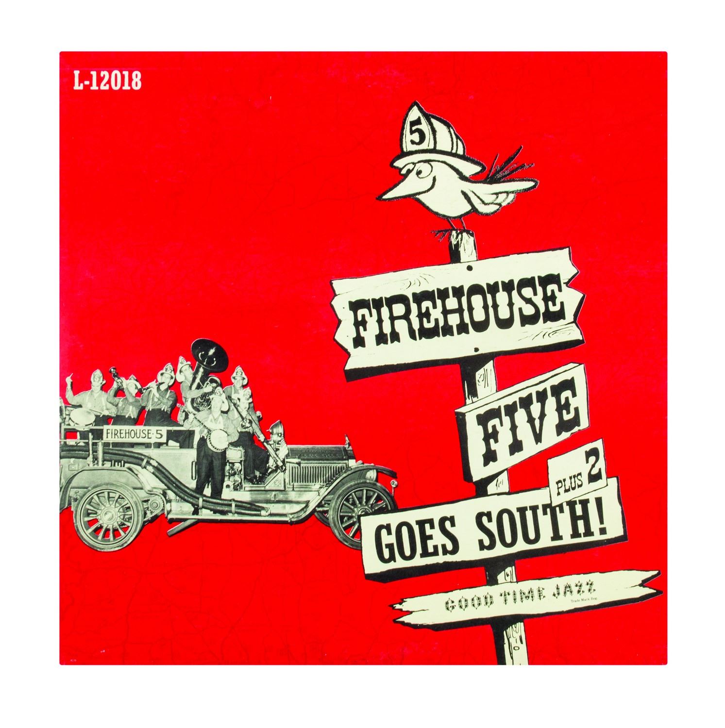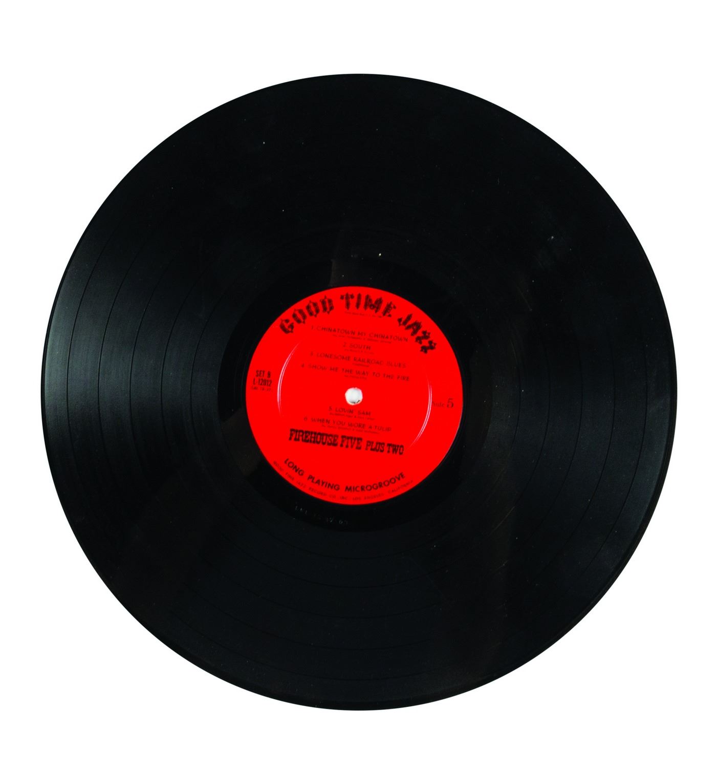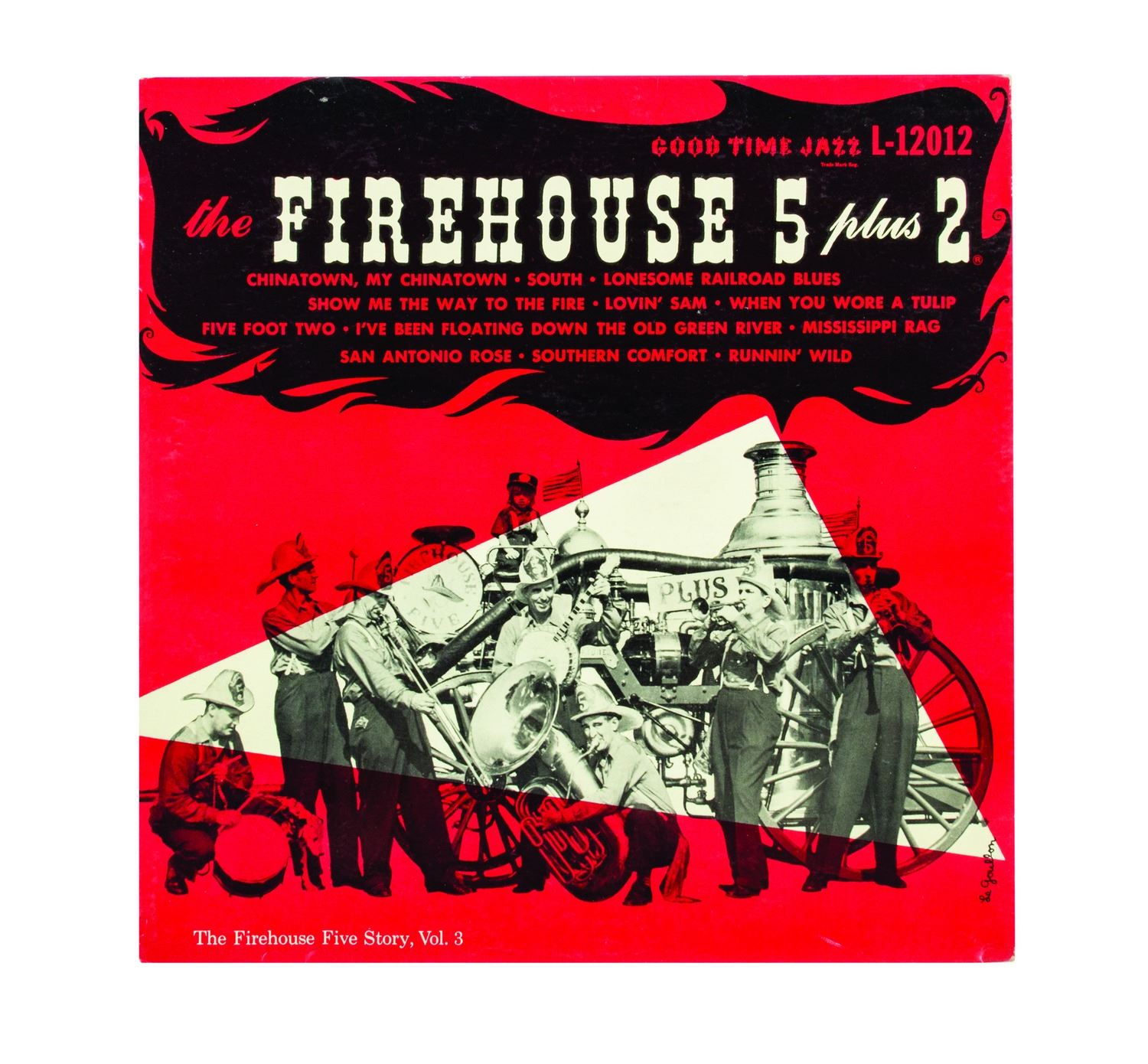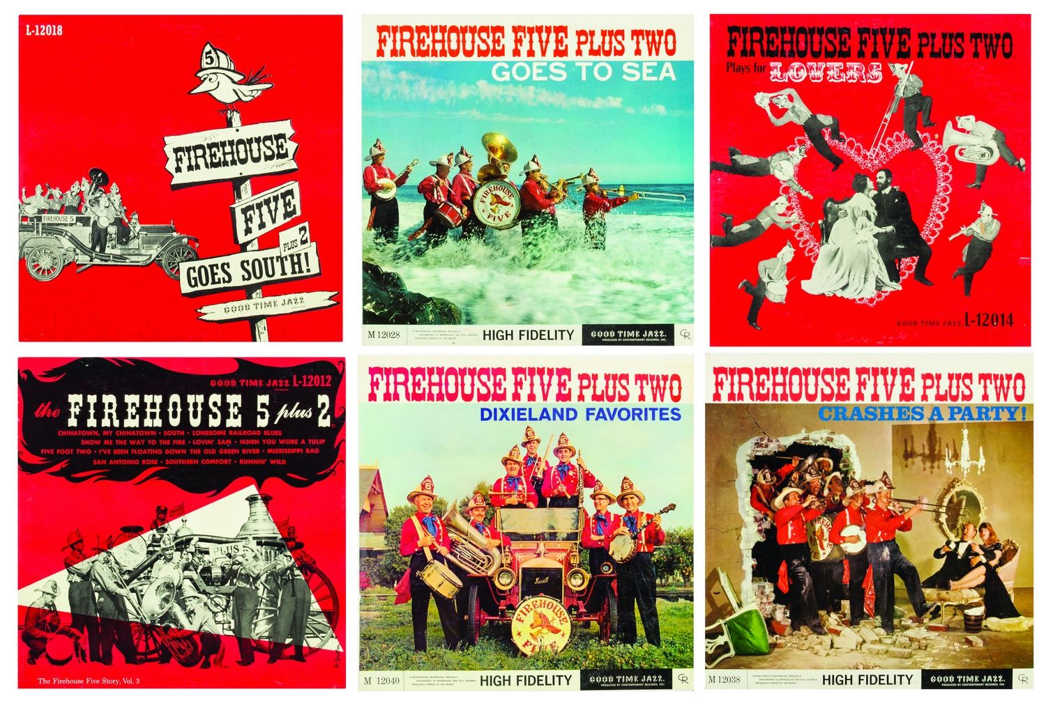 (Good Time Jazz Record Co., 1955-60) A collection of (6) Firehouse Five Plus Two 12-inch LP records in their original sleeves. This collection includes the titles, Firehouse Five Plus Two "Goes to Sea", "Goes South", "Plays for Lovers", "Crashes a Party", as well as "Dixieland Favorites" and "The Firehouse Five Story, Vol. 3". The 12-inch vinyl records are in 12.5"x12.5" sleeves. The condition of the records is very good with minor surface scratches and scuffing. The condition of the sleeves is very good with expected edge-wear and some splitting of the seams.
