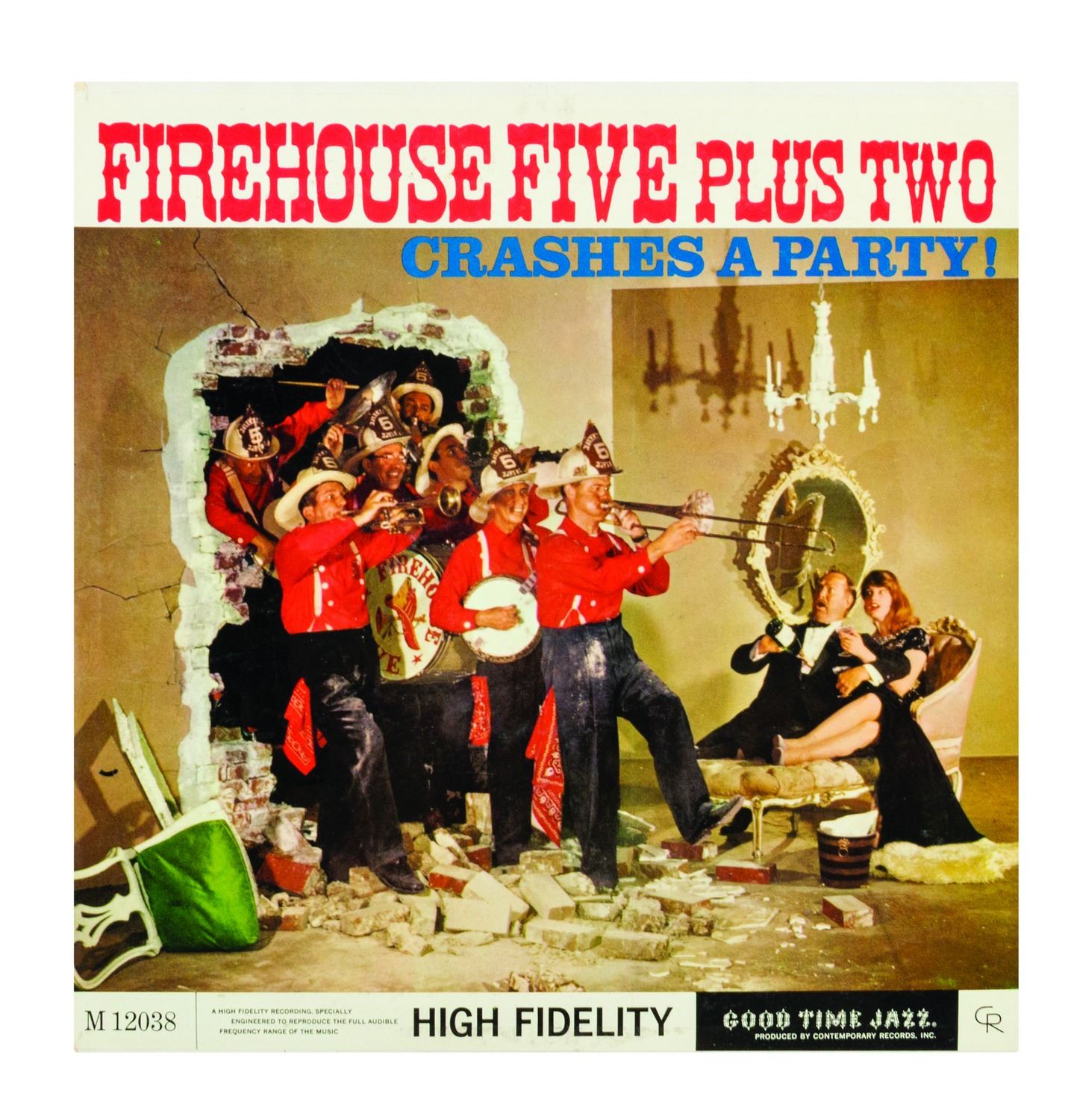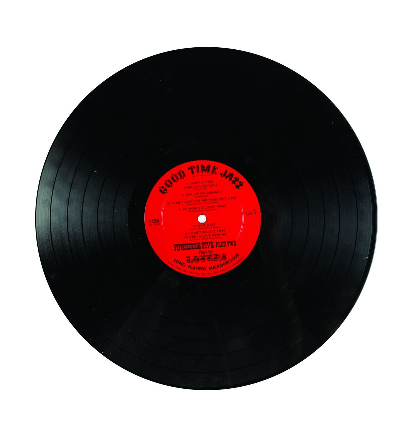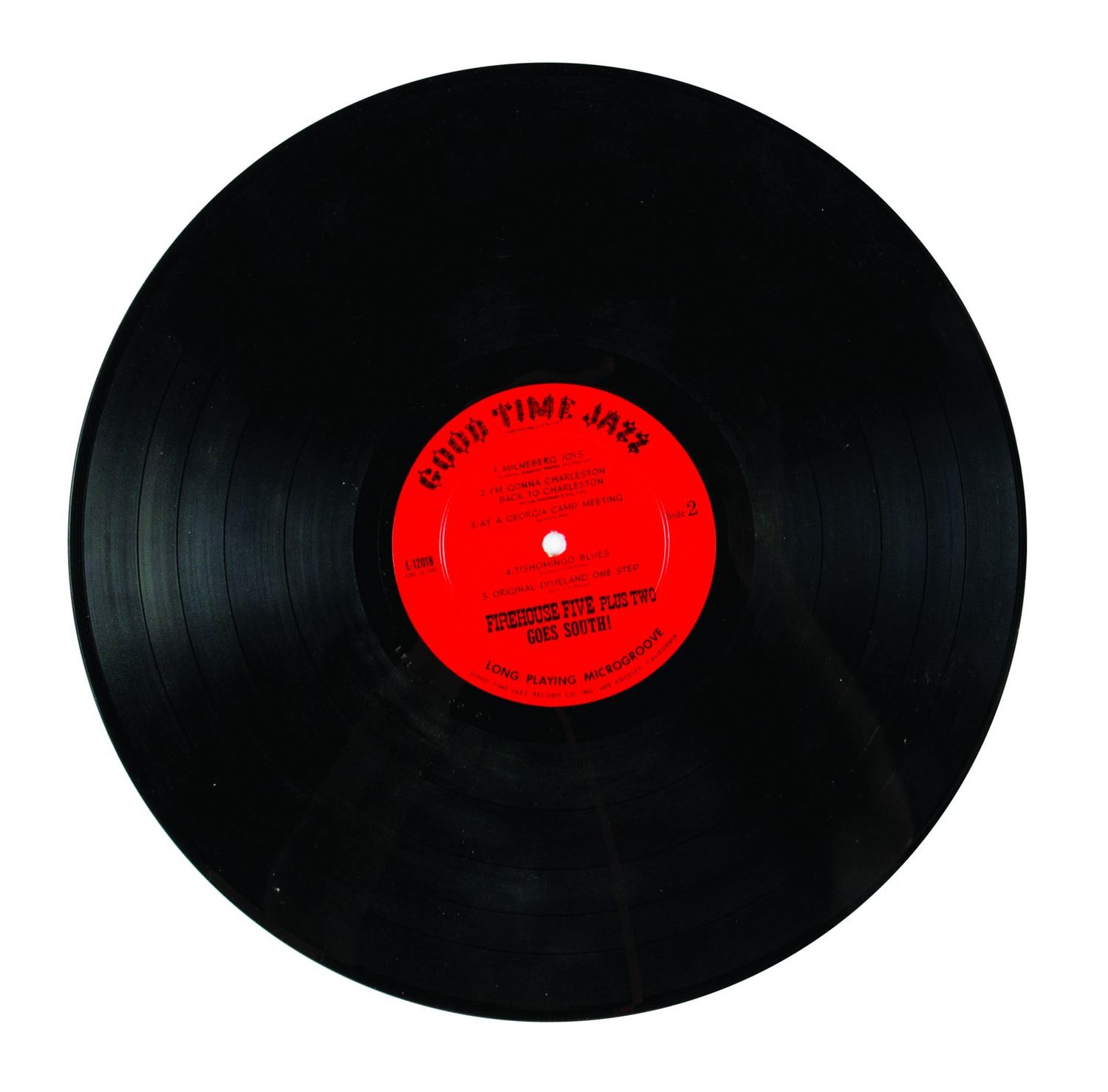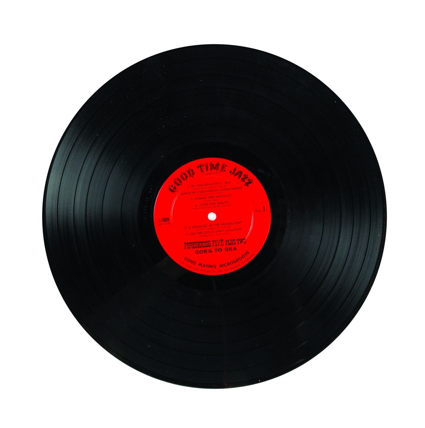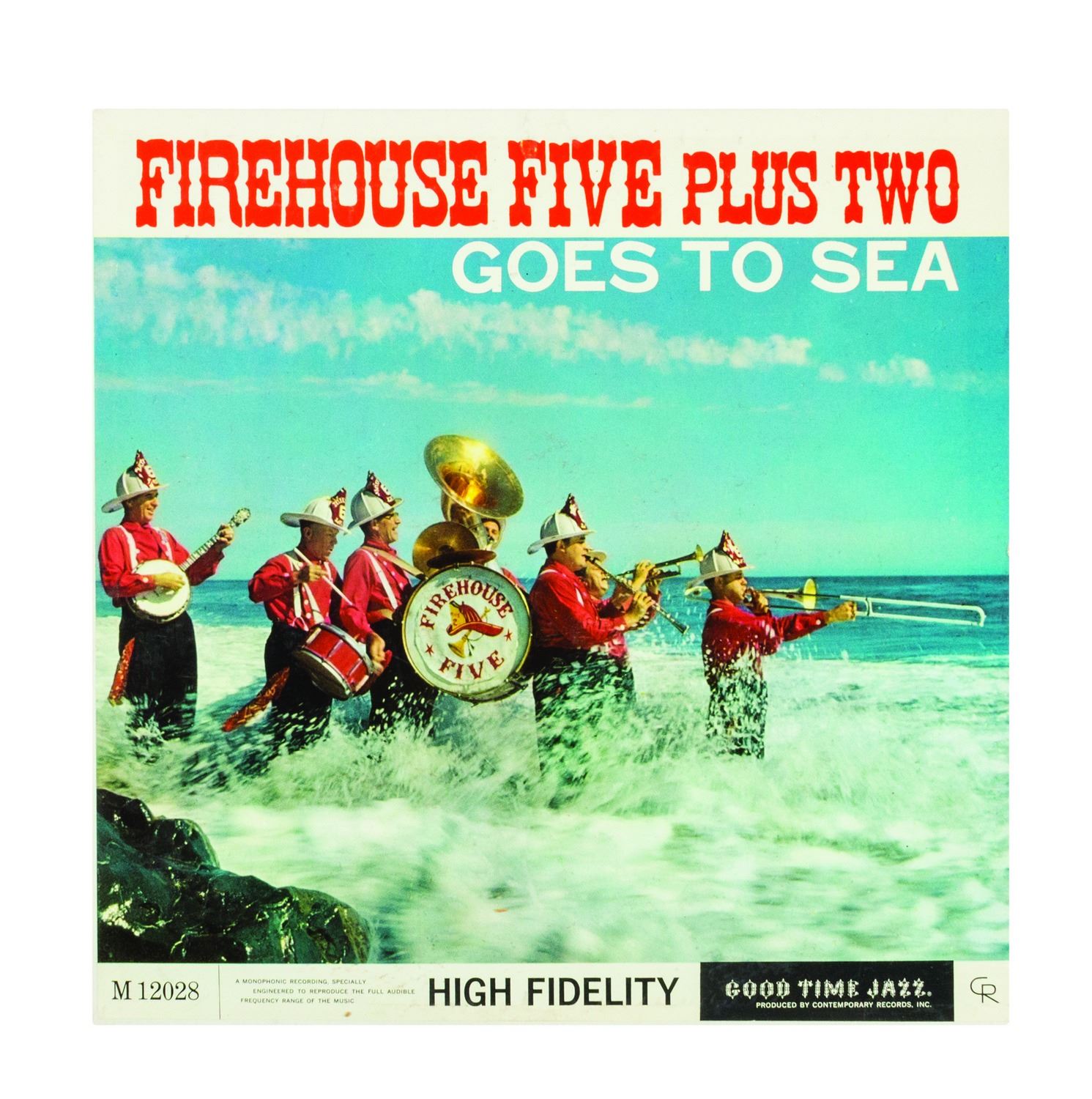 (Good Time Jazz Record Co., 1955-60) A collection of (6) Firehouse Five Plus Two 12-inch LP records in their original sleeves. This collection includes the titles, Firehouse Five Plus Two "Goes to Sea", "Goes South", "Plays for Lovers", "Crashes a Party", as well as "Dixieland Favorites" and "The Firehouse Five Story, Vol. 3". The 12-inch vinyl records are in 12.5"x12.5" sleeves. The condition of the records is very good with minor surface scratches and scuffing. The condition of the sleeves is very good with expected edge-wear and some splitting of the seams.