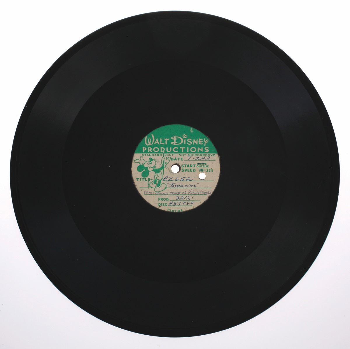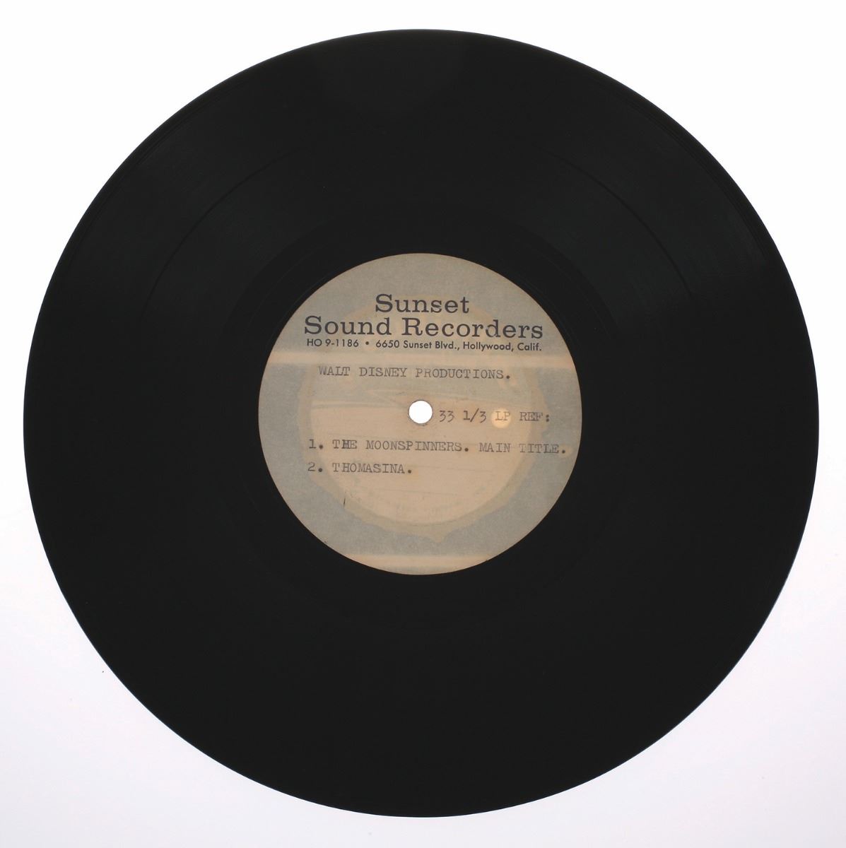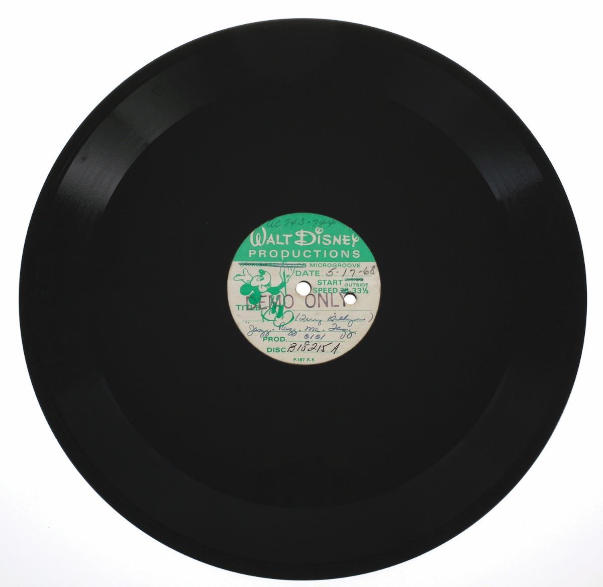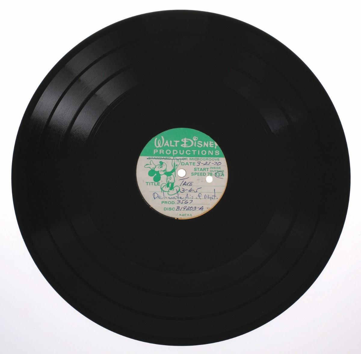 (Walt Disney Studios, 1960s) Collection of six (6) master records from Terry Gilkyson. Records include ARISTOCATS "Jazz Razz Ma Tazz"dated 5-17-1968, "Tomasina" dated 7-22-1963, "Hate Song" dated 9-25-1963, "Delicate Air of Mystery" (take 3,4, & 5) dated 3-25-1970, "Bayou Boy" dated 6-9-1970, and a 10" recording of "Moonspinner" and Thomasina" on Sunset Sound Recorders label. (all others ar 12" records on Walt Disney Productions labels).