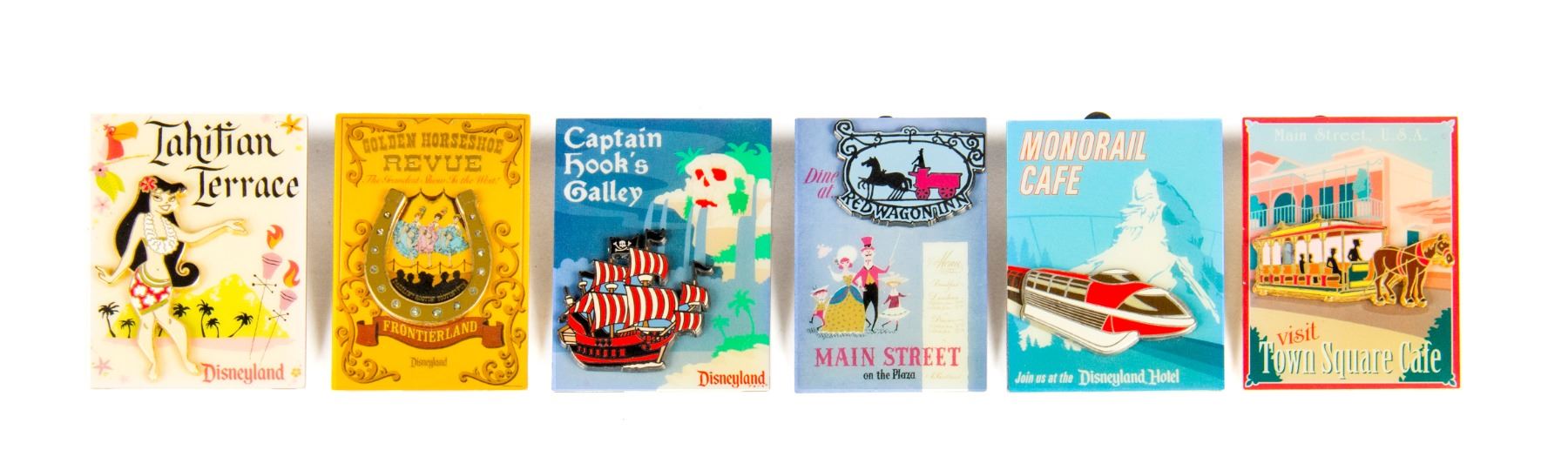 (Disneyland, 2004) A collection of (6) annual passholder exclusive limited edition attraction poster pins. The pins depict "Captain Hook's Galley", the "Monorail Cafe", "Golden Horseshoe Revue", "Town Square Cafe", "Red Wagon Inn", and "Tahitian Terrace". Each pin was created in an edition of 10,000, and measures 2"x1.5". The condition is very good with minor wear.