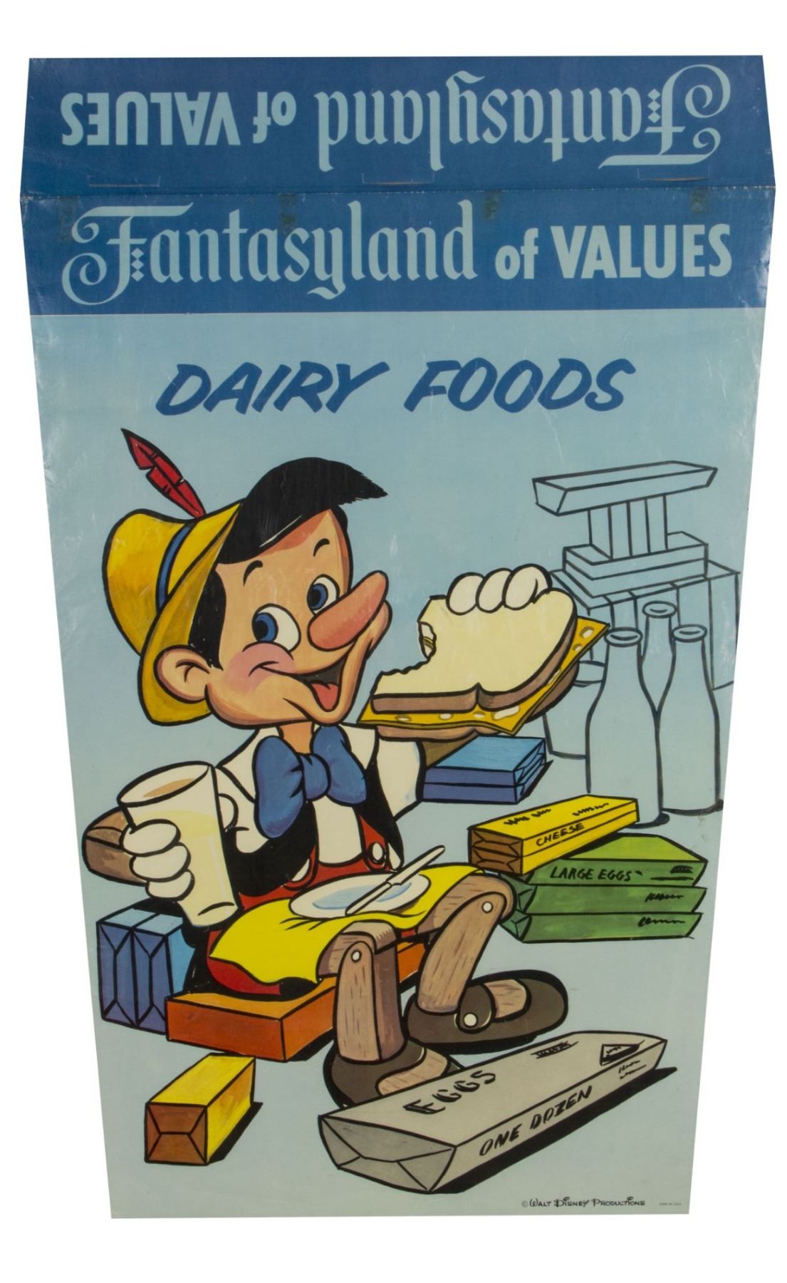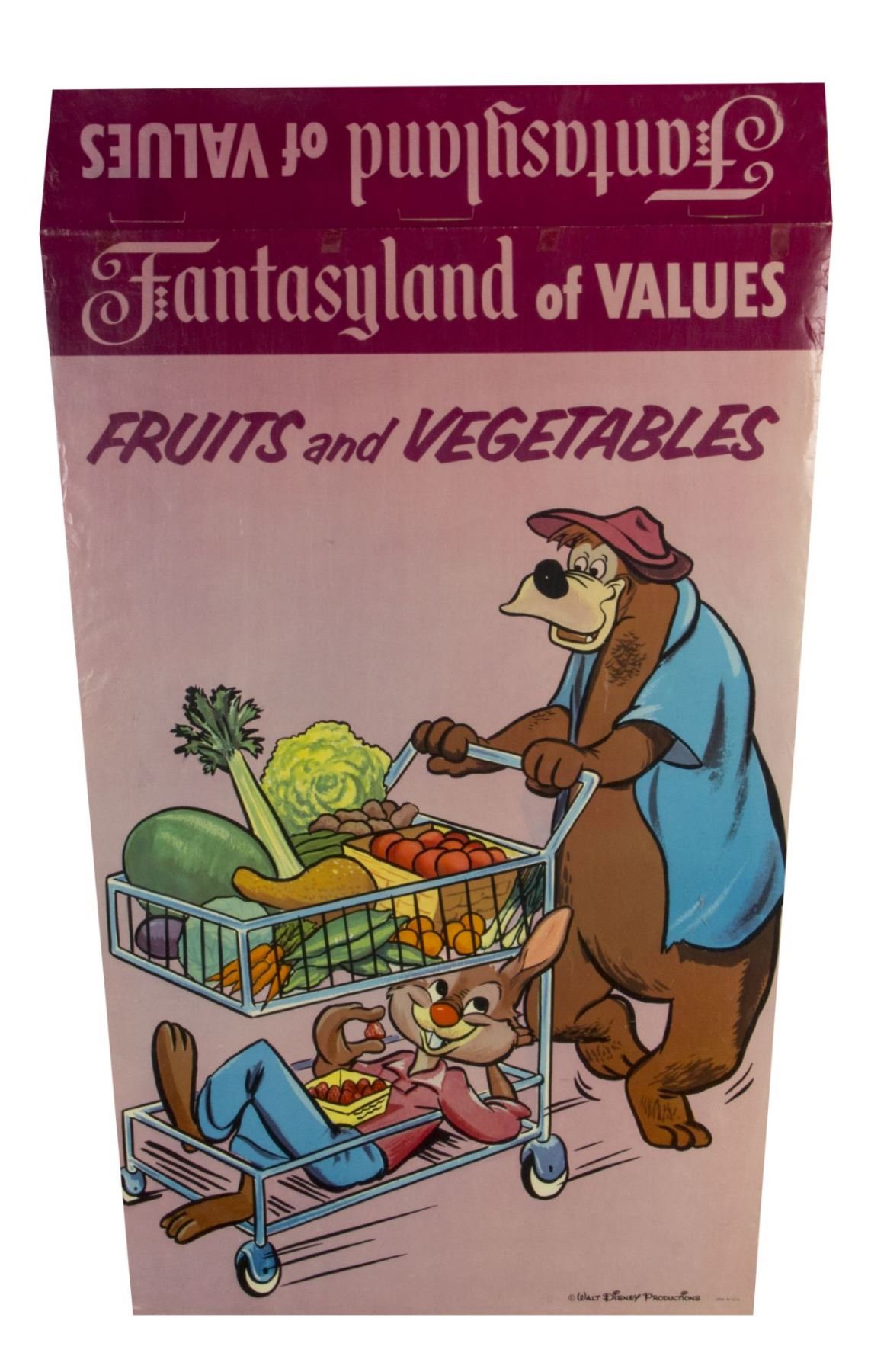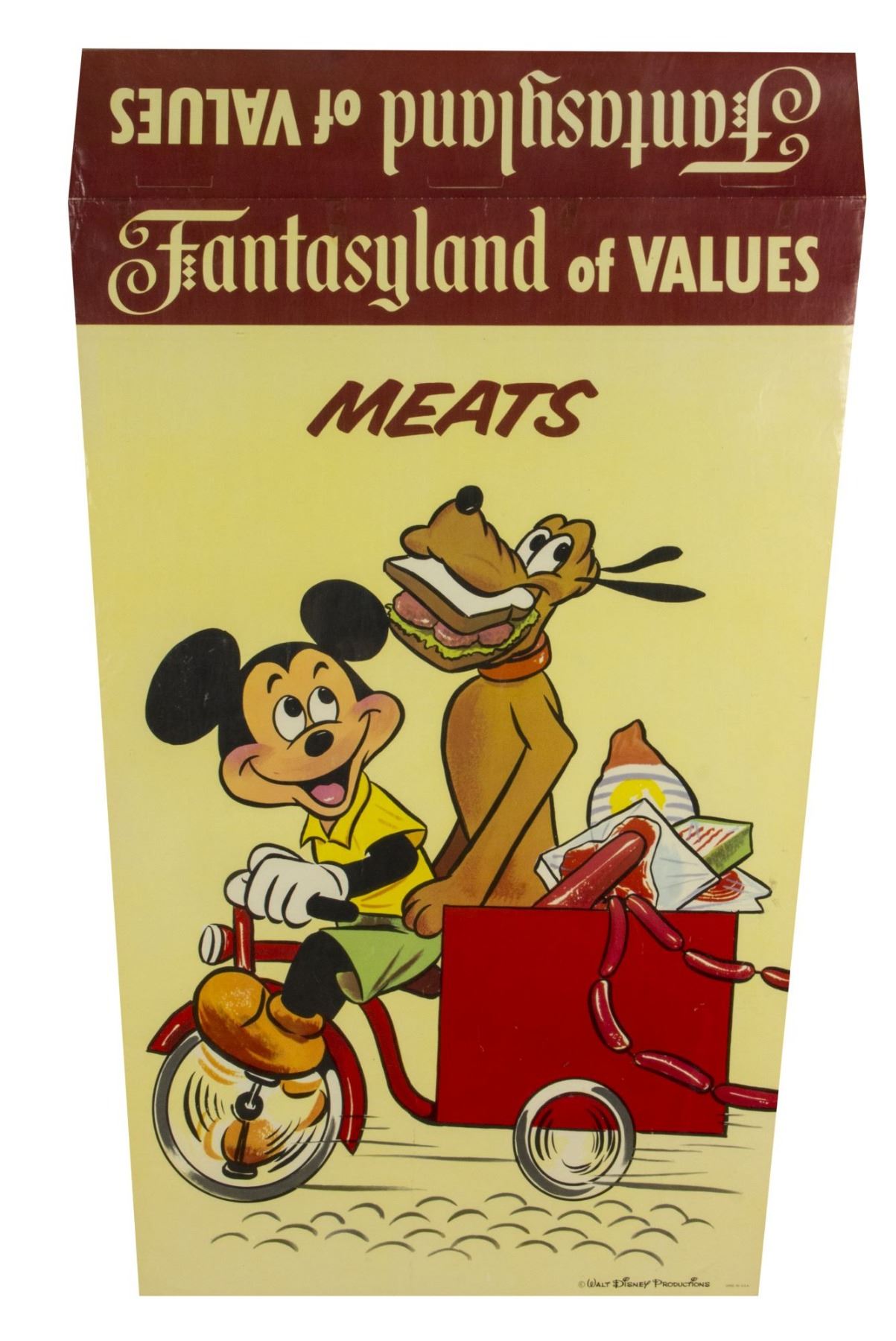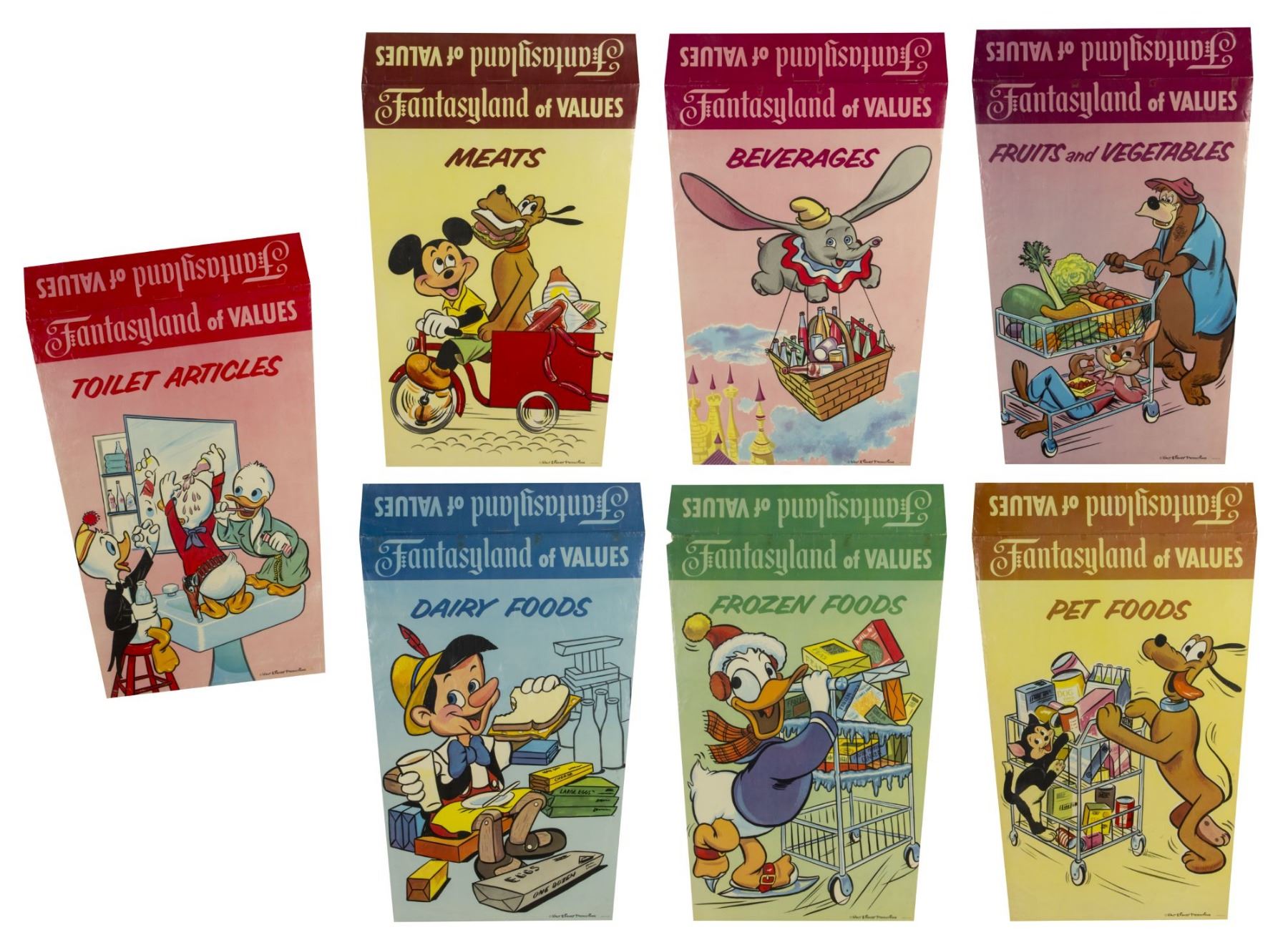(Disneyland, c.1960) A collection of (7) paper grocery store display signs featuring various Disney characters. These signs were once used as part of a grocery store promotion of Disneyland and feature the title "Fantasyland of Values" on each sign. The lithographic signs have an additional flap over the top edge to allow the signs to be hung above their respective aisles. Measuring approximately 29.5"x21.75" each, the signs are in good condition with some edge-wear and creasing from use.
