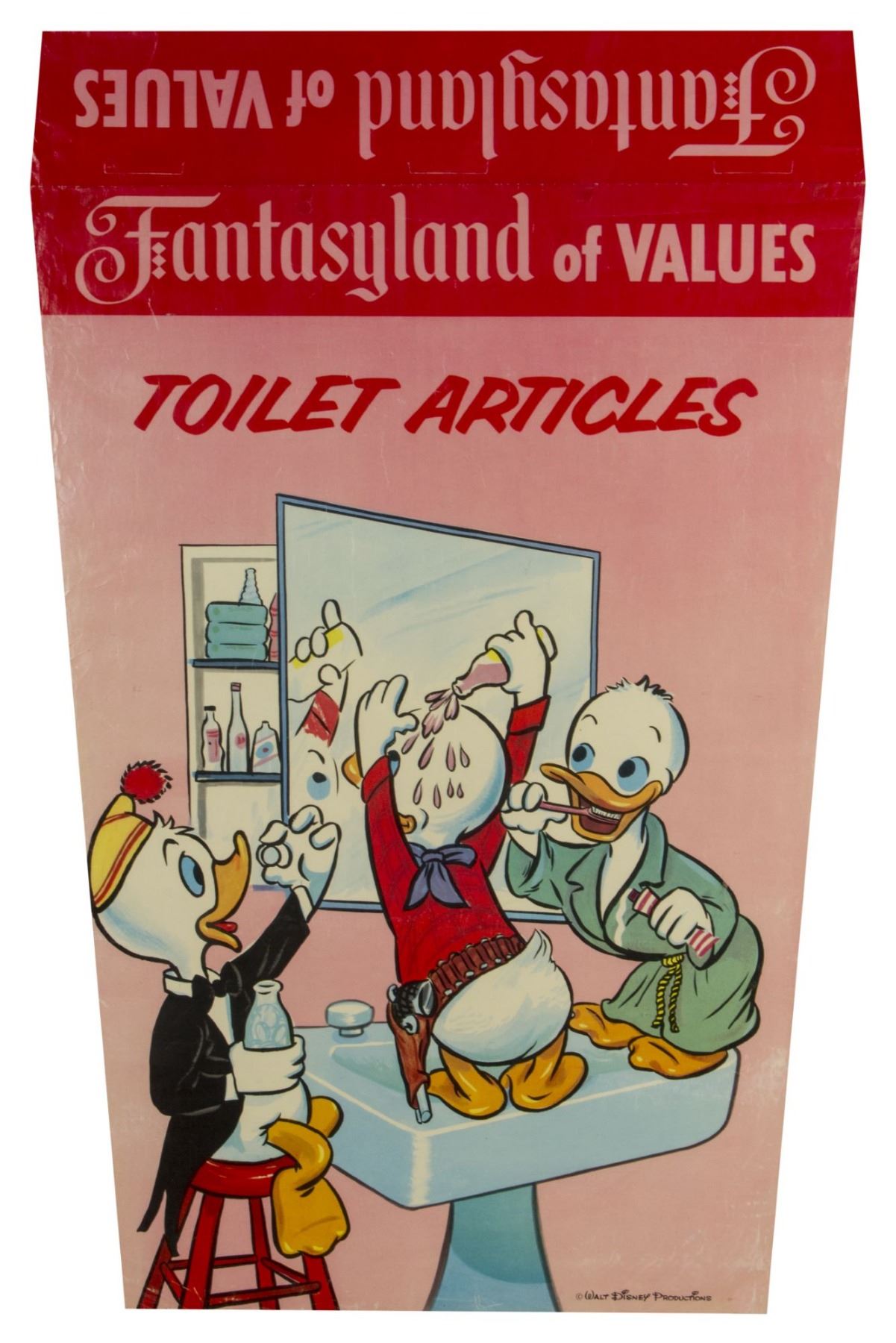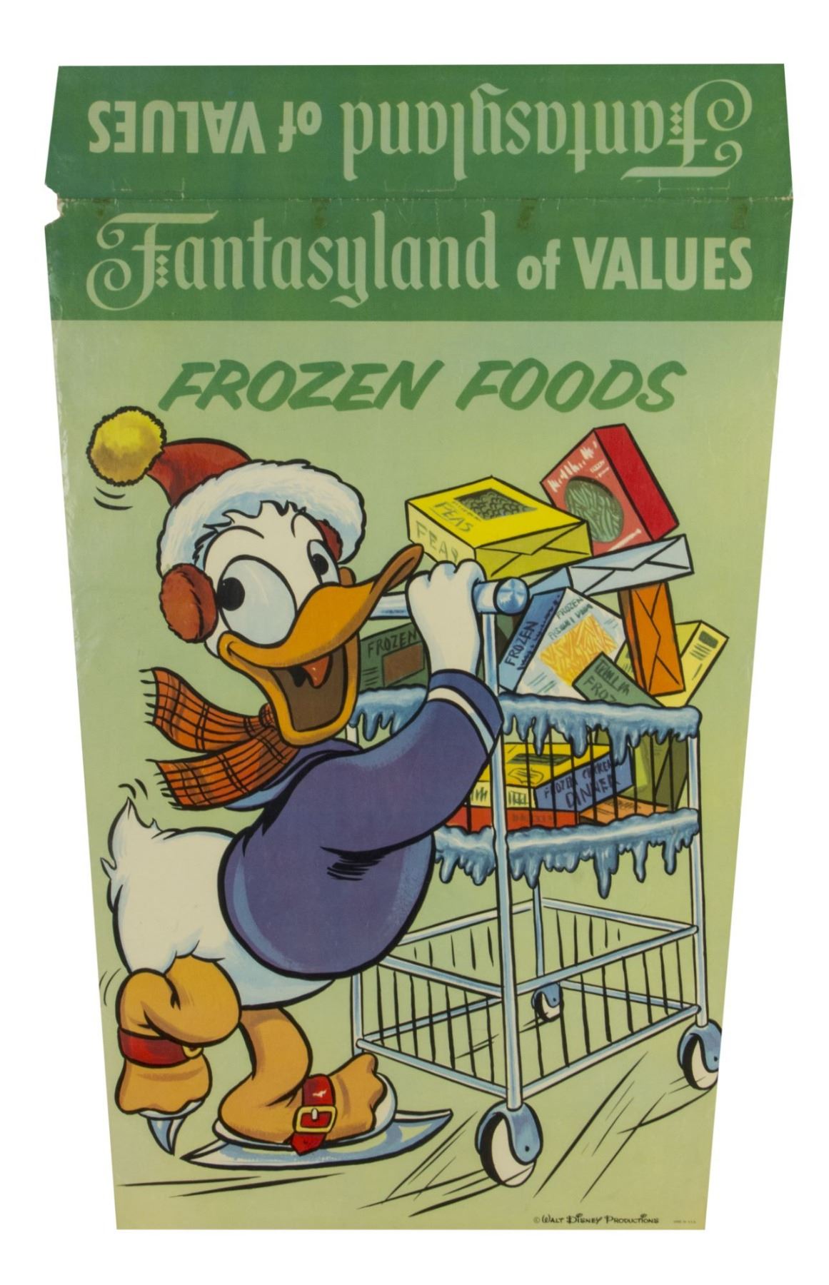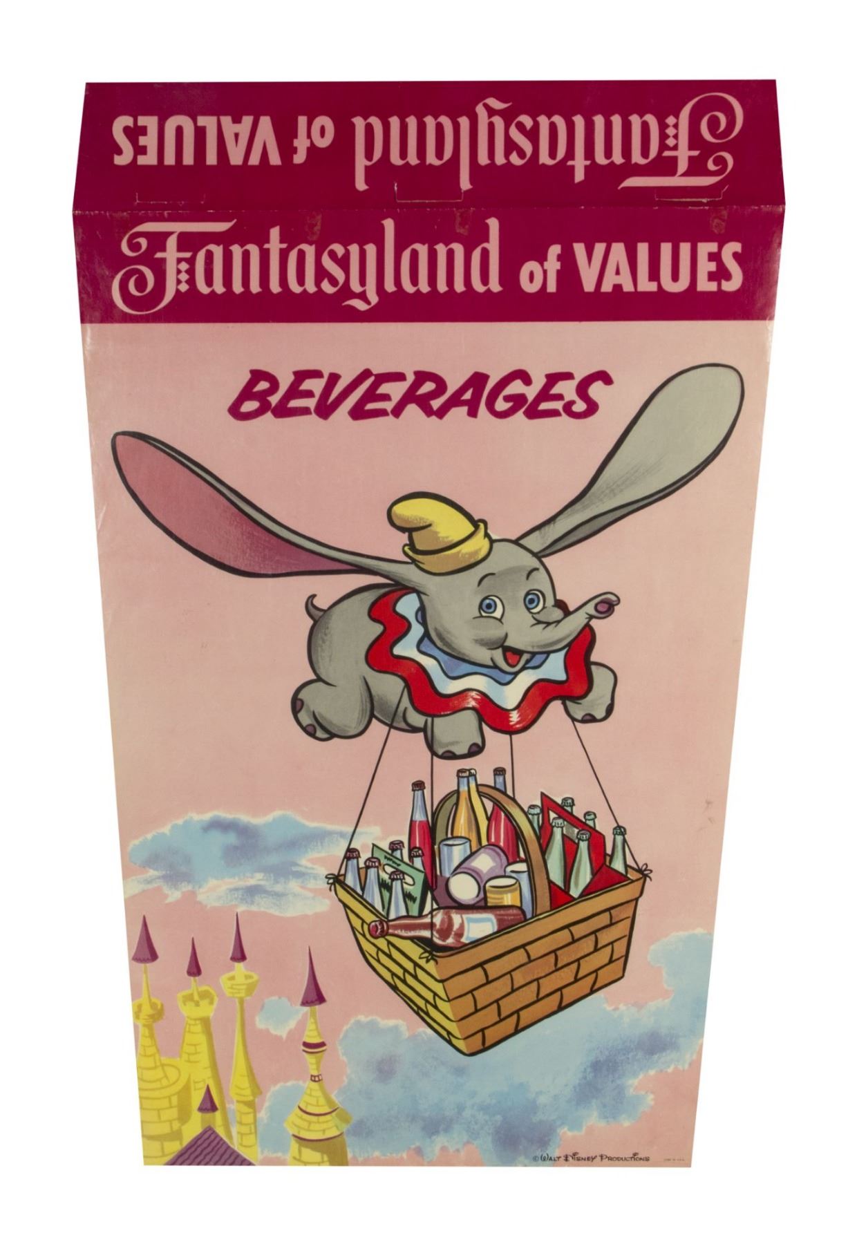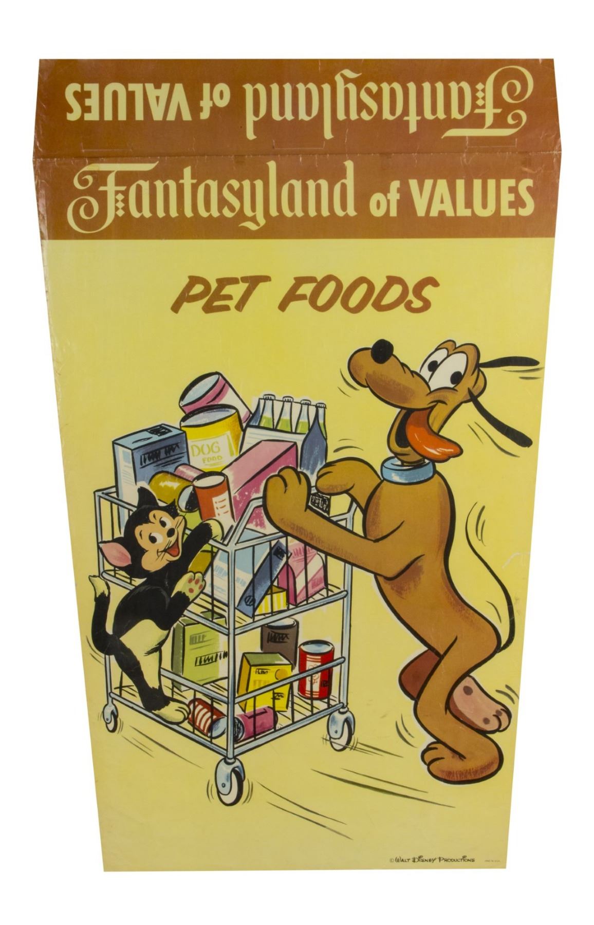 (Disneyland, c.1960) A collection of (7) paper grocery store display signs featuring various Disney characters. These signs were once used as part of a grocery store promotion of Disneyland and feature the title "Fantasyland of Values" on each sign. The lithographic signs have an additional flap over the top edge to allow the signs to be hung above their respective aisles. Measuring approximately 29.5"x21.75" each, the signs are in good condition with some edge-wear and creasing from use.