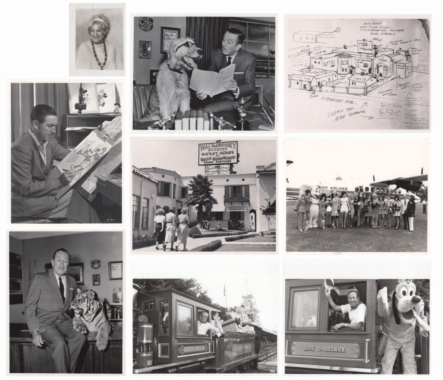 (Disney, c.1960s-80s) A collection of (9) silver gelatin fiber-based and RC photographs from the Disney Photo Archives. The set includes two vintage publicity prints of Walt with animals (one with a tiger and another with the canine star of the telefilm Kilroy), later prints of Walt drawing Mickey, the Walt Disney Hyperion Studio campus, 1934-35 plans for the Walt Disney Burbank Studios complex, and later prints of Mickey, Dumbo, Goofy, and Pluto doing airline publicity, Roy. E. Disney riding the Roy O. Disney locomotive, and Michael Eisner as the engineer of the Lilly Belle. The majority of the photos measure 10"x8" and have hand-written reference numbers on the reverse. The condition is good overall, with varying amounts of handling wear and small creases.