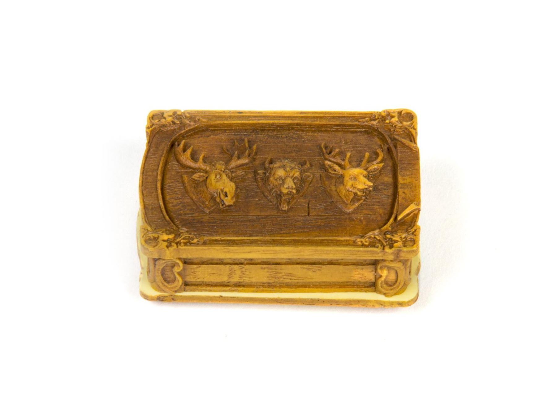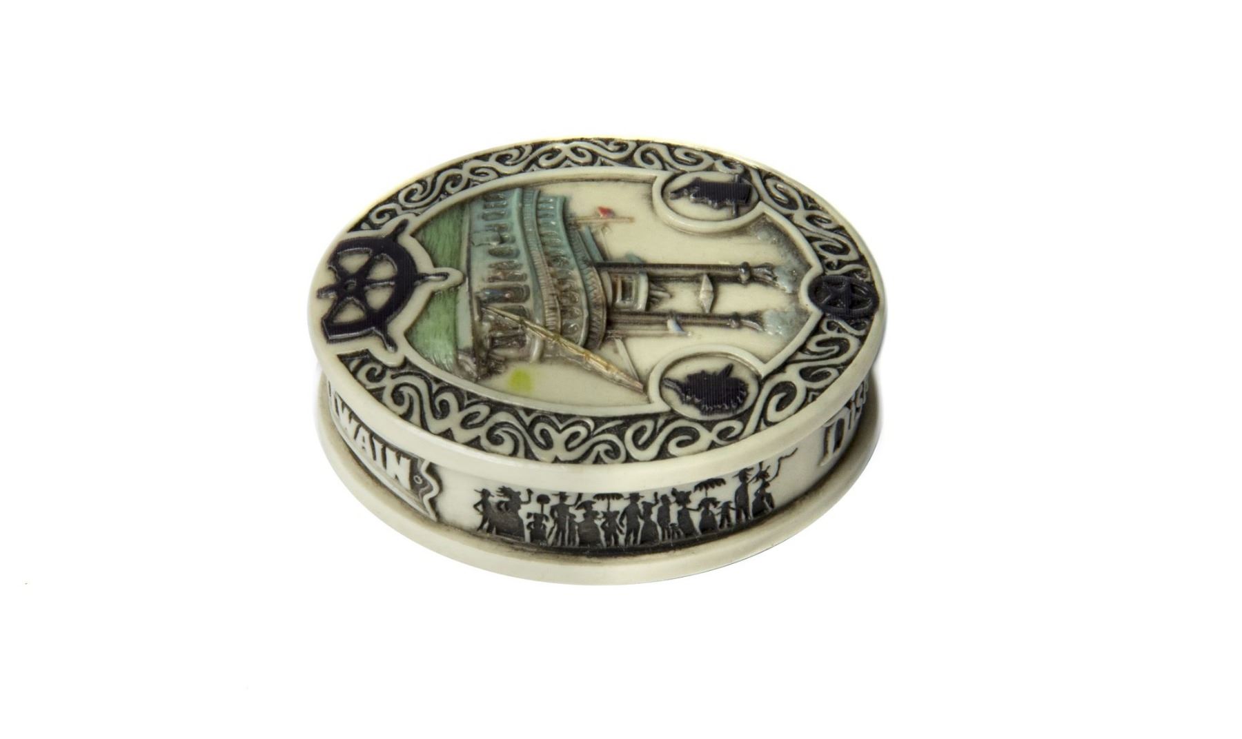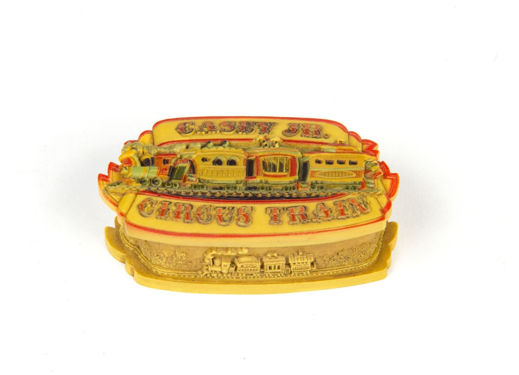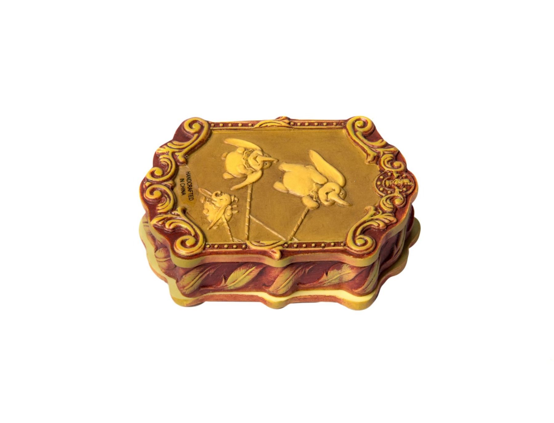(Disneyland, c.2000s) A set of (9) Disneyland & Walt Disney World themed resin containers that were created as part of Olszewski's PokitPals collection of small trinket boxes. These small boxes each have a lid or a drawer that is held in place by magnets, and the boxes are themed after popular park attractions including: Sleeping Beauty Castle, "Casey Jr. Circus Train", "Dumbo the Flying Elephant", "King Arthur Carrousel", "Disneyland R.R.", "Walt Disney World R.R.", "Country Bear Jamboree", "Jungle Cruise", and the "Mark Twain". The boxes range in size from 2"x2" to 2"x2.75". The condition is very good overall, and two of the trinket boxes come in their "The Art of Disney Theme Parks" packaging.