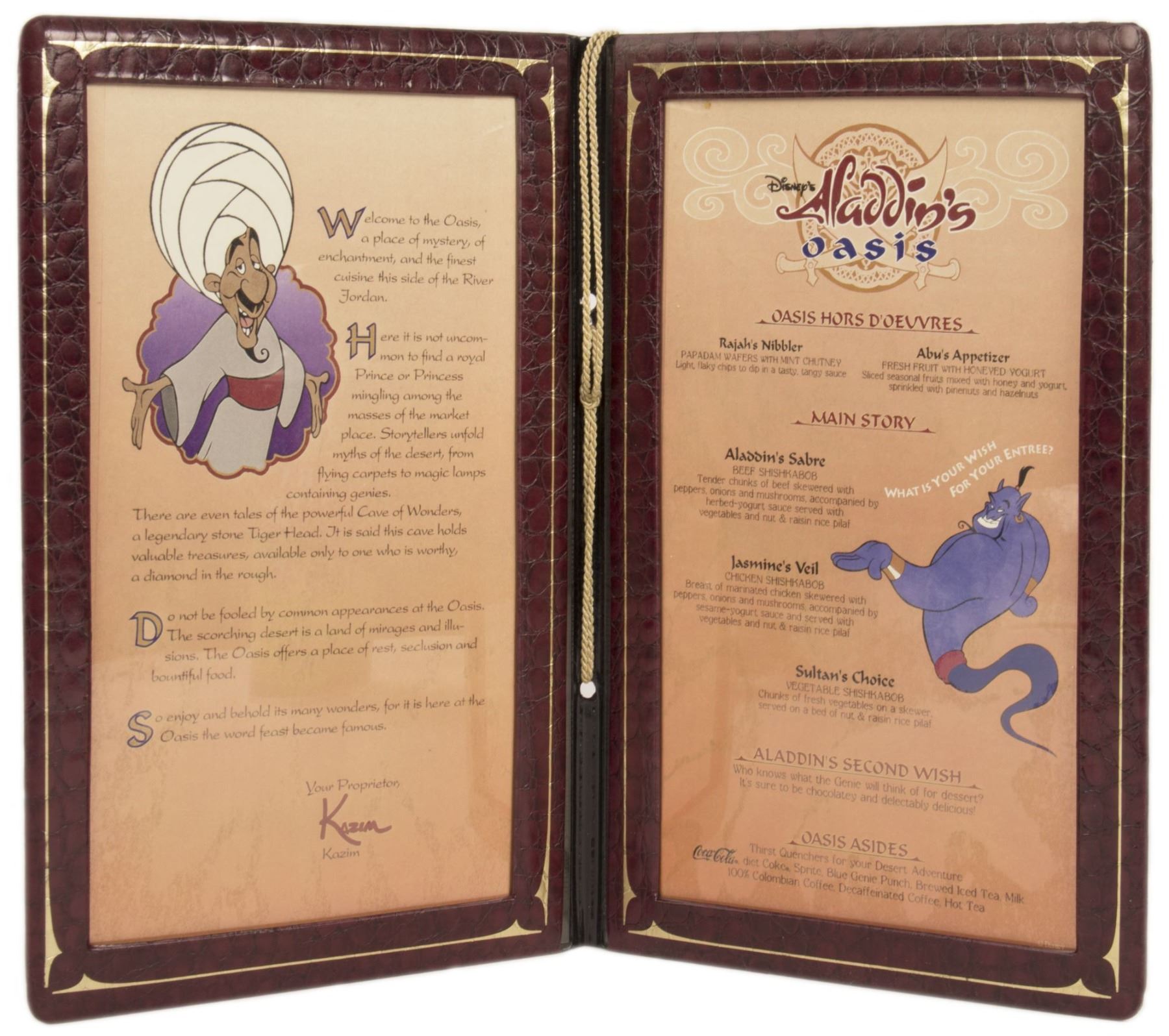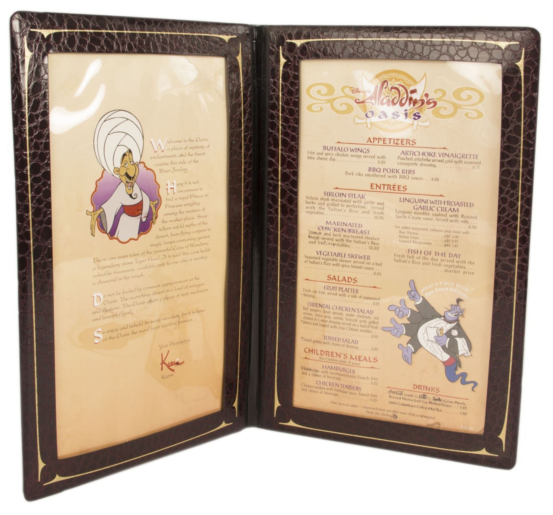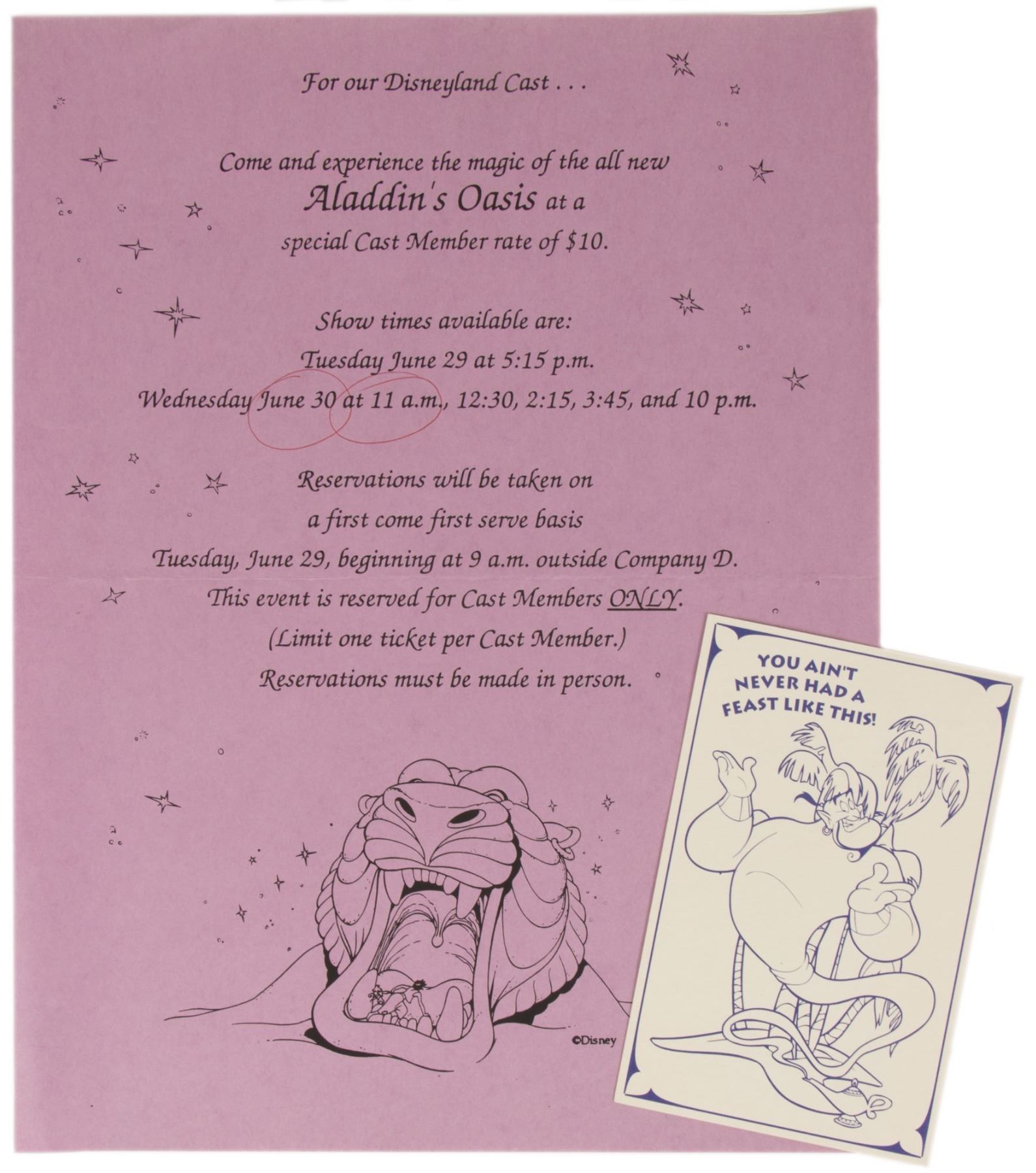 (Disneyland, c.1990s) A set of (3) Aladdin's Oasis menus with five additional paper items from the restaurant. The menus list the entrees and desserts from this popular location, and the set also includes two reservation cards, a promotional mailer, photo, and cast member invitation. The menus measure 10.5"x7" and 13.5"x9" and the set is in good condition overall with some moisture wear to the large menu and minor surface wear throughout.