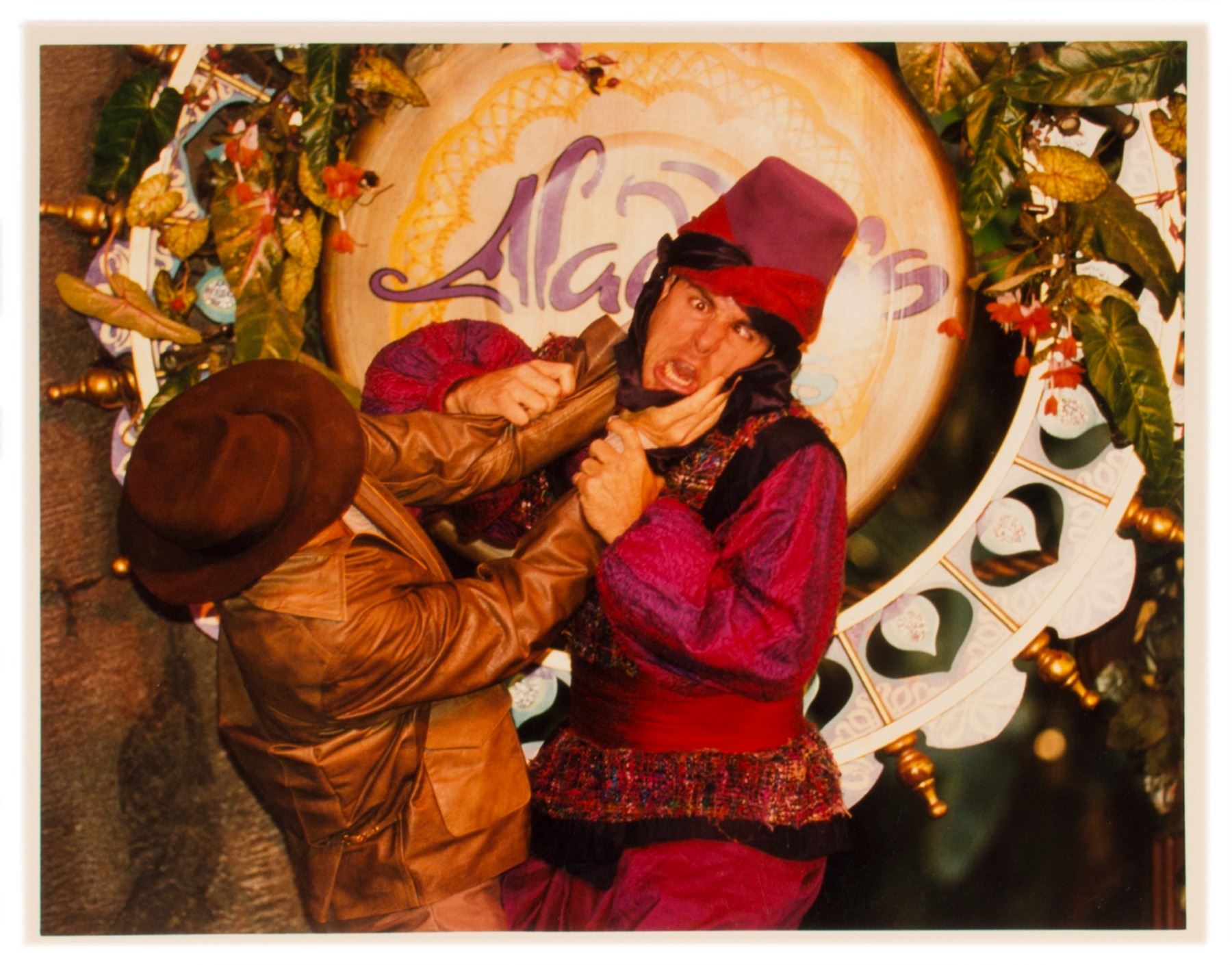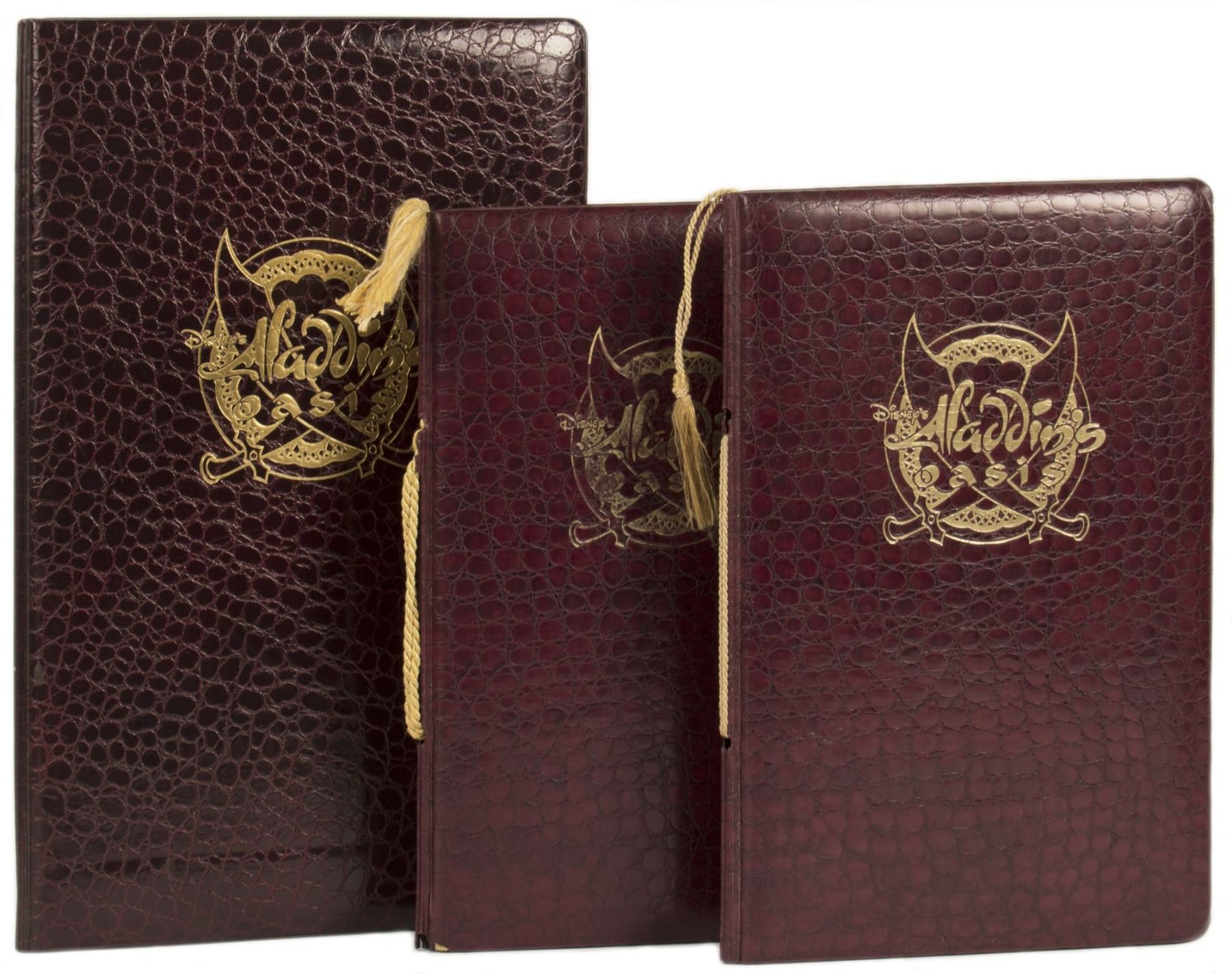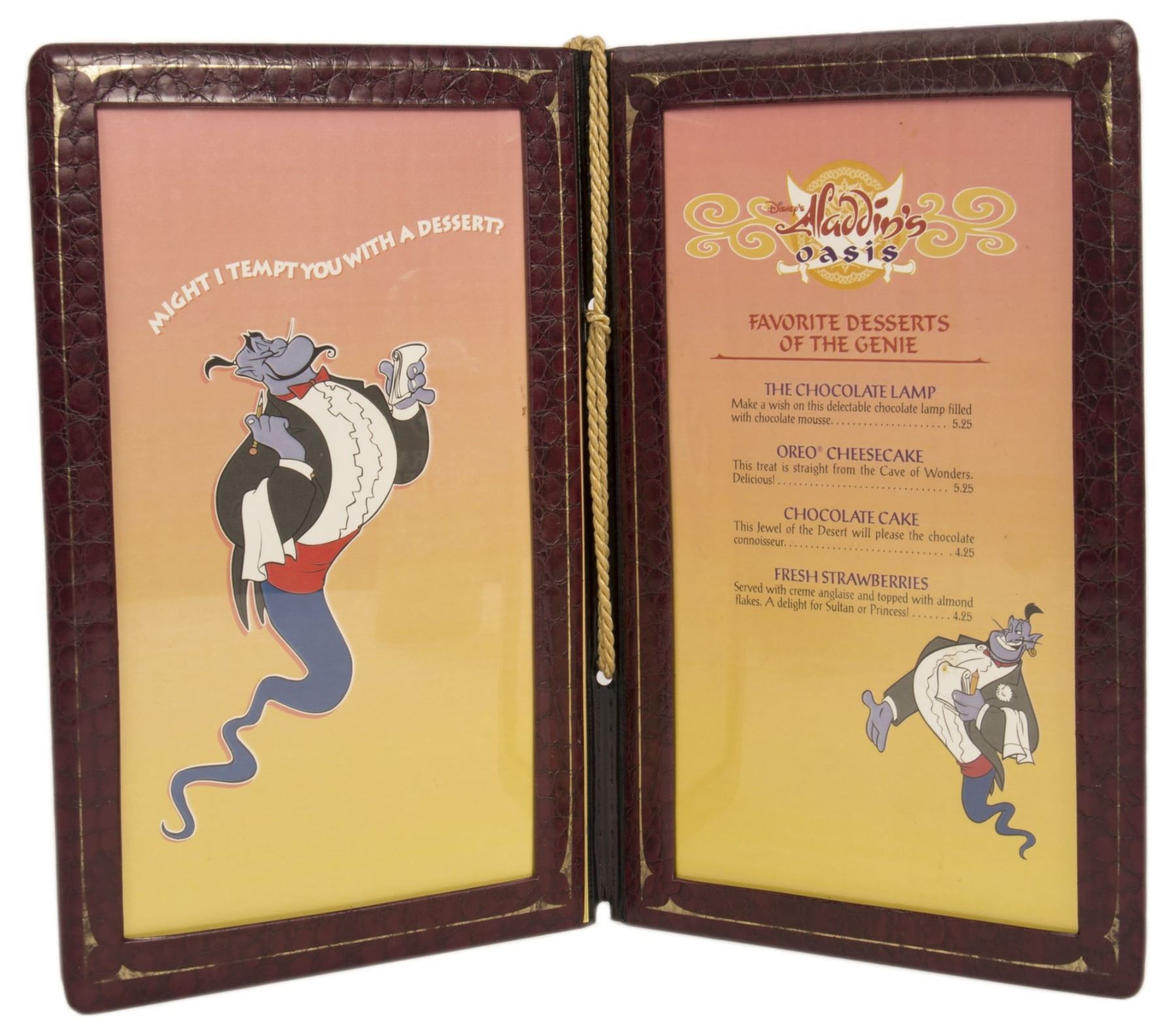 (Disneyland, c.1990s) A set of (3) Aladdin's Oasis menus with five additional paper items from the restaurant. The menus list the entrees and desserts from this popular location, and the set also includes two reservation cards, a promotional mailer, photo, and cast member invitation. The menus measure 10.5"x7" and 13.5"x9" and the set is in good condition overall with some moisture wear to the large menu and minor surface wear throughout.