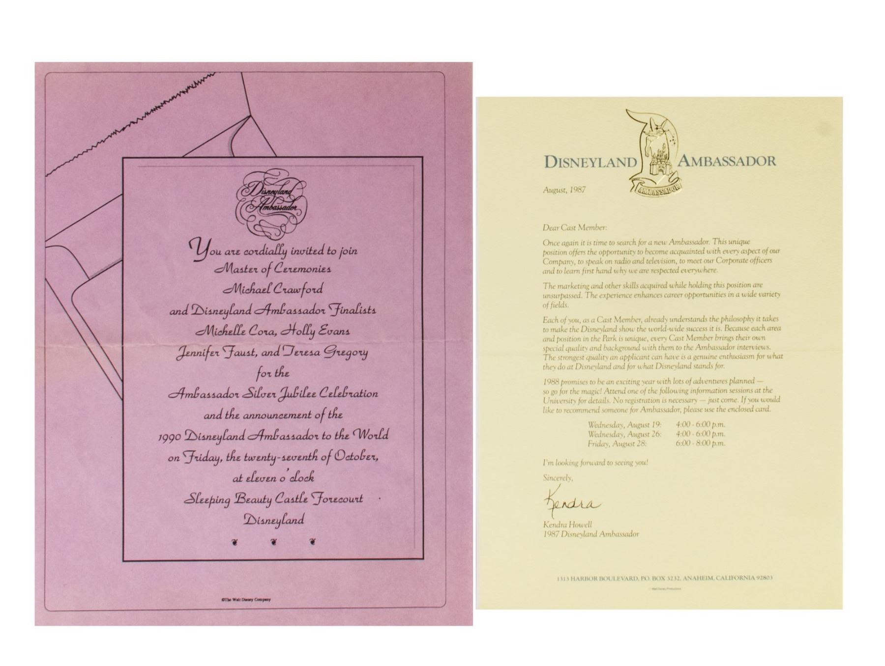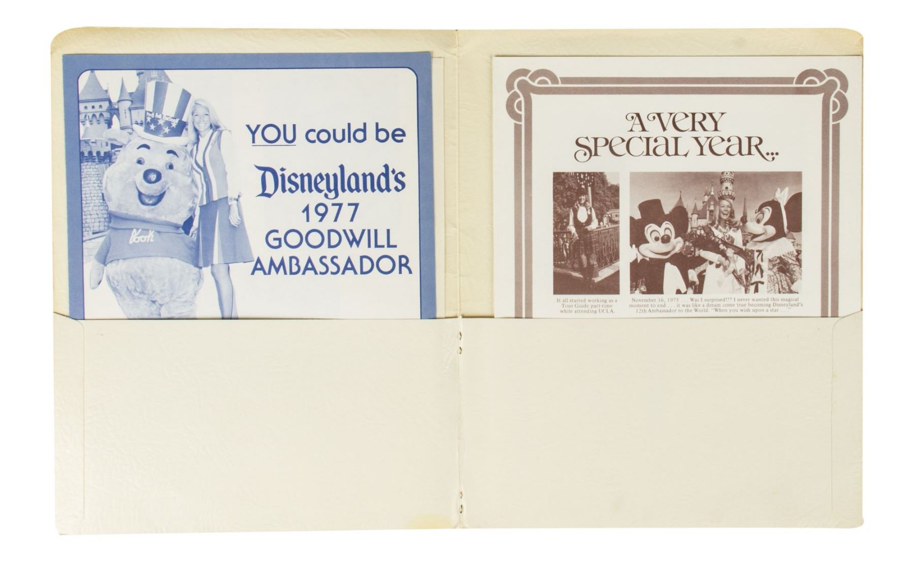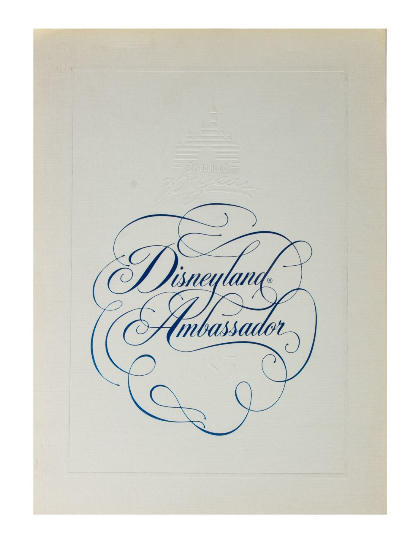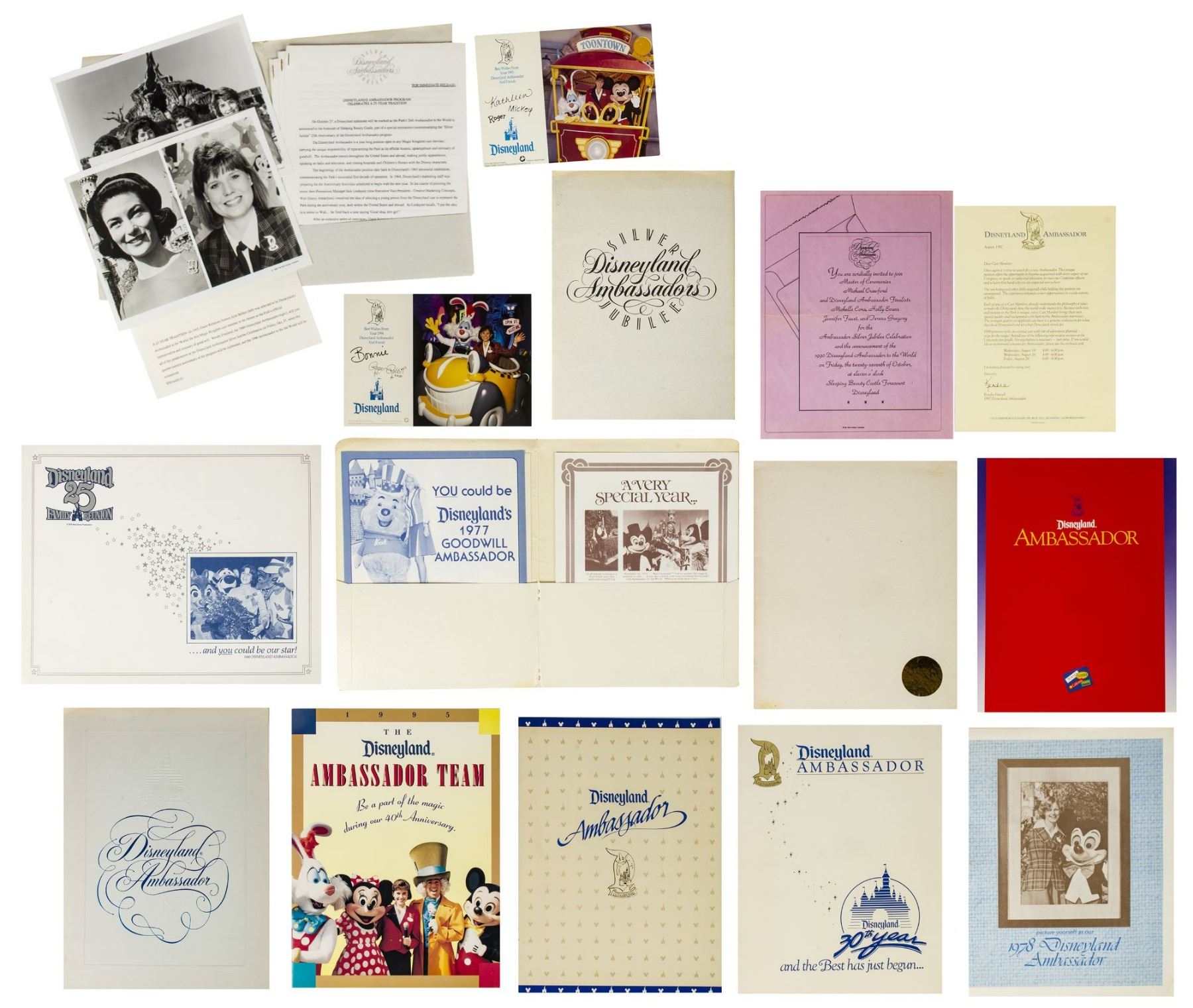 (Disneyland, 1978-95) A large collection of programs, invitations, press releases, and other promotional documents relating to the long-standing tradition of Disneyland Ambassadors. The first Disneyland Ambassador was Julie Reihm in 1965, and since the park's Tencennial Celebration, new Ambassadors have been selected every year. This collection includes (7) brochures with information on the Ambassador Program that encourages the reader to considering becoming a Disneyland Ambassador, (2) Toontown Ambassador photo cards, a Disneyland Ambassador cast member recommendation form with a letter, list of requirements, and the original envelope, an invitation to the Ambassador Silver Jubilee Celebration, a Disneyland Ambassador Silver Jubilee press kit, and a brochure and mail in form for the Ambassador Program from Disneyland's 25th Anniversary. The majority of the documents measure either 11"x8.5" or 12"x9", and the condition is very good overall with minor edge-wear.