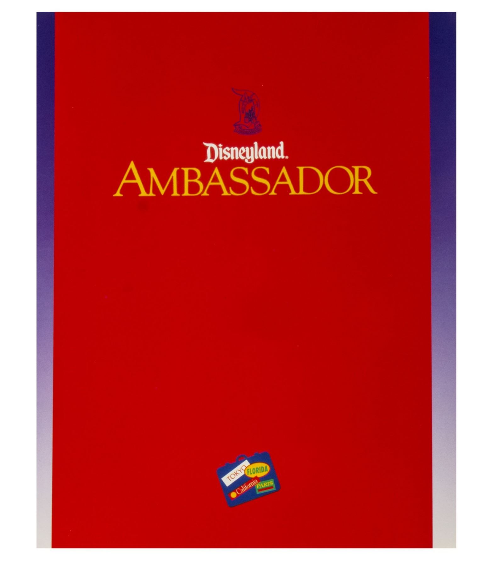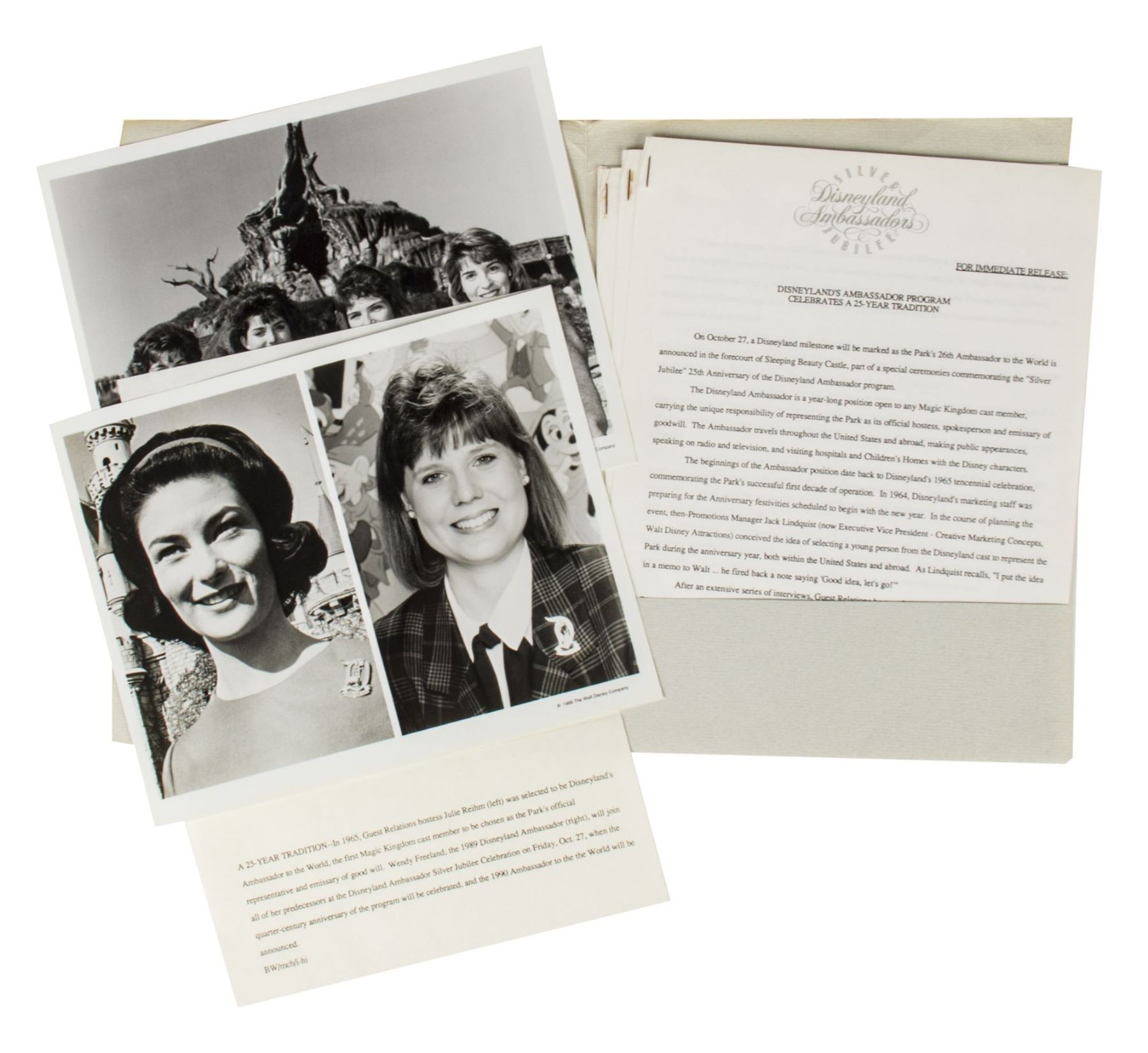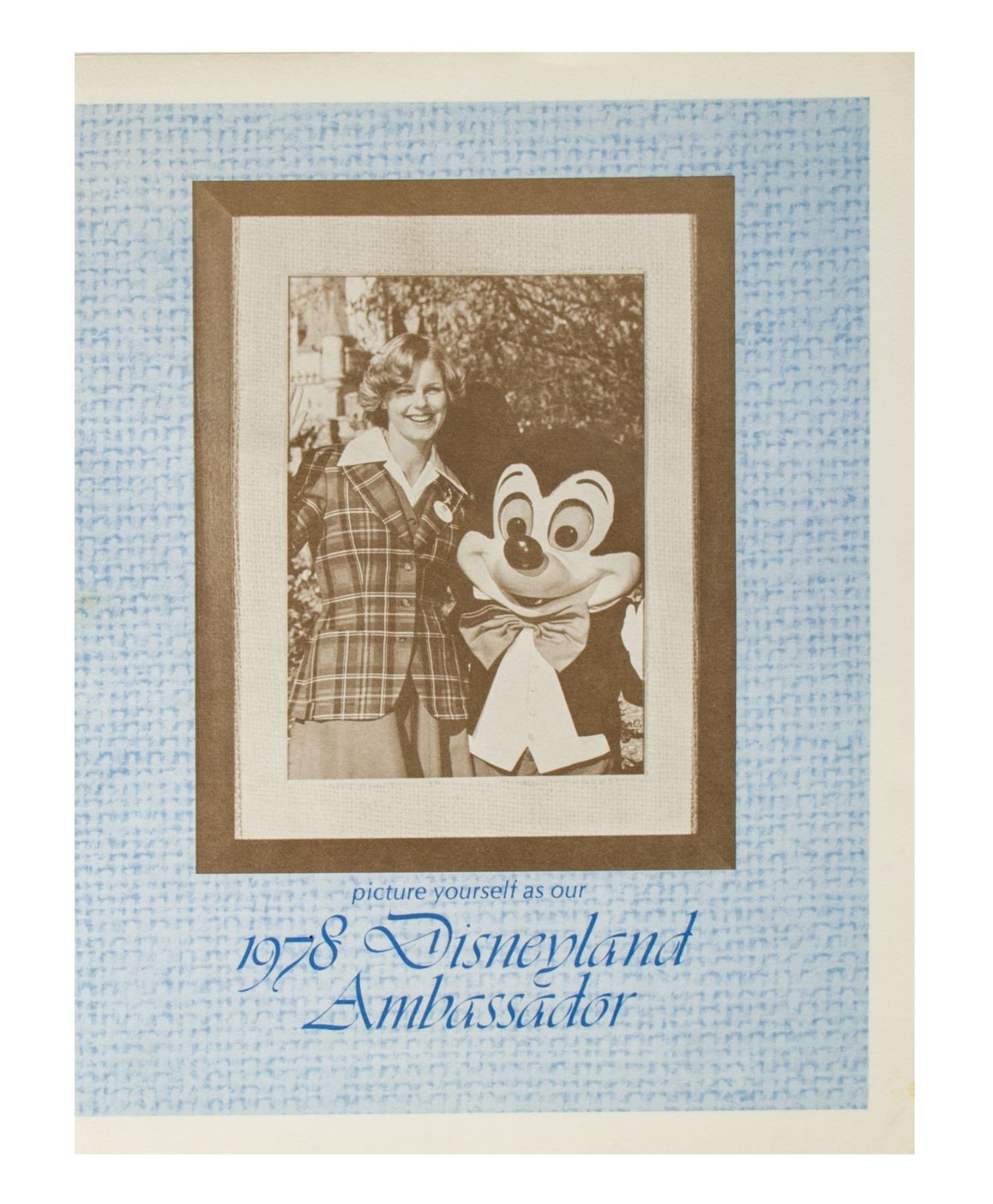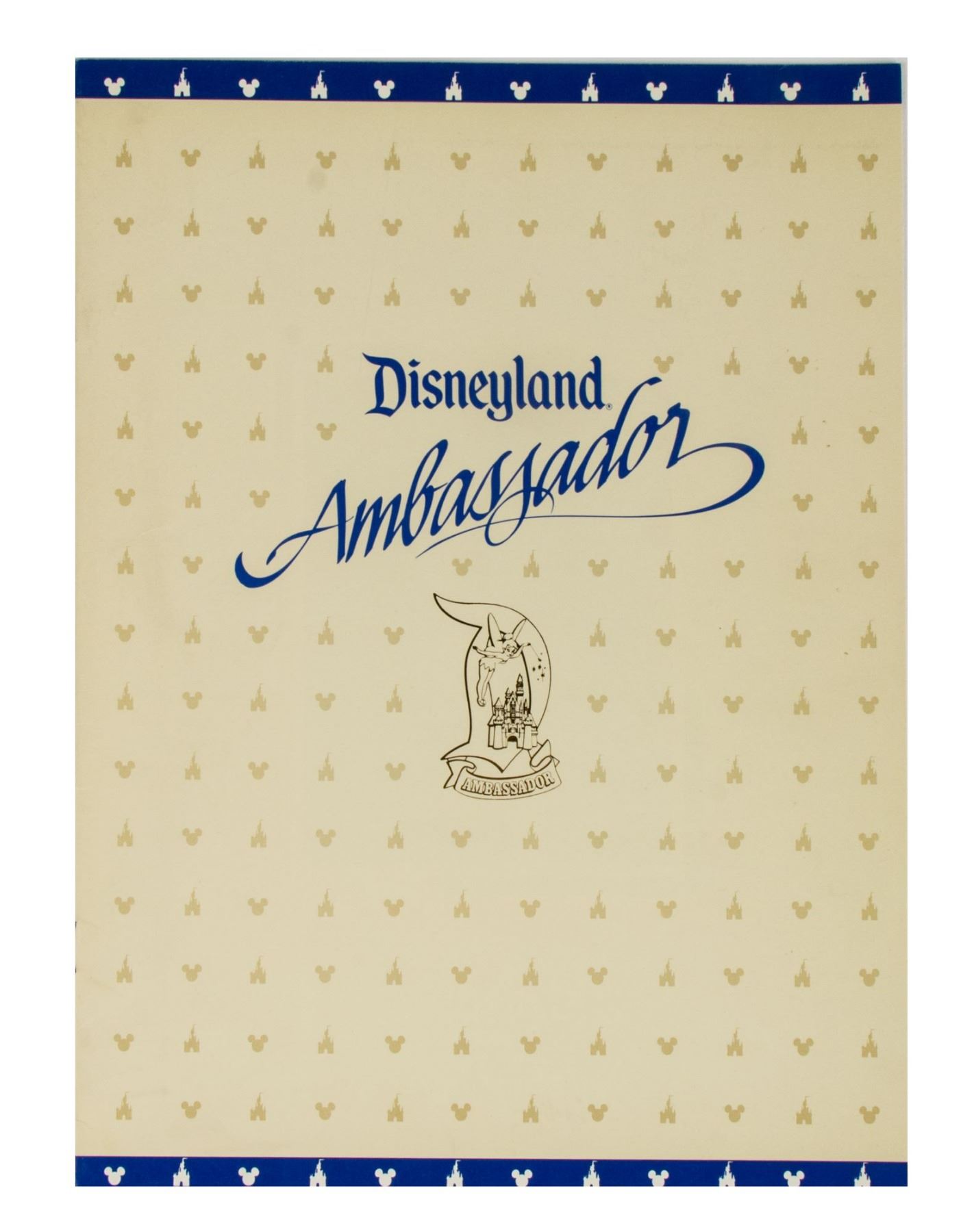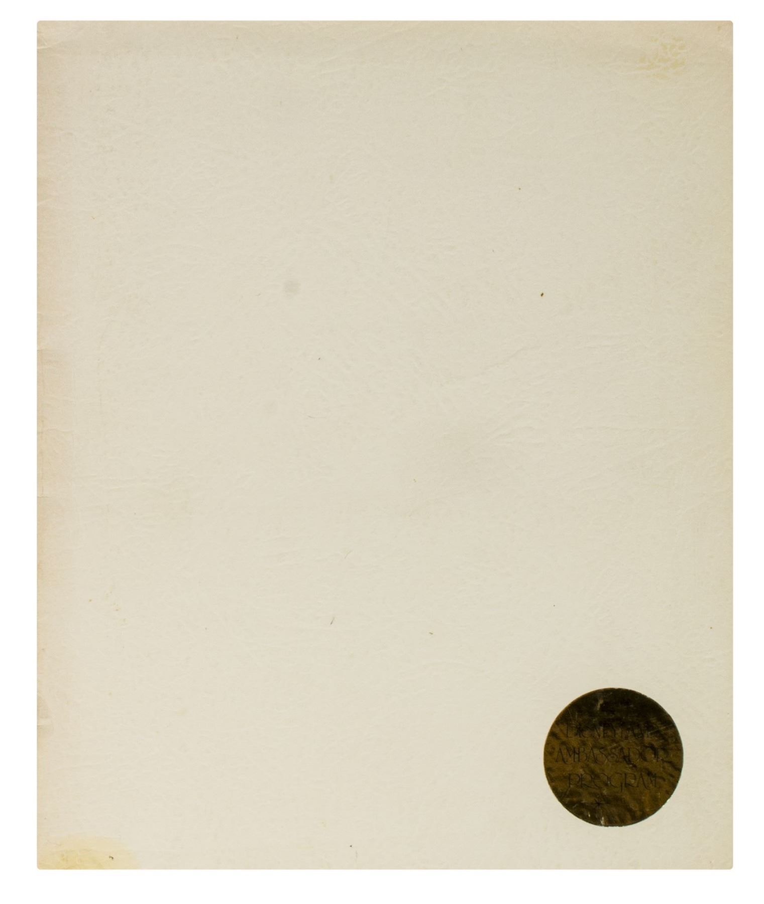 (Disneyland, 1978-95) A large collection of programs, invitations, press releases, and other promotional documents relating to the long-standing tradition of Disneyland Ambassadors. The first Disneyland Ambassador was Julie Reihm in 1965, and since the park's Tencennial Celebration, new Ambassadors have been selected every year. This collection includes (7) brochures with information on the Ambassador Program that encourages the reader to considering becoming a Disneyland Ambassador, (2) Toontown Ambassador photo cards, a Disneyland Ambassador cast member recommendation form with a letter, list of requirements, and the original envelope, an invitation to the Ambassador Silver Jubilee Celebration, a Disneyland Ambassador Silver Jubilee press kit, and a brochure and mail in form for the Ambassador Program from Disneyland's 25th Anniversary. The majority of the documents measure either 11"x8.5" or 12"x9", and the condition is very good overall with minor edge-wear.